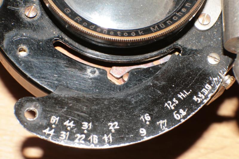 Danke, perfekter Tip! Habe - ist jetzt auch schon ein Weilchen her - nach dem Wollensak Double Valve Automatic geforscht - und irgendwo ein Bild von genau so einem Exemplar gesehen wie meinem, einschließlich des Auslöserkabels, irgendwo gab's als Zeitangabe "1900-08". Natürlich ohne die "Verzierungen", die Rodenstock angebracht hat, also Beschriftung Zeiteinstellrad und Schild der Blendeneinstellung. Vielleicht war's im Wollensak Lenses and Shutters Catalog 1903 - den kann man bei Camera Eccentric sehen.