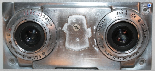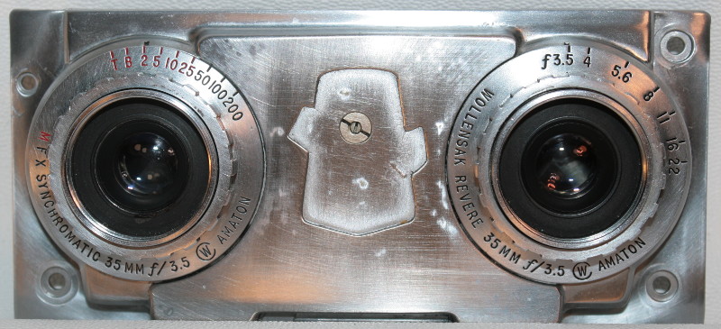 Habe kürzlich das Objektivbrett einer Stereokamera aus der Bucht gefischt. Sah ziemlich unansehnlich aus. Nach Putzen, Polieren und dem richtigen Einhängen von ein paar Federn funktioniert das Ganze wieder und ist ansehnlich: (das 'unordentliche' Kabel ist für den Blitzkontakt) Das Teil wurde - z.T. mit unterschiedlicher Objektivausstattung - bei zwei unterschiedlichen Kameramarken eingesetzt, hier gab's beide: Wollensak 33 Film 3-D Stereo Camera mit f3.5 35mm Amaton bzw. Revere 33 Film 3-D Stereo Camera mit f3.5 35mm Amaton. Habe zugelernt - Wollensak war die 'Luxusmarke' von Revere "wie bei Lexus und Toyota". Die Logos beider Marken haben denselben Umriß, sodaß beide in dieselbe Vertiefung passen.