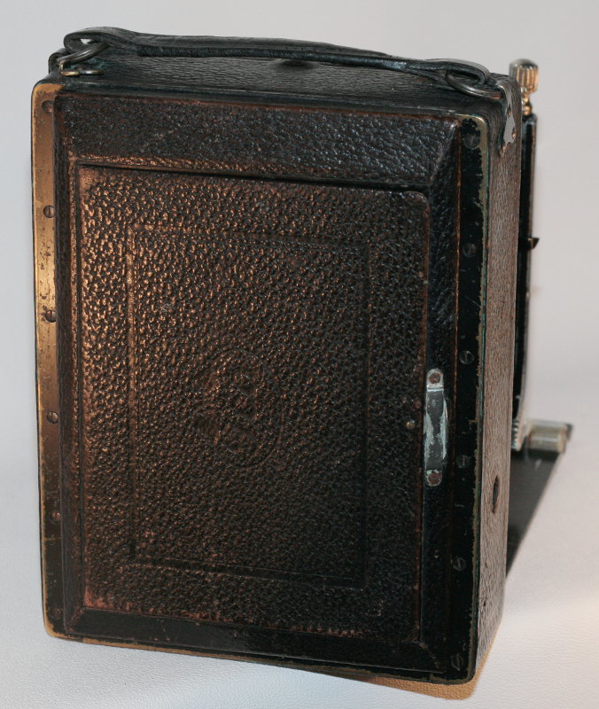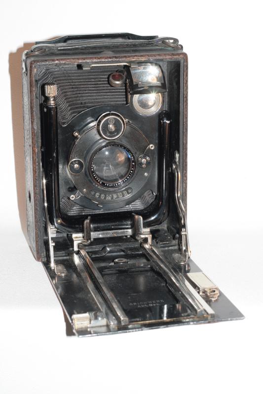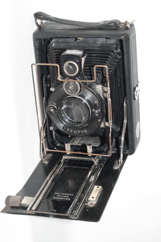 Nach Aussehen und Haptik müßte es sich um eine ältere Kamera handeln, ihr Compur und auch ihr Sytar dürften später hinzugekommen sein. Ich halte diese Kamera "mit dem Knopf für's Seitverstellrädchen" für eine Orionwerk Orion (vielleicht das namansgebende Modell..), habe aber keine Bestätigung. Ein Bild von ihr: Der Mattscheibenhalter fehlt, im Bild habe ich ein - technisch passendes - ICA Trona-Rückteil montiert. Man sieht die hinten seitlich und unten laufenden Messingleisten: