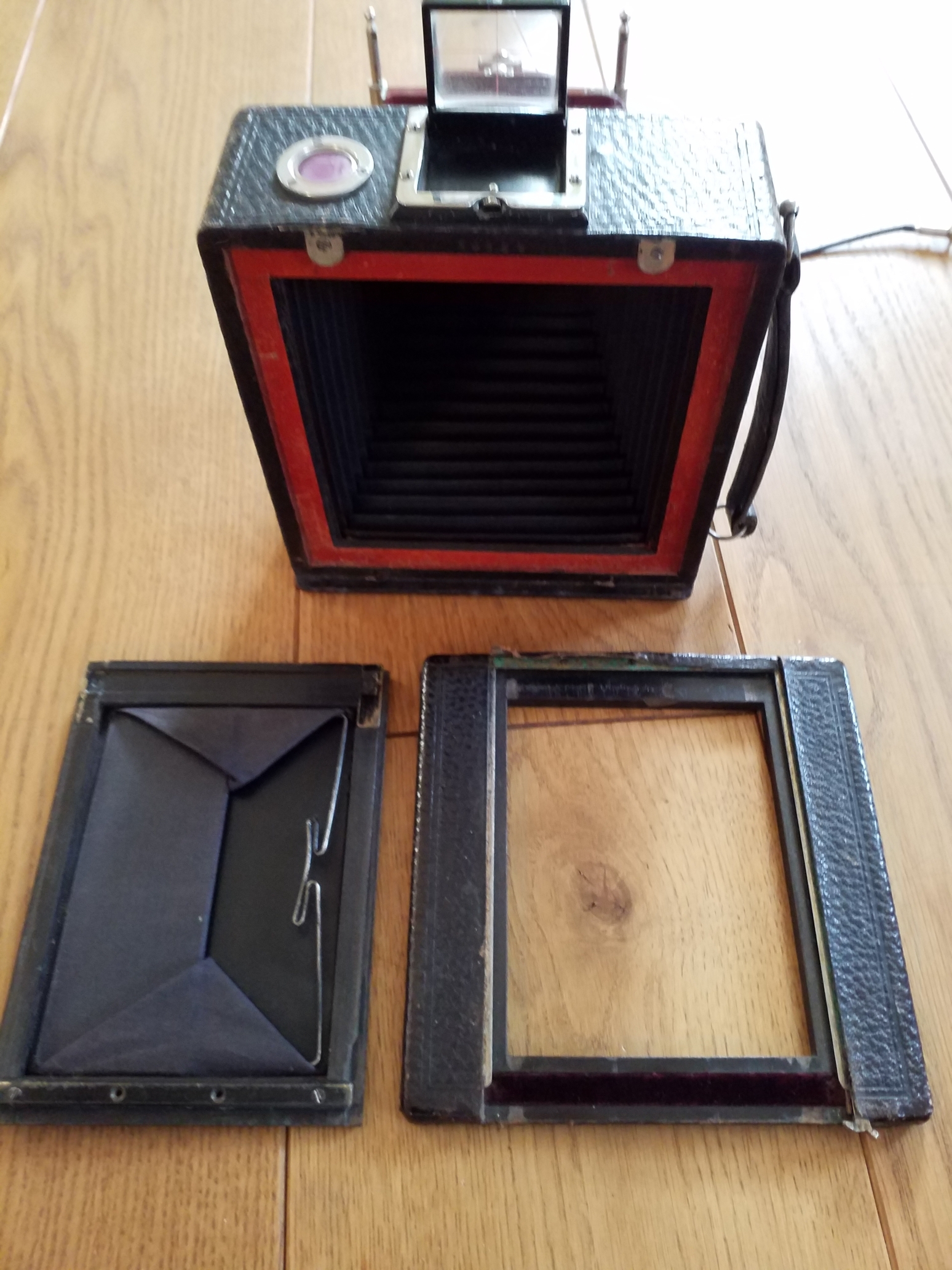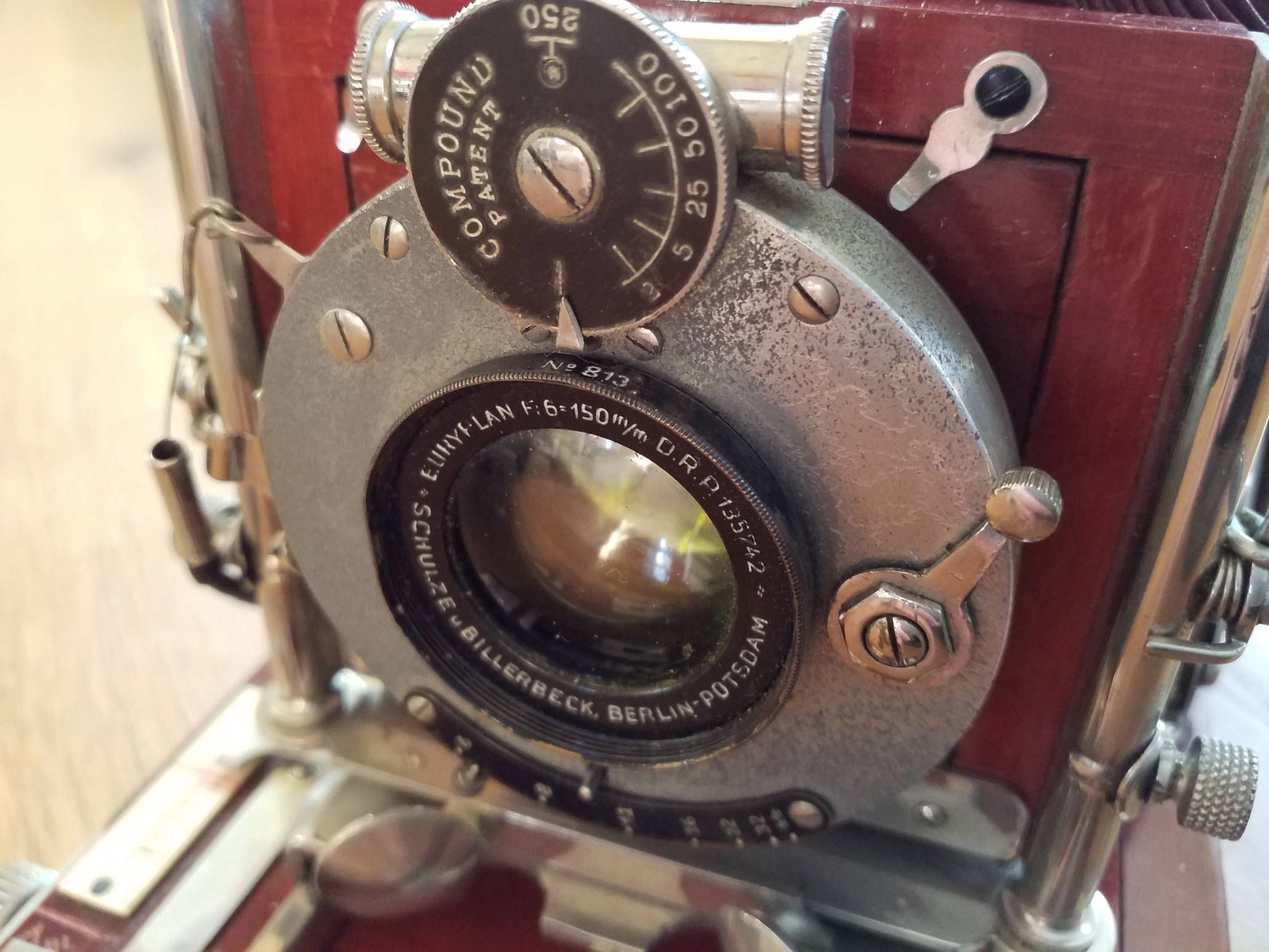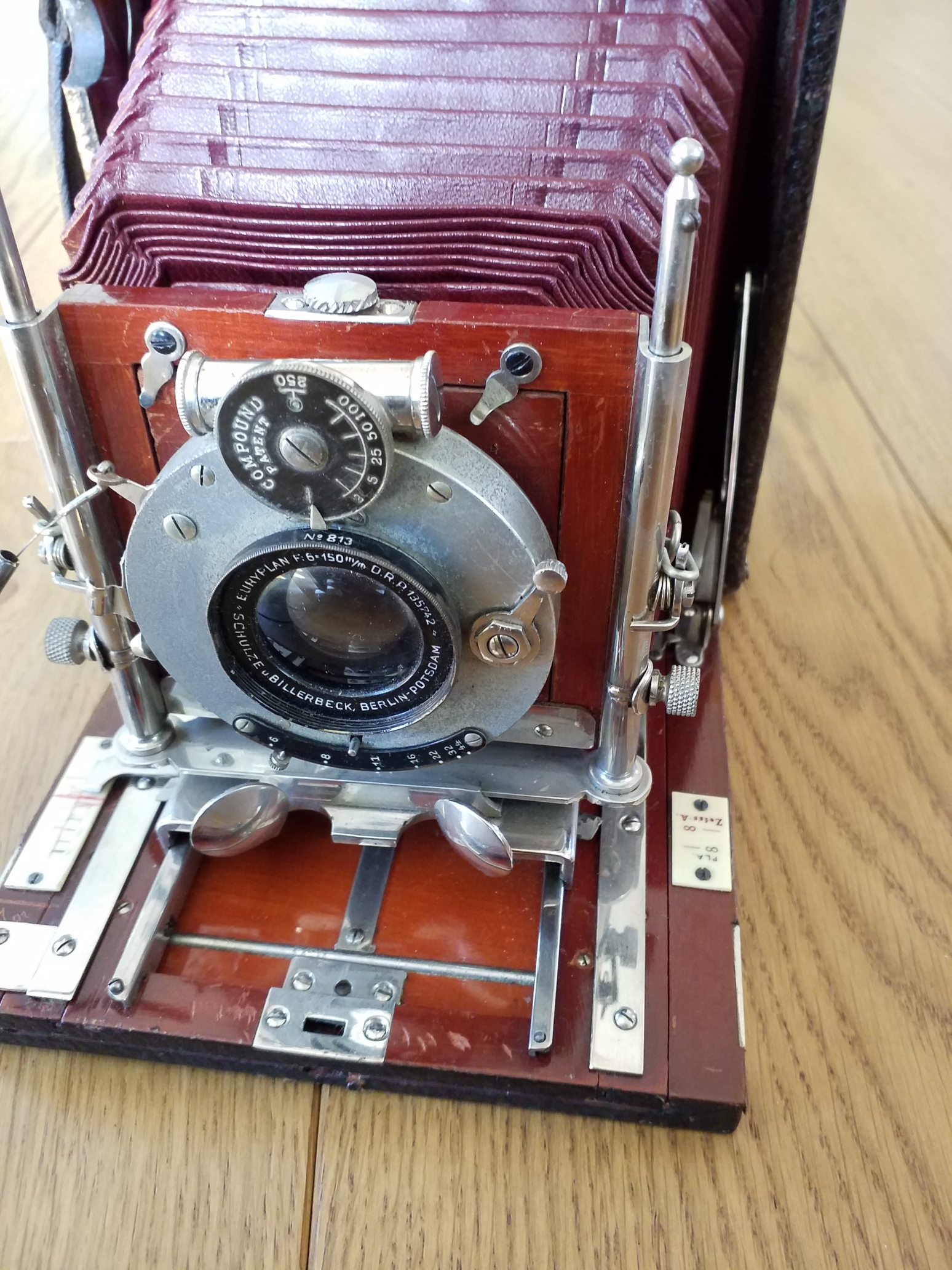Rainer, Danke für dein Tipp. Leider sind keinerlei Hinweise auf der Kamera zu finden , typisch war dieser Stern am Sucher oben . Der Compure Verschluss ist entweder auf Kundenwunsch von (Hüttig) verbaut wurden ? Hüttig und LIoyd hat später ihre Compure Verschlüsse auch gelabelt. Naja wie auch immer , ich vermute die Kamera ist direkt so auf Kundenwunsch gefertigt worden. Der Verschluss sieht nicht aus wie nachträglich eingebaut . Nach etwas Compure Pflege habe ich sogar den hängenden Zentralverschluss wieder gängig bekommen . Eine Frage , bekommt man noch passende Mattscheiben für den 9x12 Platteneinschub? Die ist leider bei der Kamera zerstört. Dann noch eine Frage , bekommt man die Belederung mit einer Art Lederfarbe wieder aufgefrischt ?