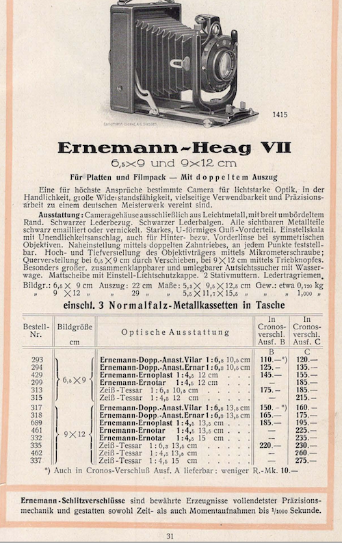Die Heag VII wurde in diversen Objektiv-Verschluss-Kombinationen angeboten; wie der Katalogausschnitt zeigt, waren das zumeist aber Ernemann- oder Zeiss-Objektive in Chronos- (später Cronos-) Verschlüssen. Ein Rodenstockobjektiv in Compur scheint daher zunächst ungewöhnlich. Der Compur selbst ist dabei weniger störend als das Fremdobjektiv jenseits des Zeiss-Imperiums.