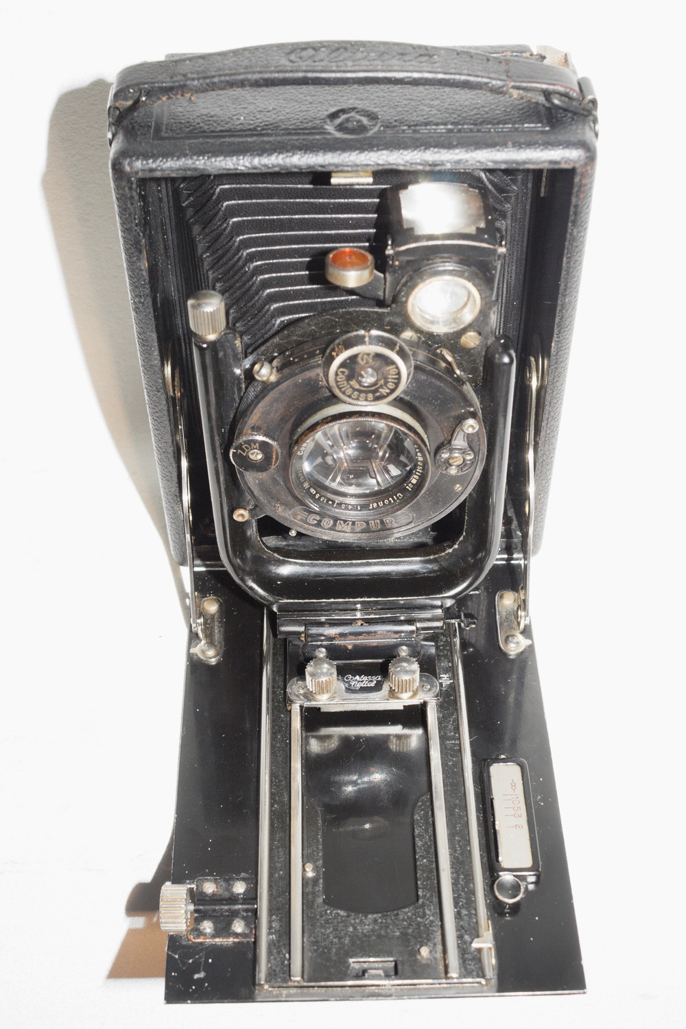 Ein paar Daten zur Kamera vermerke ich in der Beschreibung meiner Objektive. Leider fehlt das Baujahr der "abweichenden" Altura dort. Ihr Objektiv ist ein Contessa-Nettel Citonar #1901** in einem Compur von ca. 1927. Na gut, Compure wurden öfter ersetzt, und auch mal Objektive. Irgendwo in meiner recht großen Sammlung gesammelter Daten habe ich auch ein paar Anmerkungen zu diesem Modell. Ich meine, es war von 1924, kann mich aber täuschen. Jedenfalls nicht der letzte Jahrgang. Es war wohl ein mißglückter Versuch, den Namen auf ein neues Modell zu übertragen. Contessa-Nettel soll daraufhin wieder für kürzere Zeit das alte Modell wiederaufgenommen haben. Da ich das aber derzeit ohne die Sache nicht rechtfertigende Mühe verifizieren kann, habe ich auf die Angabe verzichtet.