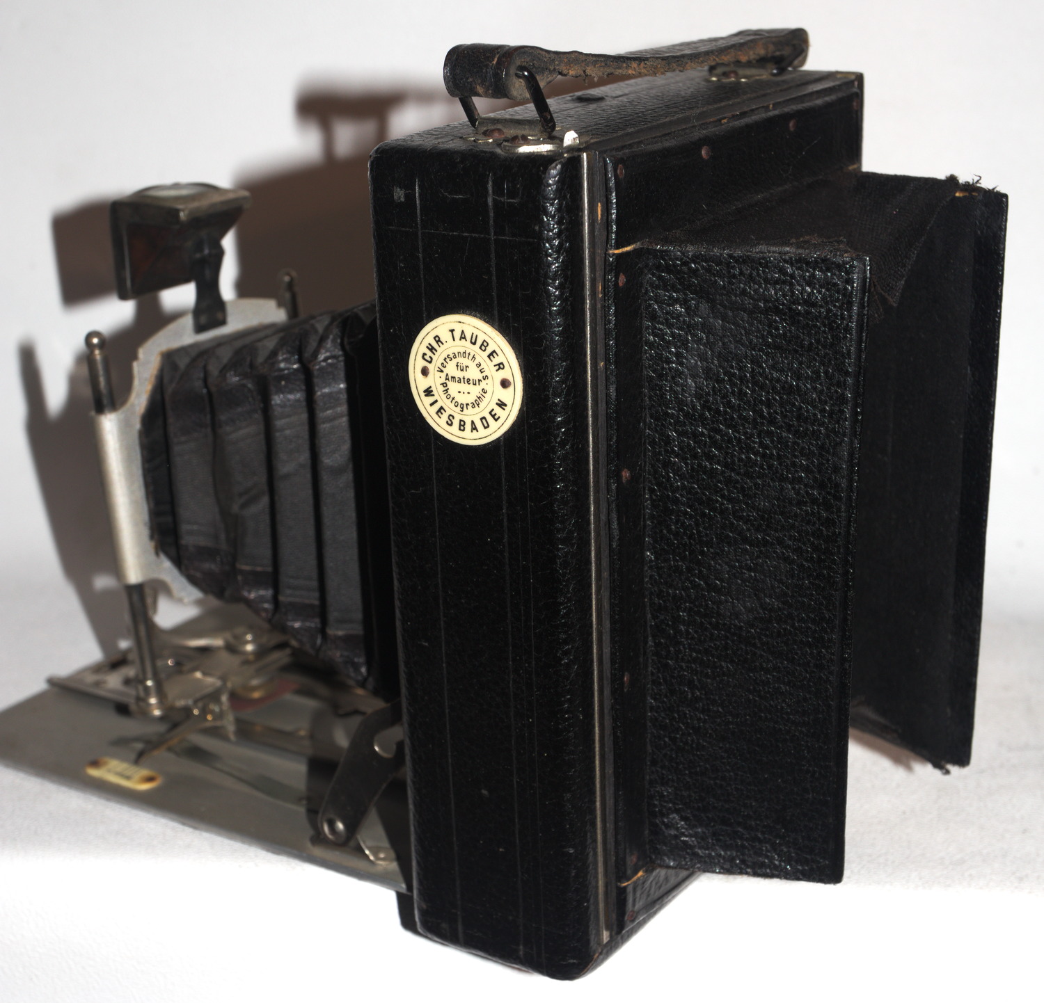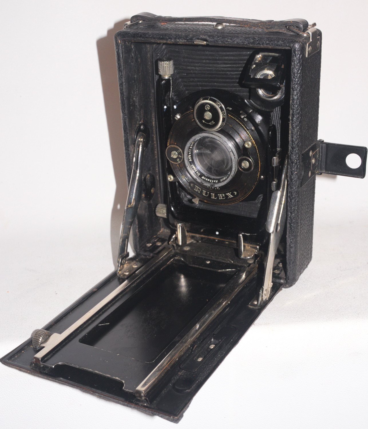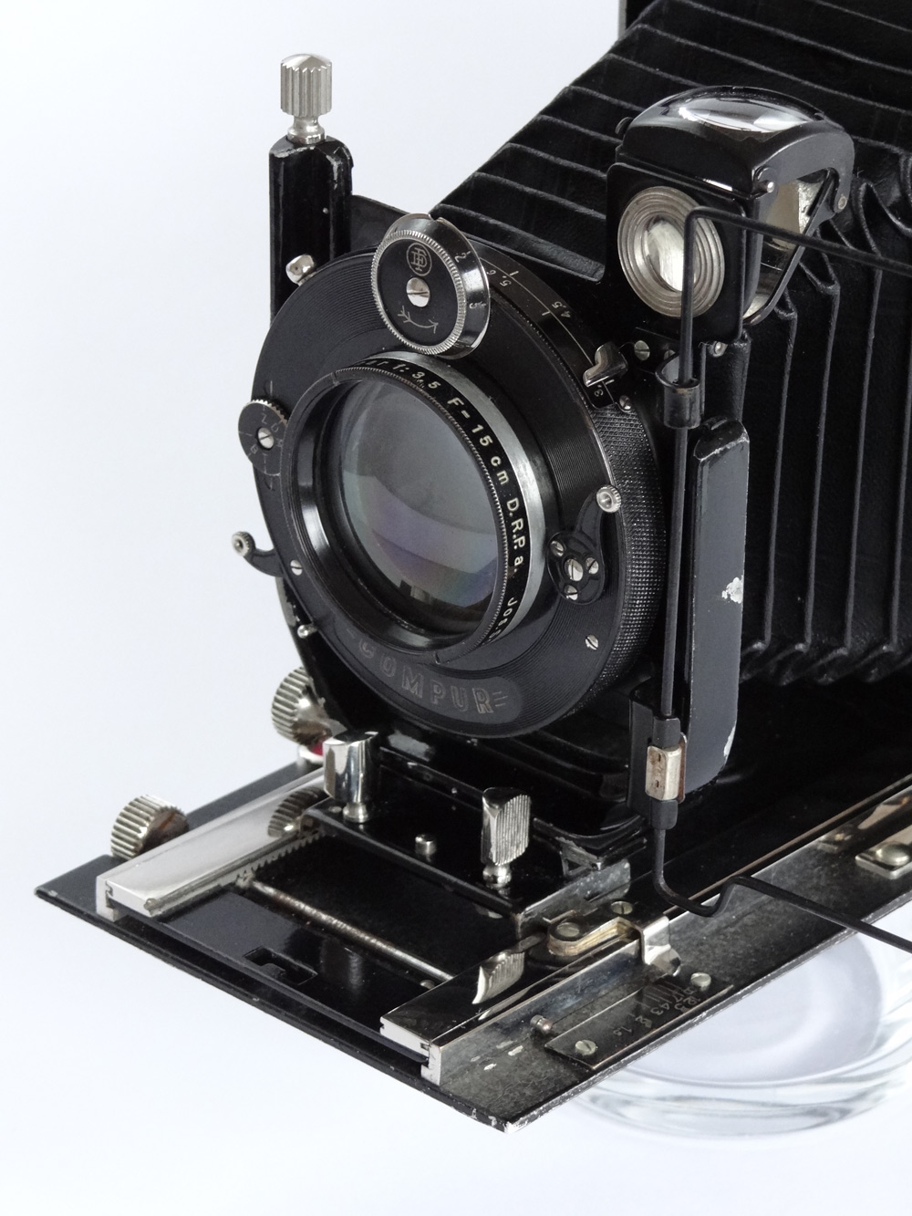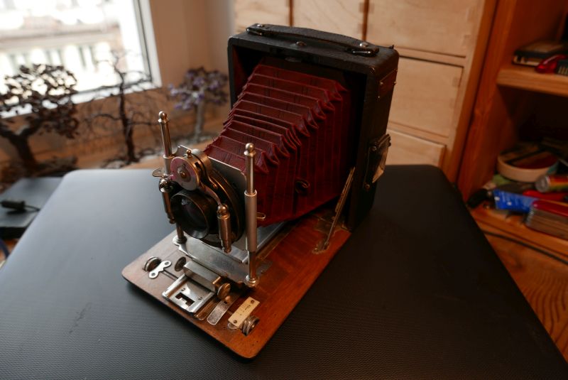 Die eine, verkauft vom Fotohaus Christian Tauber in Wiesbaden, halte ich für eine frühe Glunz: Die __Kameraliste_http-photographischebremen.org enthält eine von 1909, die passen würde - aber natürlich nur eine Zeile Text - aber Alu-Laufboden wird für Glunz erst viel später erwähnt. Das mitgekaufte Objektiv, ein interessantes, ganz kleines Detektiv-Aplanat (105er) von Ernemann, habe ich auf den Bildern nicht montiert - es ist sicher nicht original, ein 135er wäre nötig. Eines mit max. 27mm Anschraubgewinde fehlt mir aber ...