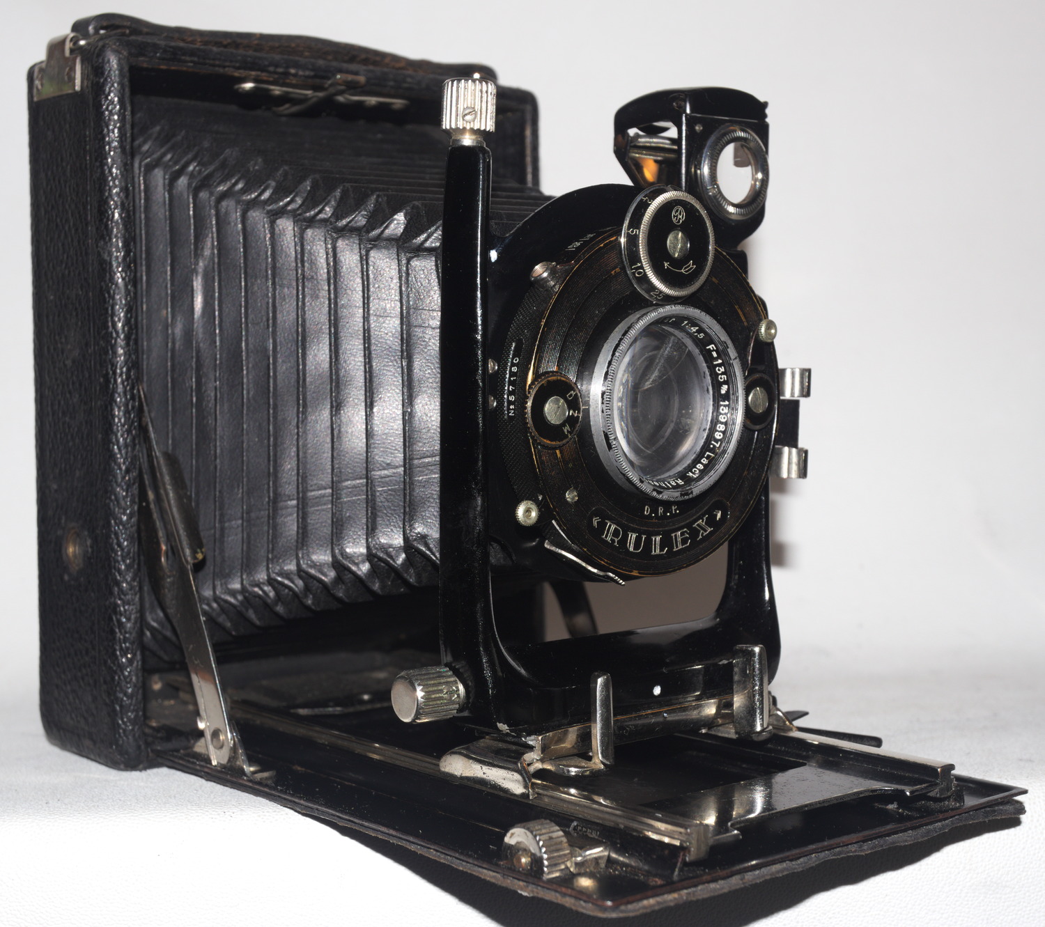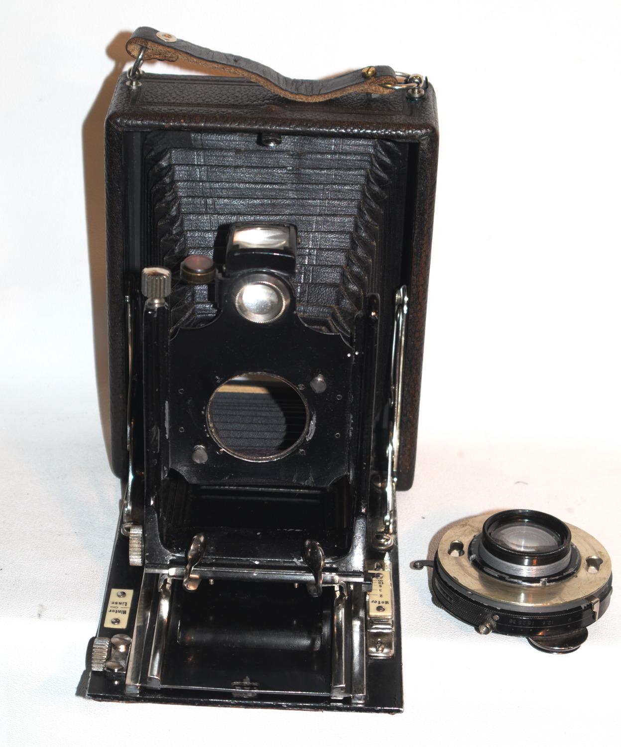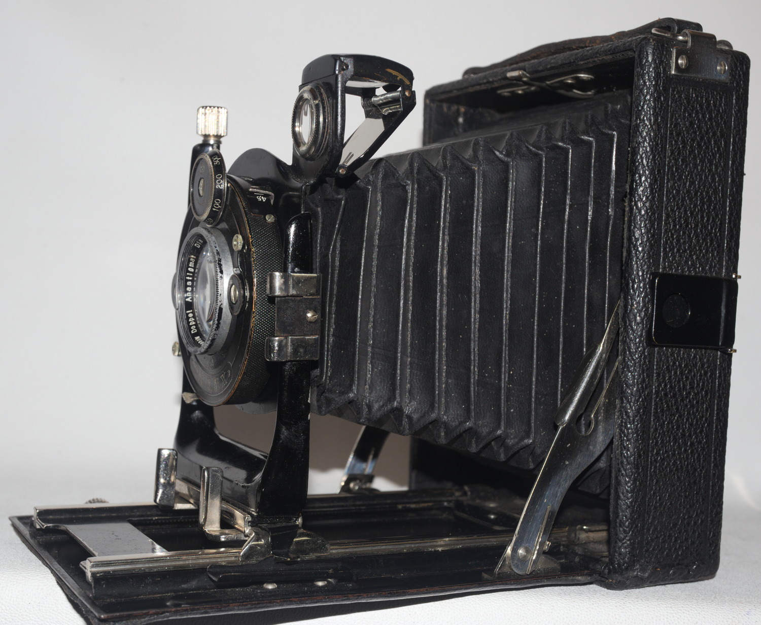 Die eine, verkauft vom Fotohaus Christian Tauber in Wiesbaden, halte ich für eine frühe Glunz: Die __Kameraliste_http-photographischebremen.org enthält eine von 1909, die passen würde - aber natürlich nur eine Zeile Text - aber Alu-Laufboden wird für Glunz erst viel später erwähnt. Das mitgekaufte Objektiv, ein interessantes, ganz kleines Detektiv-Aplanat (105er) von Ernemann, habe ich auf den Bildern nicht montiert - es ist sicher nicht original, ein 135er wäre nötig. Eines mit max. 27mm Anschraubgewinde fehlt mir aber ...