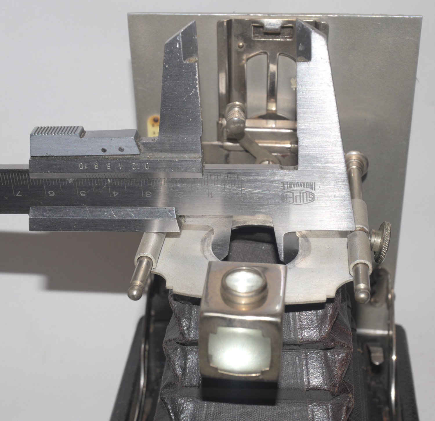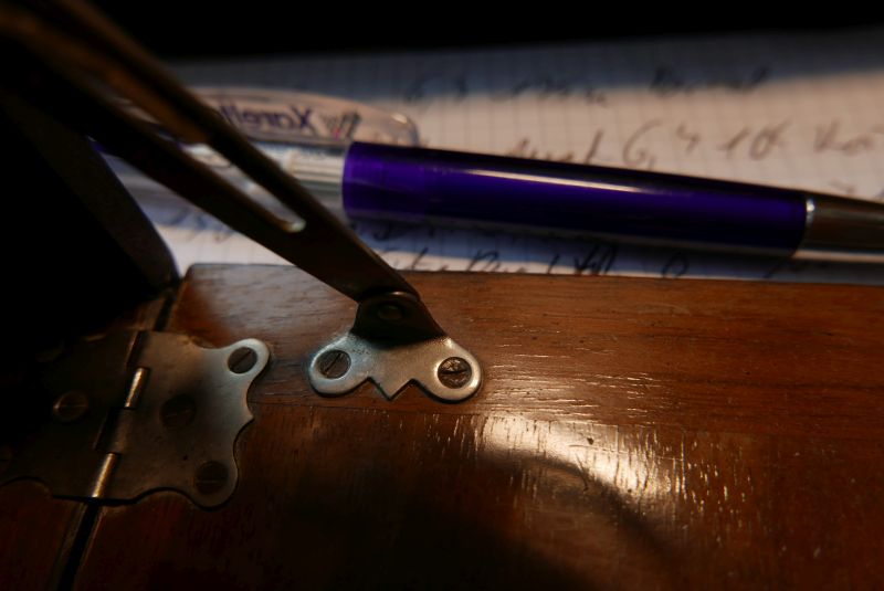 Die andere sieht mir am ehesten wie eine Wirgin aus: Die Kamera habe ich zum Ausschlachten gekauft - dafür war sie mir nach Inspektion zu schade. Den schönen Rulex-Verschluß brachte ich wieder auf Vordermann (war versottet, und deshalb war intern etwas durcheinandergeraten). Die obere, von vorn linke Spreizenhalterung ist allerdings irreführend - sie sollte so sein wie die auf der anderen Seite, von der kein Bild dabei ist - Basis ist nicht rund, sondern - naja, pardon - ein kurzes, schräg montiertes Rechteck, Oberfläche blankes Metall, dessen kurze Seiten halbkreisförmig sind (mein Darstellende-Geometrie-Lehrer hätte ein "Setzen, fünf" für diese Beschreibung gegeben). Grund: dieses Befestigungselement fehlte, da auf dieser Seite das Gehäuse gebrochen war (nach Kleben und beim ersten Montageversuch mit Holzschräubchen brach es nocheinmal an anderer Stelle. Ich hab's dann ähnlich gemacht wie ein Dentalchirurg, wenn er entzündete Zahnwurzelspitzen entfernt: Zahnfleisch aufklappen, Knochen aufschneiden ... hier: Bohrungen von innen mit Nadel nach außen durchstechen, an diesen Stellen Außenbezug eiin wenig kreuzweise einschneiden, aufklappen, Bohrungen von außen nach innen setzen, Vertiefungen für den Schraubenkopf machen, zwei M2-Metallschrauben von außen nach innen durch das Holz führen, innen anschrauben, Länge markieren, nochmal abschrauben, Schrauben kürzen, wieder anschrauben (diesmal mit montierter Spreize, sonst hätte ich den Laufboden abschrauben müssen).
