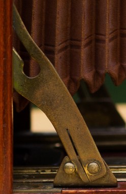 Der Clou ist, dass es, wie bei den anderen Firmen, viele Übergangsformen gibt. Deine Kamera hat Spreizen und Spreizenfedern wie sie bei der Merkel Metarsis oder Minerva vorkommen, gleichzeitig eine Griffaufhängung wie bei den einfachereren Merkels. Spreize und Spreizenfeder einer Merkel Minerva: