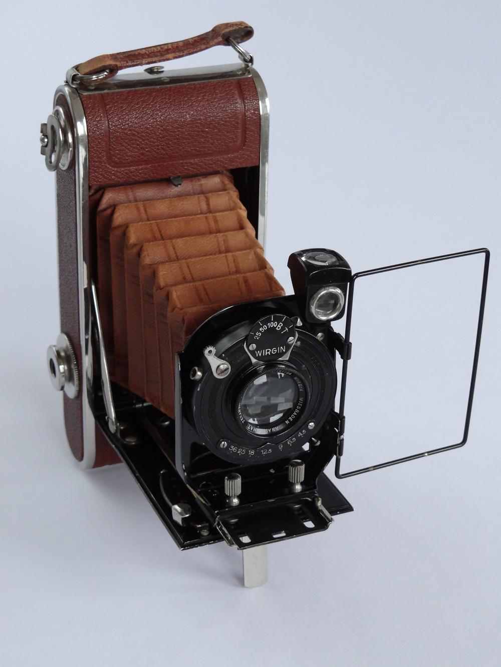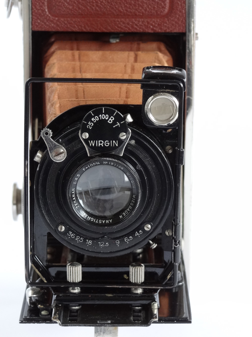 Zwei Wirgin Laufbodenkameras die ich im letzten Jahr kaufen konnte, möchte ich euch nicht vorenthalten. Da wäre zunächst die Spitzenausführung der Gewir mit Xenar 1:3,5 F=15 cm (264263) von ca. 1928 in einem Compur von ca. 1925 (nr. 621862). Die Camera ist in einem sehr guten Zustand. Die Libelle ist noch völlig in Ordnung. Ich habe drei Teile einer anderen Gewir getauscht. Den Diopter, das Mattscheibenrückteil und den Tragegriff. Jetzt ist sie nahezu perfekt.