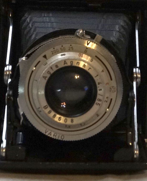 Zum einen ist es aus heutiger Sicht eine ganz normale schwarze (Zweiformat-)Auta, Gehäuseauslöser; aber mit einem sehr ungewöhnlichen und auffälligen Gauthier-Verschluß (Prägung AGC auf blanker Frontplatte). Zwei Verschlußblätter - Grenze in Ruhestellung waagrecht außermittig. Noch ungewöhnlicher: der Verschluß ist nicht selbstspannend. Nirgendwo finde ich eine Spur dieses Verschlusses. Anbei Bilder: