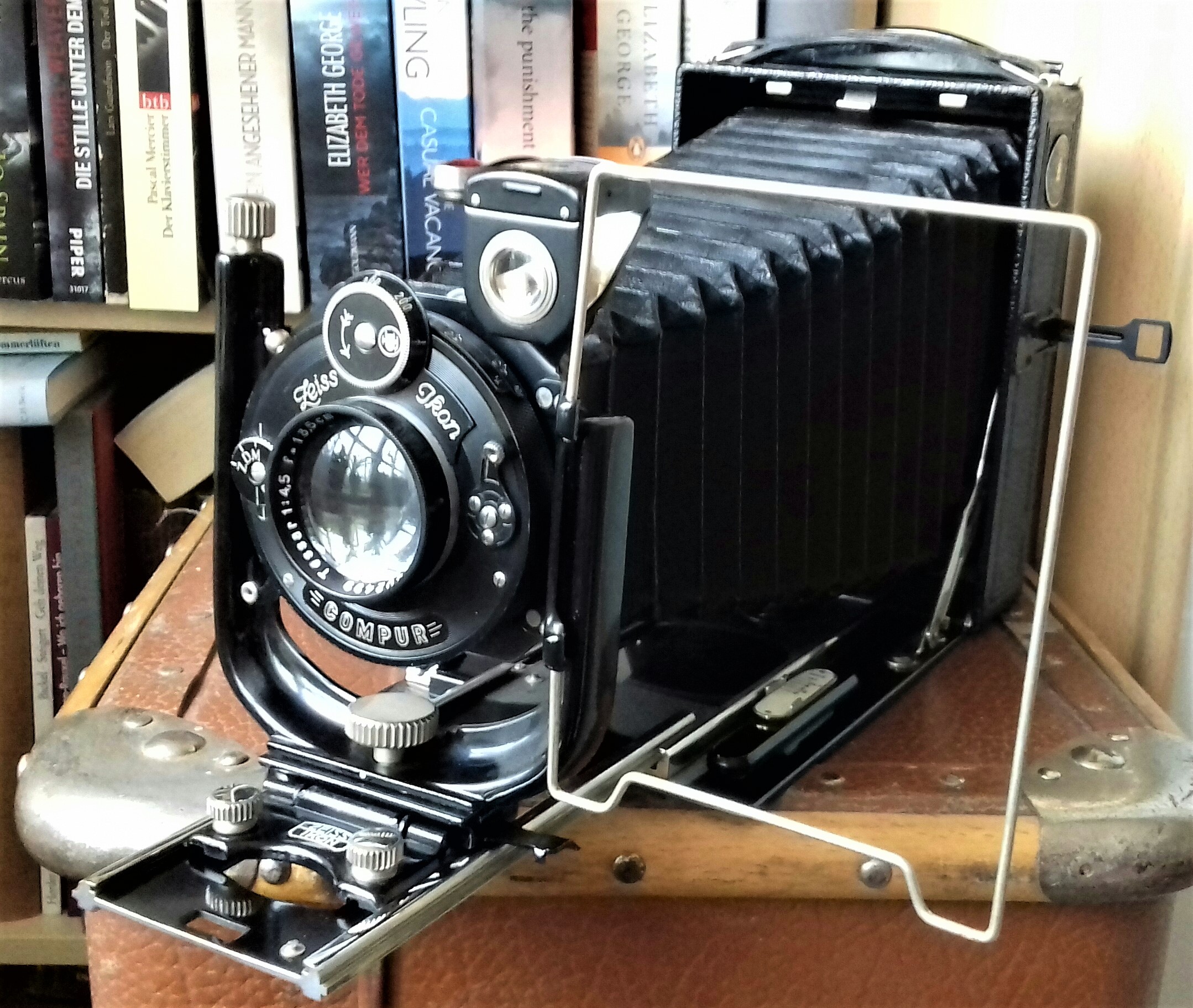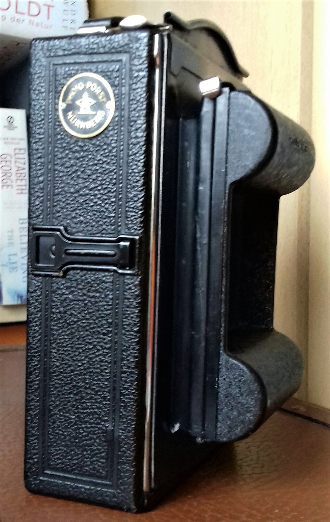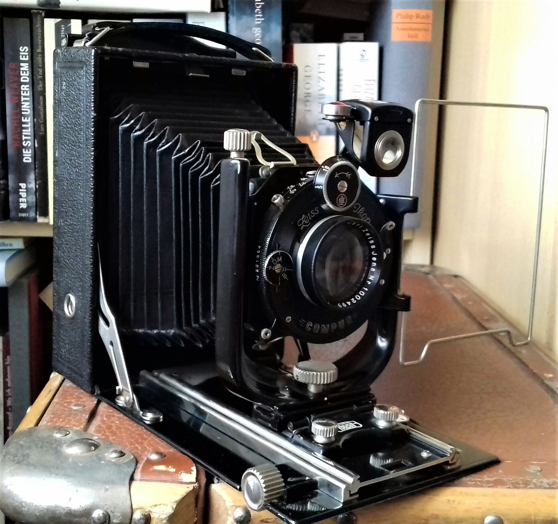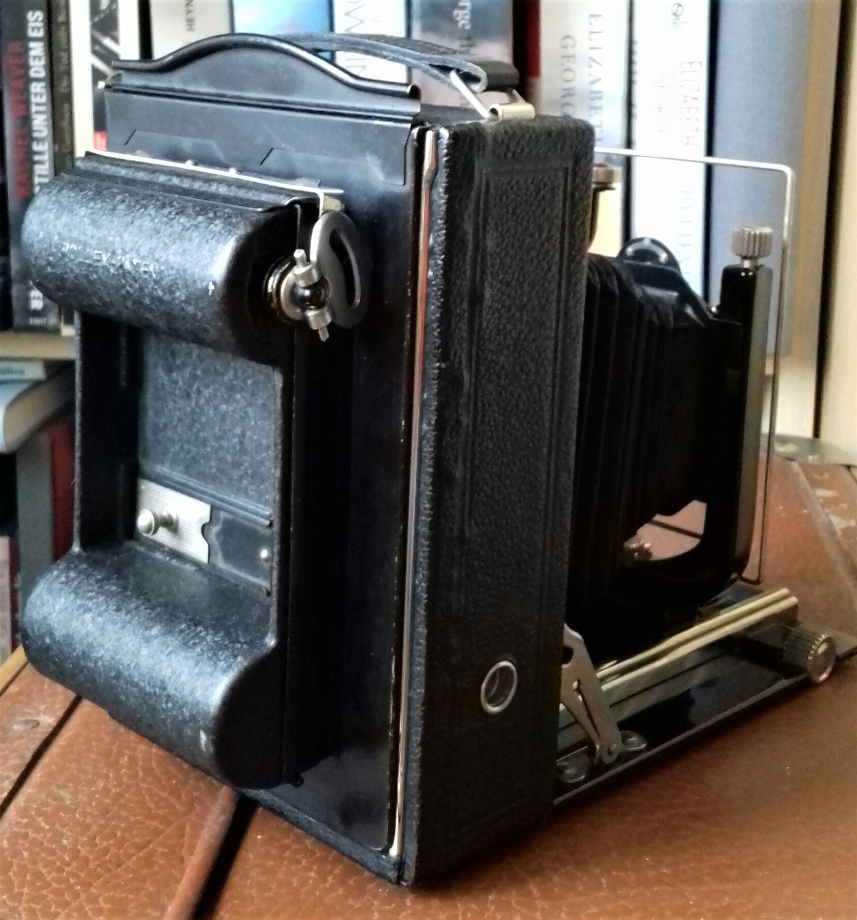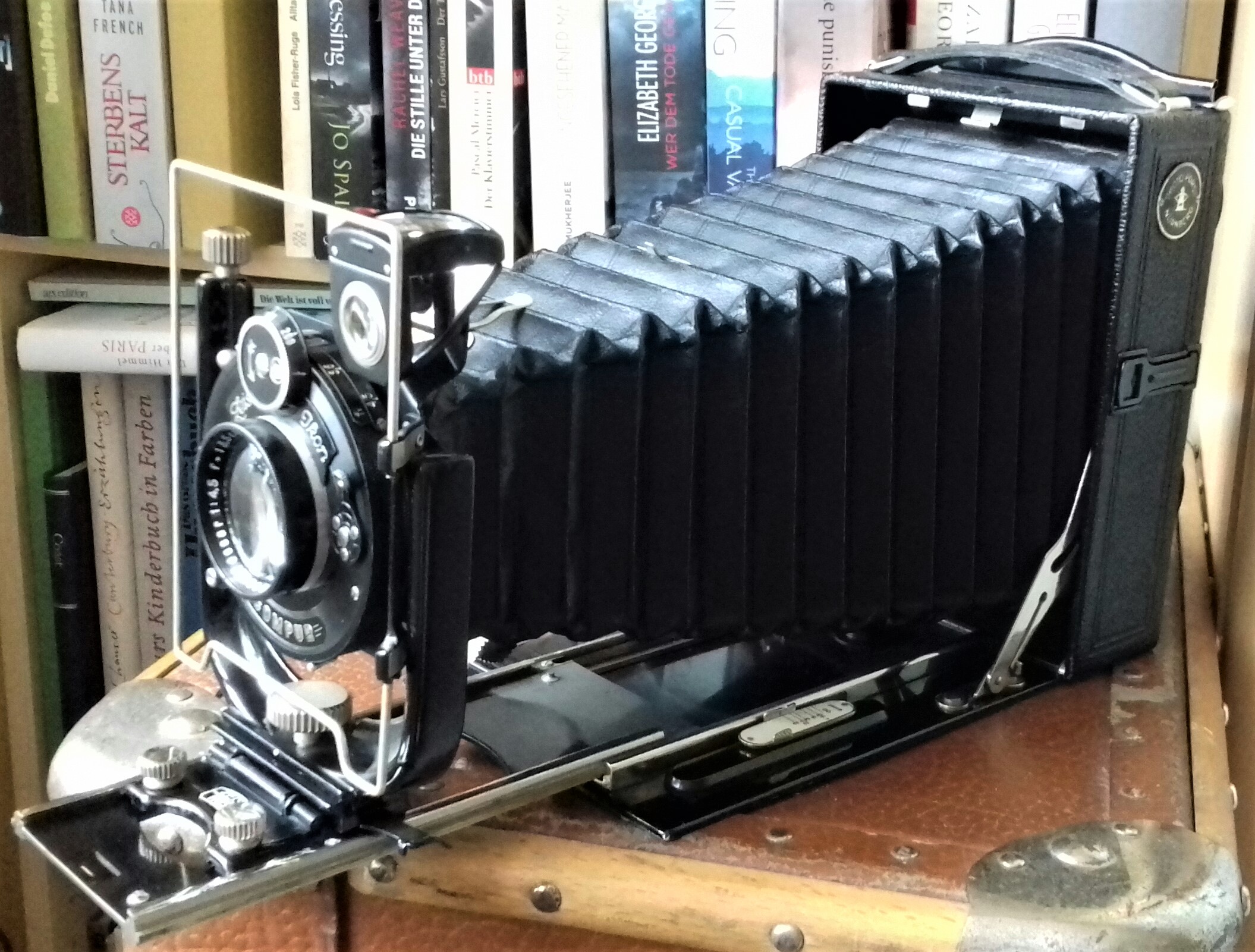 Die Kamera ist aktuell mit 120er-Rollfilm geladen (Fomapan 100 S/W) und soll bald zum Einsatz kommen. Der Zustand ist sehr gut, sogar die Wasserwaage funktioniert nach 90 Jahren noch. Nur die langen Zeiten ab 1/5 hängen. Ich habe den Balgen neu gewachst, alle Metallteile entstaubt und die äußere Optik gereinigt. Diese alten Lederbalgen sind höchst solide, gar kein Vergleich zu den ‚Papp-Balgen‘ etwa der Agfa-Nachkriegskameras.