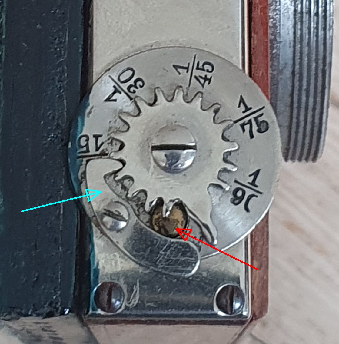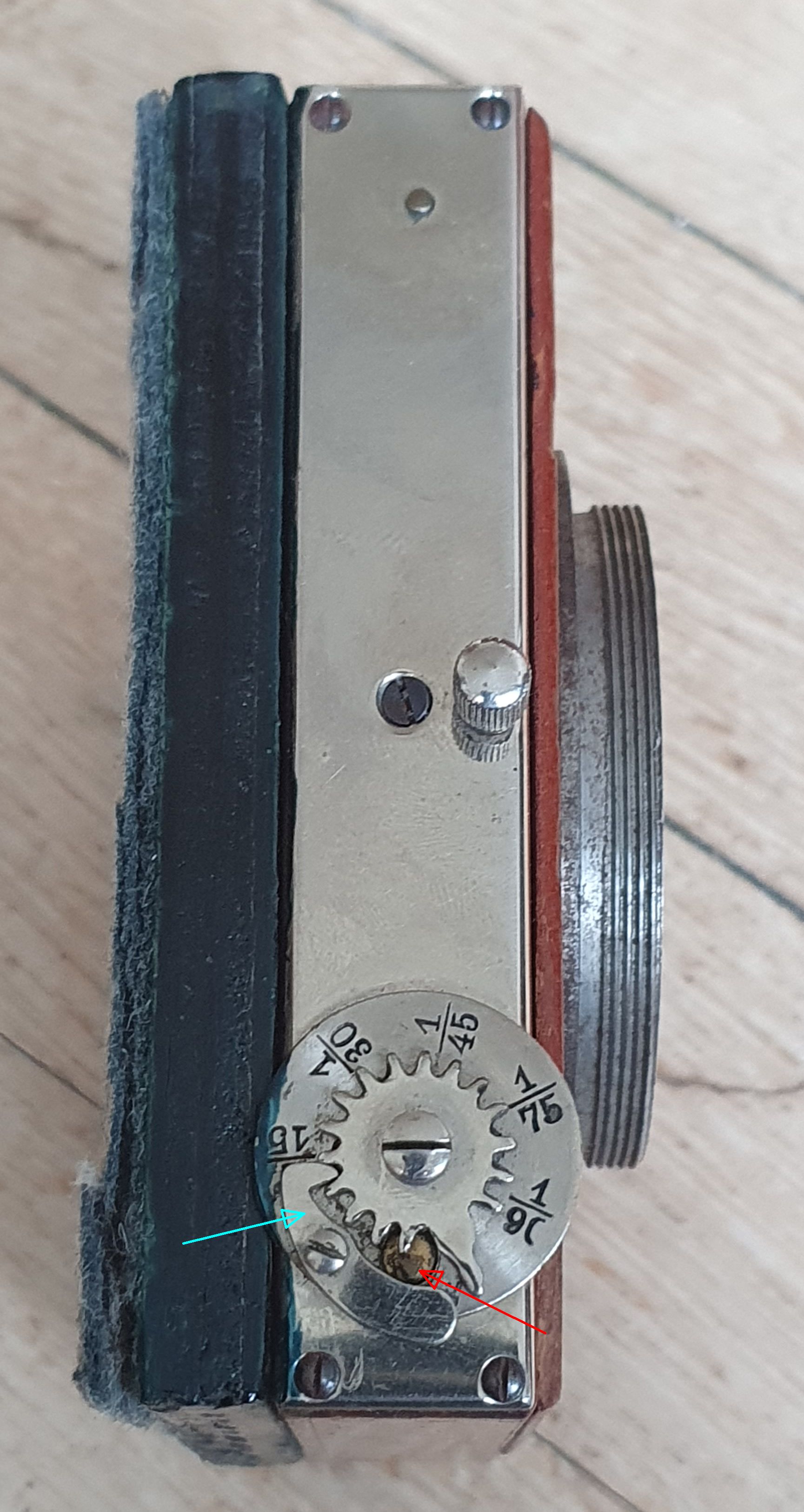 Jetzt zu meiner Frage, der Kameratyp hat einen nicht gedeckten Schlitzverschluss (Nur ein Tuch, ist beim Spannen offen) der funktioniert bei meiner leider nicht. Er ließ sich nur von der 1/30 s immer weiter in 1/100 Sekunde verstellen aber nicht zurück in Richtung 1/30. Die Sperrklinke (blau) und der kleine dreieckige Mitnehmer auf der Transportachse (rot) blockieren sich gegenseitig. Gibt es einen Trick wie man das bewerkstelligt.