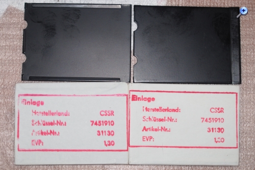 Der Text "Einlage CSSR Schlüssel-Nr. 7451910 Artikel-Nr. 31130 EVP 1,30" verweist offenbar darauf, daß diese Teile in der CSSR*) fabriziert wurden und in der Planwirtschaft der DDR unter der angegebenen Identifikation auffindbar waren und 1,30 Ostmark kosteten. Etwas Vergleichbares gab's im Westen ja leider nicht bzw. nur firmenintern, sieht man vom Buchhandel ab. Es handelt sich hierbei um Einlagen, um Planfilm in Kassetten für 6.5x9cm-Glasplatten problemlos verwenden zu können. Ein paar der zugehörigen Kassetten dürften - wenn der Eindruck ihres guten Erhaltungszustands nicht täuscht - aus derselben Zeit stammen.