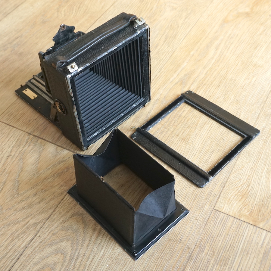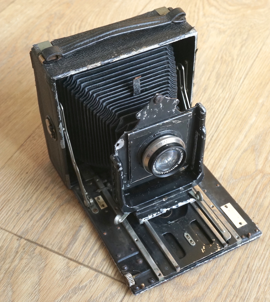 Im Februar kam ich an eine Feinak Präzisionskamera München im 9x12 Format, sehr feines Stück Münchner Kamerageschichte, da bin ich noch am Verbessern, ich benutze sie ja. Gestern kam eine andere 9x12 Kamera, bei der ich mir nicht ganz sicher bin, welcher Hersteller das ist.