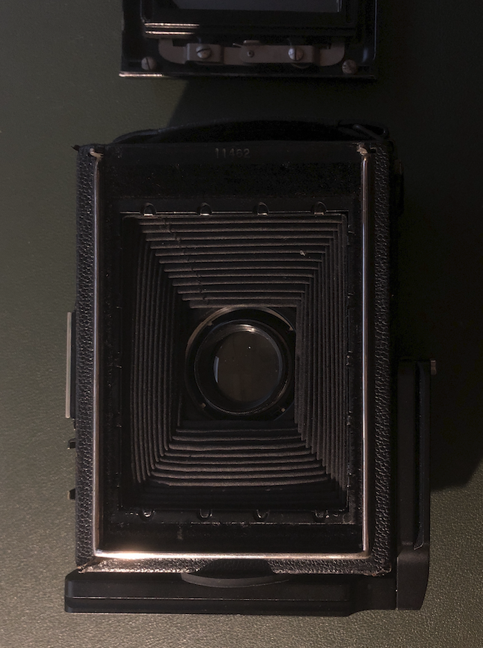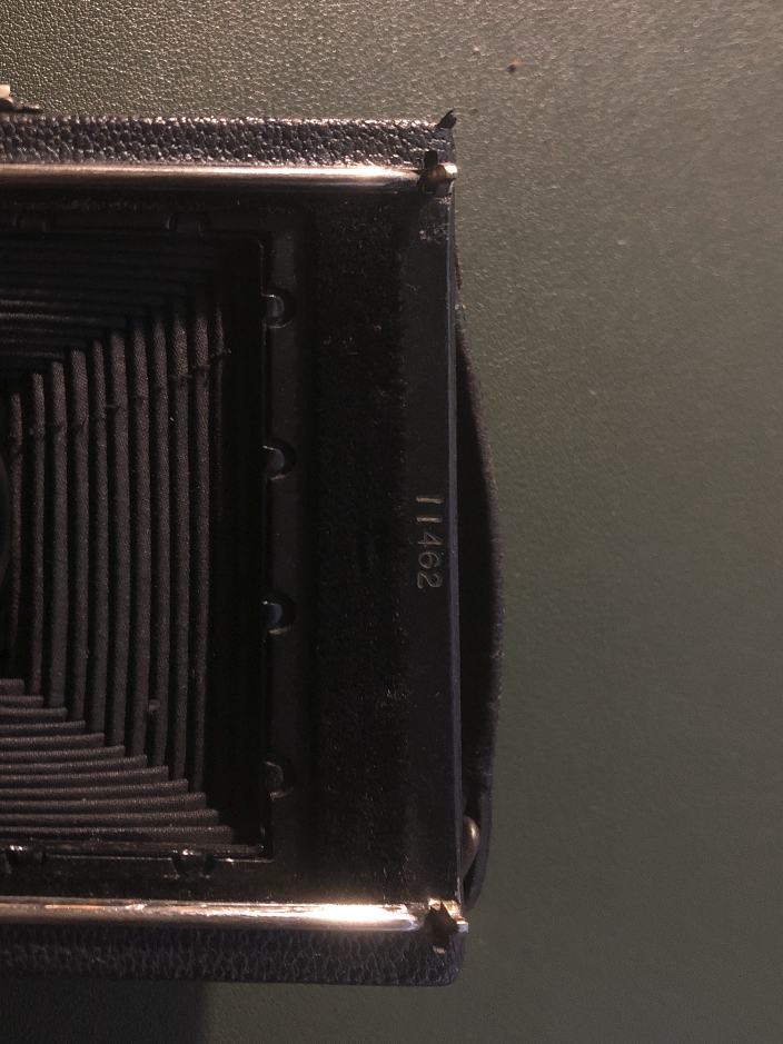 Nach großer Freude über ein als "vernebelt" beschriebenes 1:4,5 10,5 cm Tessar, dass sich als nur ungeputzt und ansonsten völlig großartig herausgestellt hat, habe ich das Mattscheibenrückteil abgenommen und dort leider nicht das erwartete Bild vorgefunden. Keine meiner Kassetten aus dem heimischen Sammelsurium passt an diese Rückseite (s. Abbildungen).