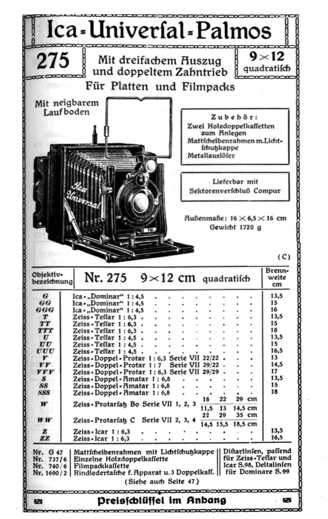 wenn es wirkliche eine Ica Universal Palmos 9x12 ,ist finde ich nur im Kadlubek einen Hinweis auf 1915. Im Ica-Katalog von 1925 taucht die Kamera nicht mehr auf.