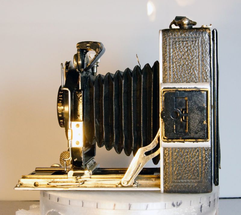 So nun zur Kamera: Auf dem Rückenteil ist Ihagee eingeprägt, auch wenn die typische Plakette. Ist auf der Innenseite des Gehäuses angebracht. Der Body ist komplett aus Metall, vermutlich Aluminium, sie hat einen doppelten Auszug und einen Ibsor Verschluss, mit B, T, 100,50,25,10,5,2 und 1.