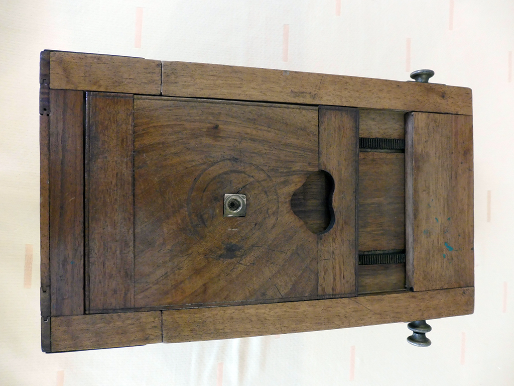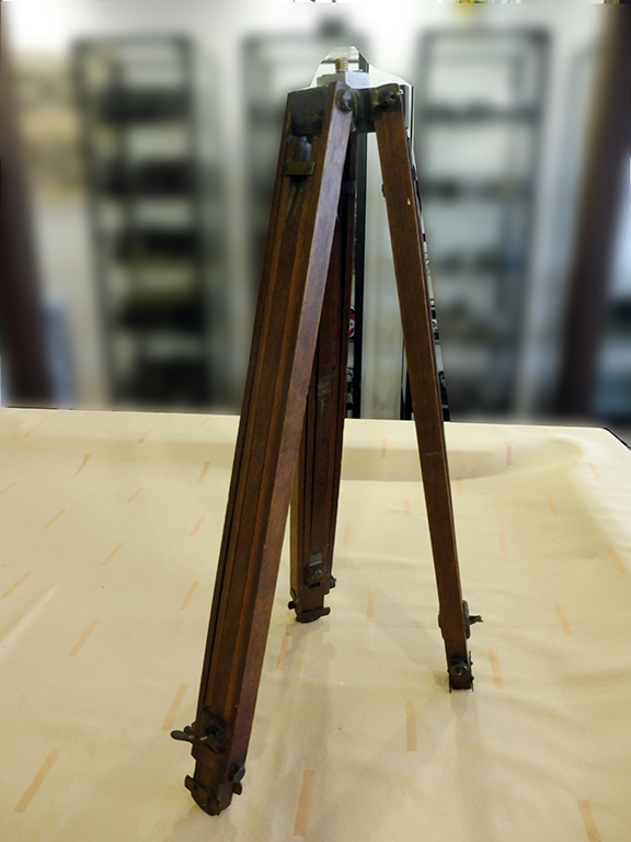 Das Holzstativ, welches auch Bestandteil der Fotoausrüstung war, ist 3teilig ausklapp-/ausziehbar und in einem sehr guten Zustand. Die fehlenden Schrauben werde ich ersetzen, jedoch (wie in einem anderen Beitrag angefragt) haben sie kein metrisches Gewinde. Der Außendurchmesser beträgt 5,2 mm. Ich habe Messingflügelmuttern in M5 bestellt und werde das Gewinde der Schrauben auf M 5 herunterschneiden. Die Muttern werde ich dann künstlich altern lassen.