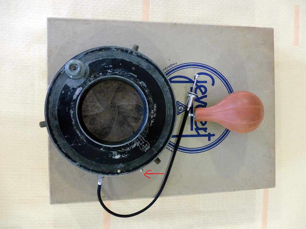 Im Zubehör war ein aufsetzbarer Verschluß (Luc ORGM) dabei, der mithilfe eines Gummiringes auf das Objektiv aufgesteckt wird. Er war ziemlich verschmutzt und ölig, mir ist es aber gelungen, ihn wieder gängig zu machen. Er hat vermutlich 3 Belichtungszeiten (die Markierungen sind nicht mehr vorhanden) und die Stufe beliebig. Ich habe einen Drahtauslöser angeschraubt und er funktioniert. Da ein Gummiball mit Schlauchanschluß dabei war, vermute ich, daß sich eventuell an der mit dem Pfeil markierten Stelle dieser zur Auslösung anschließen läßt.