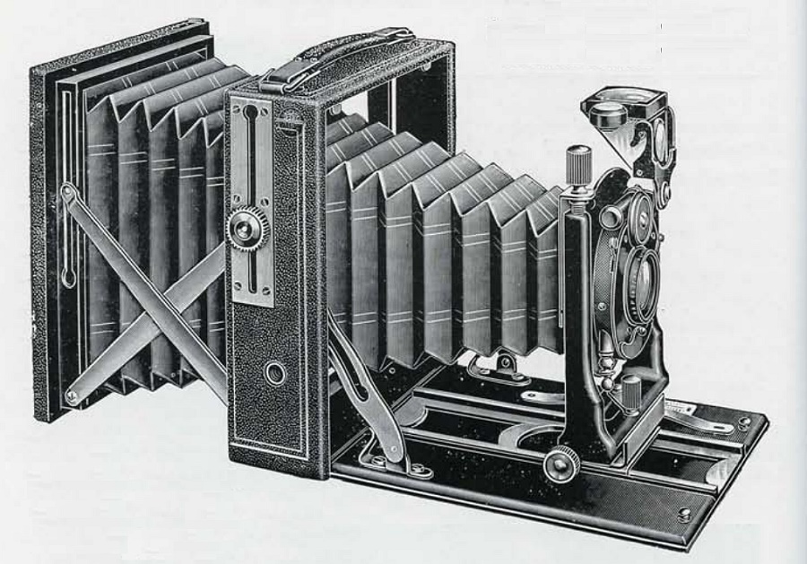 eine interessante Darstellung einer Kamera von 1911, bei der ein Quasi-Doppelauszug realisiert wird. Zum Einen wird der Balgen vom Gehäuse kommend nach vorn ausgezogen , zum Anderen auch vom Gehäuse kommend nach hinten. Ein gewisser Vorteil ergibt sich dadurch, dass der Schwerpunkt am Stativ-Gewinde günstiger liegt. Interessante und eher seltener verwendete Konstruktion.