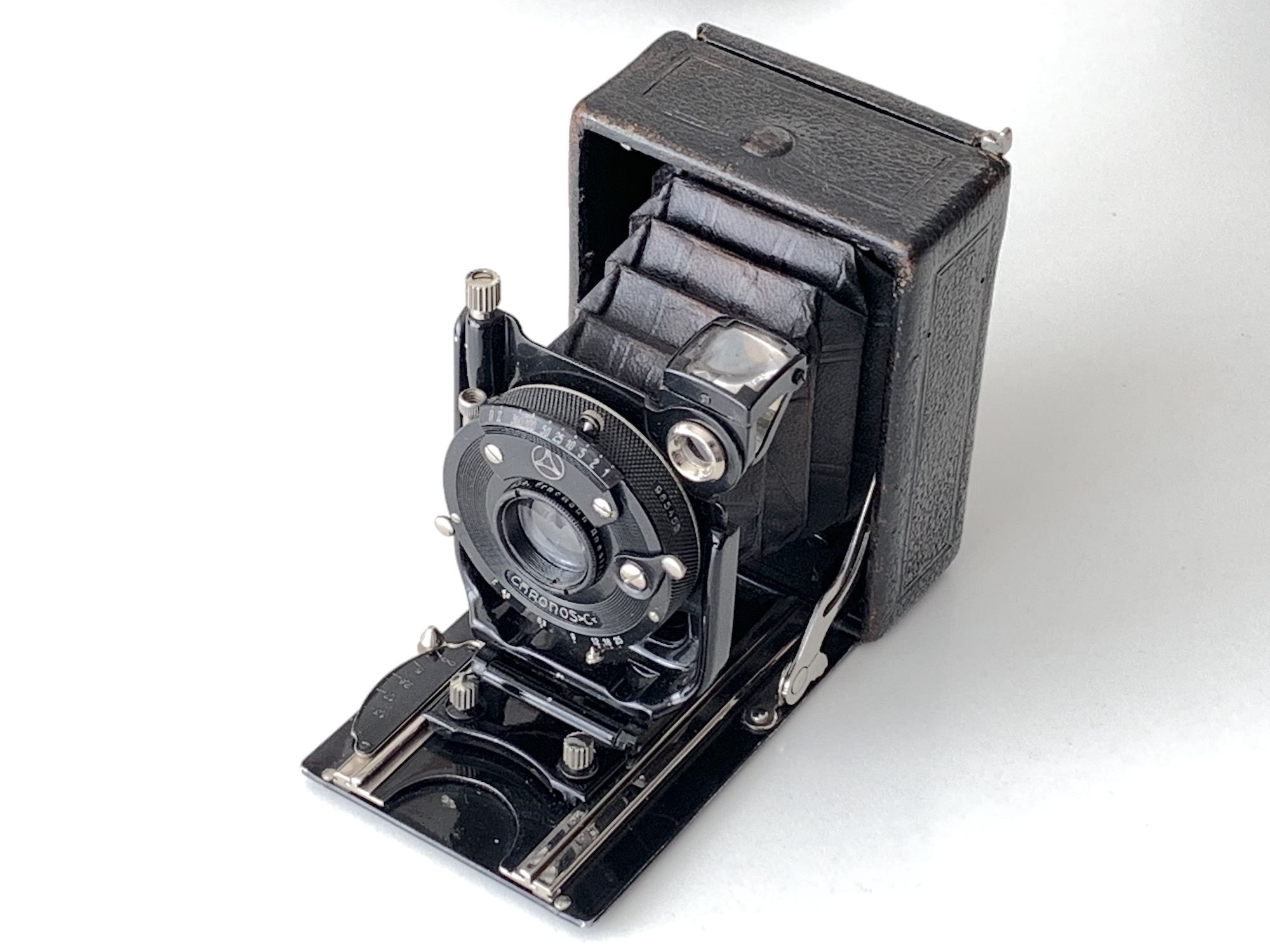Hier: Ernemann Heag V, eine Laufbodenkamera mit einfachem Auszug und Radialhebelverstellung.
