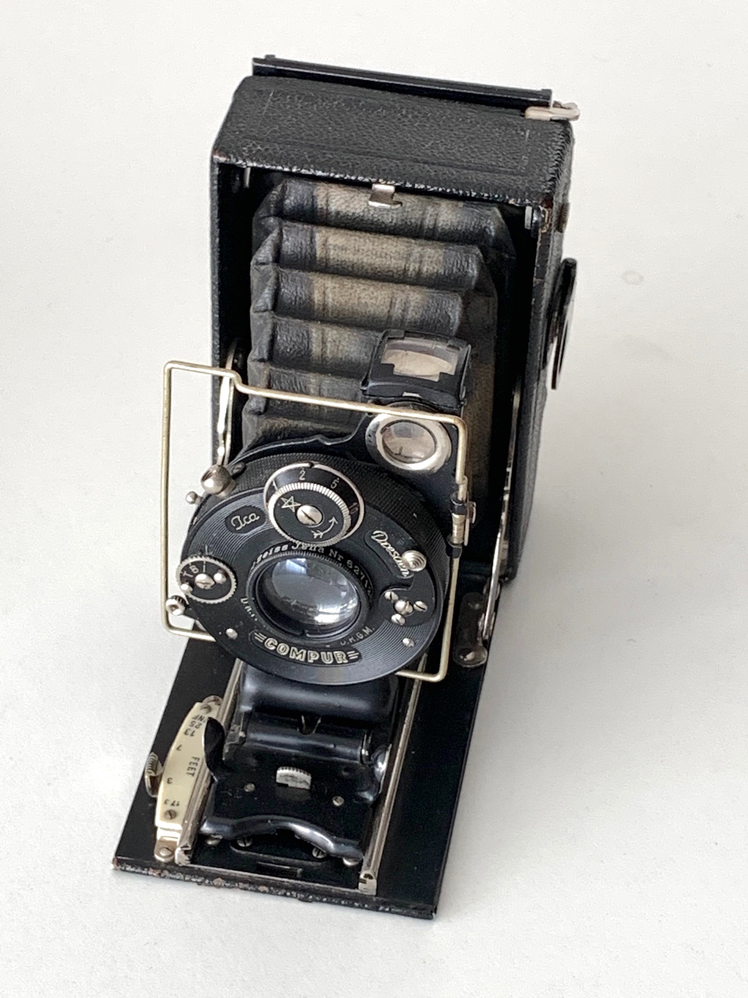 Es folgt die Ica Victrix 49: Ebenfalls eine Laufbodenkamera 4,5x6, der Radialhebel zur Entfernungseinstellung befindet sich seitlich. Die Standarte ist nicht verstellbar, die Kassetten haben den Normalfalz. Es gibt einen Brillant- und einen Rahmensucher. Dieses Exemplar ist mit einem Tessar 4,5/7,5 in Rad-Compur 1–300 ausgestattet; es lässt sich in den Zeitraum 1925/56 datieren.