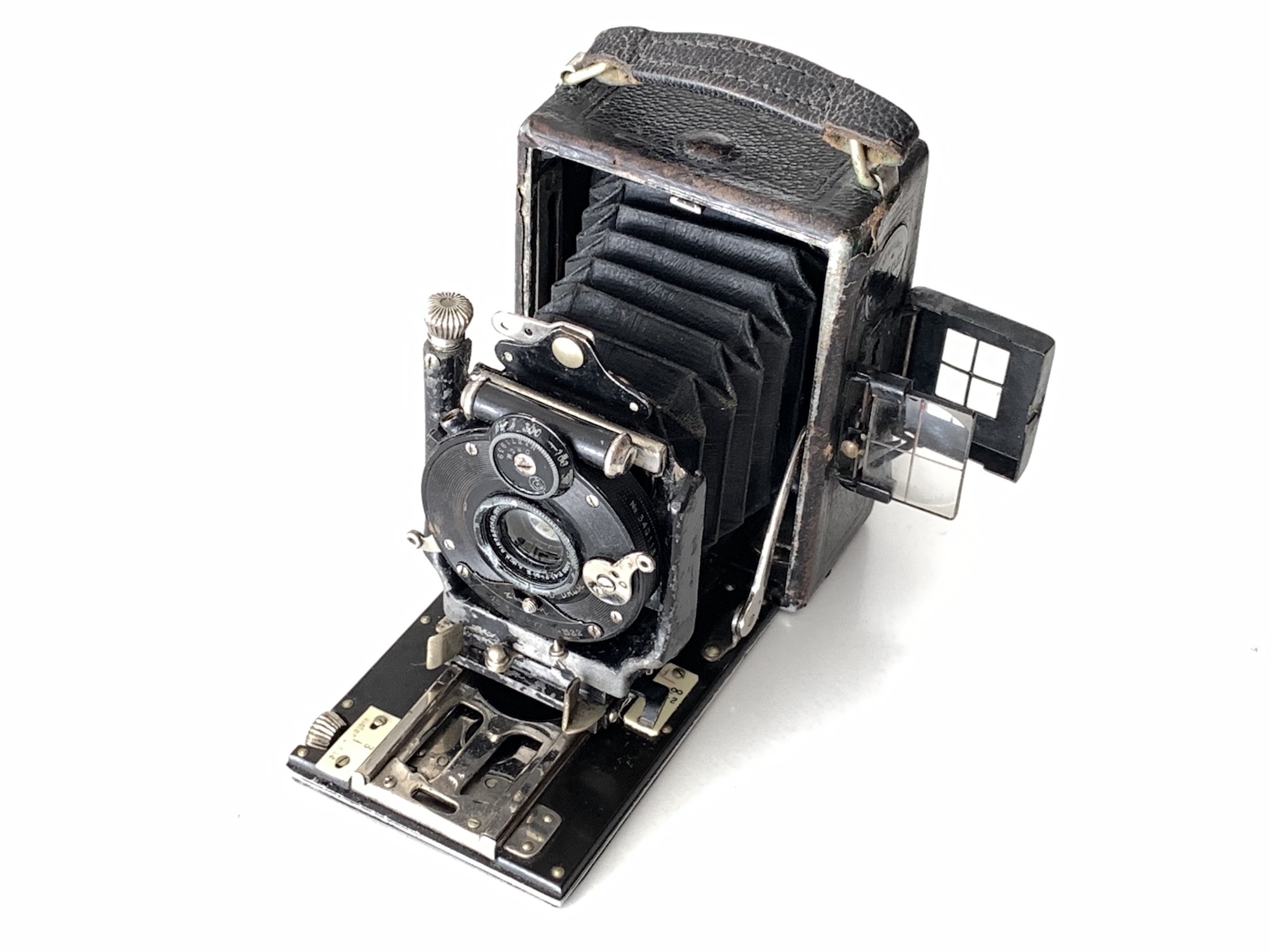 hier kommt noch eine weitere Plattenkamera im Format 4,5x6 – die Miniatur-Clack I von Rietzschel aus München. Es ist eine Laufbodenkamera mit doppeltem Auszug (daher Modell I; Modell II hatte einfachen Auszug). Sie besitzt vertikale und horizontale Verstellung des Objektivbretts, ist also ausgestattet wie die großen Modelle. Besonderheit: Verschluss/Objektiv sind durch Schnellkupplung abnehmbar! Ursprünglich gehört ein Brillantsucher zur Kamera – man sieht die ausschwenkbare Halterung –, der fehlt allerdings; statt dessen ist von alter Hand ein seitlicher Durchsichtssucher montiert worden. Verbaut ist ein Rietzschel Linear 4,5/60 in Compound. Eine technisch sehr interessante Kamera. Das Modell wurde im Zeitraum 1913–1927 angeboten; dieses Exemplar mit dem Compound dürfte wohl eher vor 1920 gebaut worden sein. Es zeigt sehr deutliche Gebrauchsspuren, funktioniert aber recht gut. – Leider ist mir beim Versuch, das festsitzende Objektivvorderteil zum Reinigen herauszudrehen, ein Teil der Fassung abgebrochen...