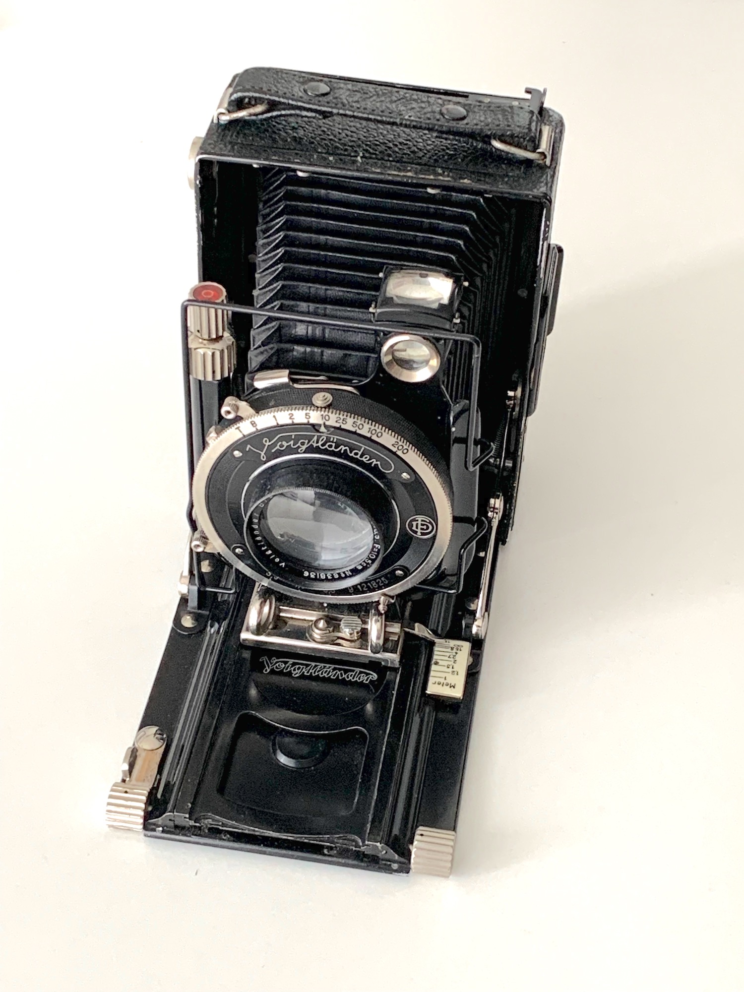 Auch Voigtländer bot sein Spitzenmodell Bergheil mit lichtstarkem Heliar an; hier die 6,5x9-Variante mit Heliar 3,5/10,5 in Ring-Compur. Bei diesem 3. Modell ist der Verschluss über einen Bajonett-Anschluss wechselbar. Angeboten wurde es um 1929 für 200 RM.