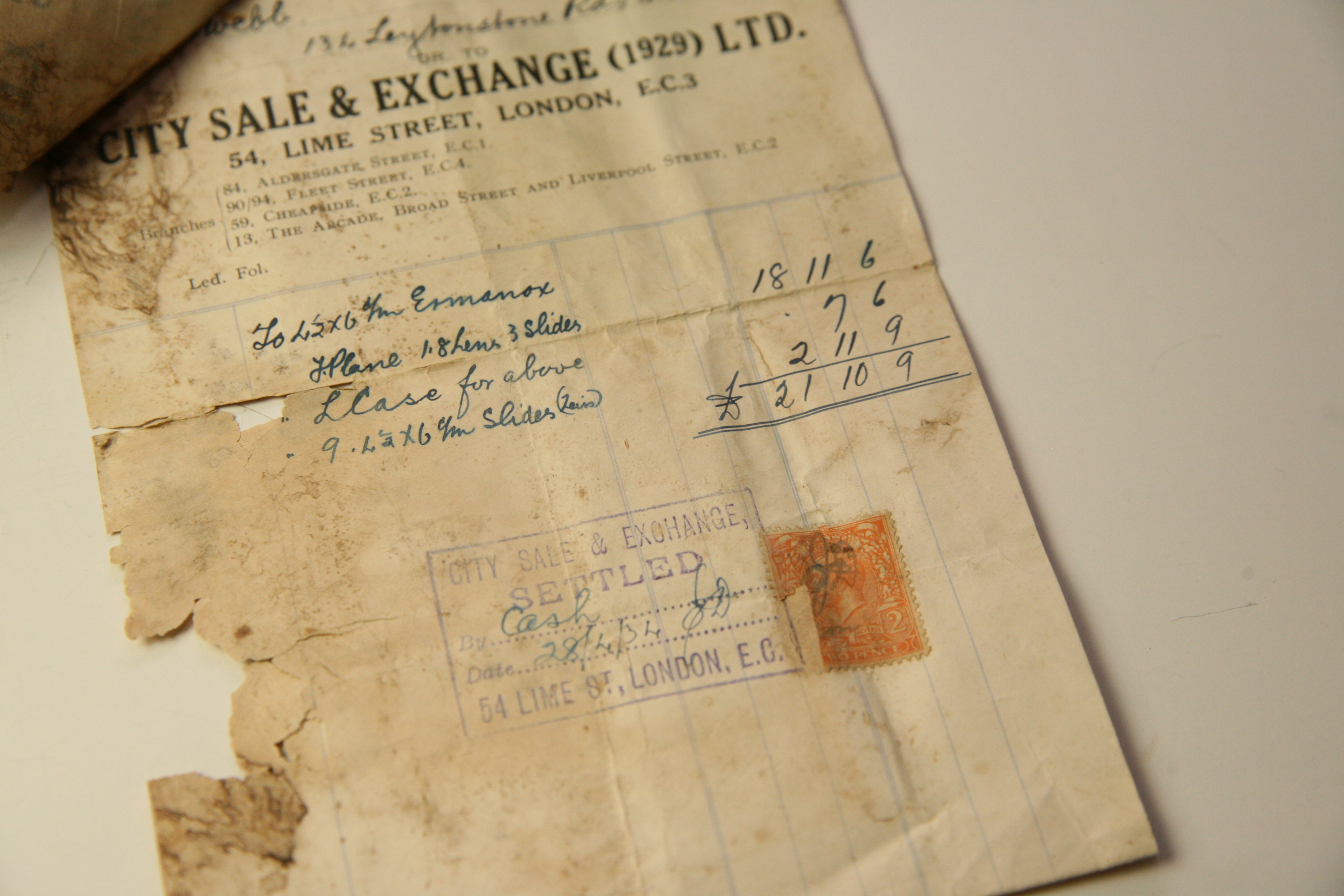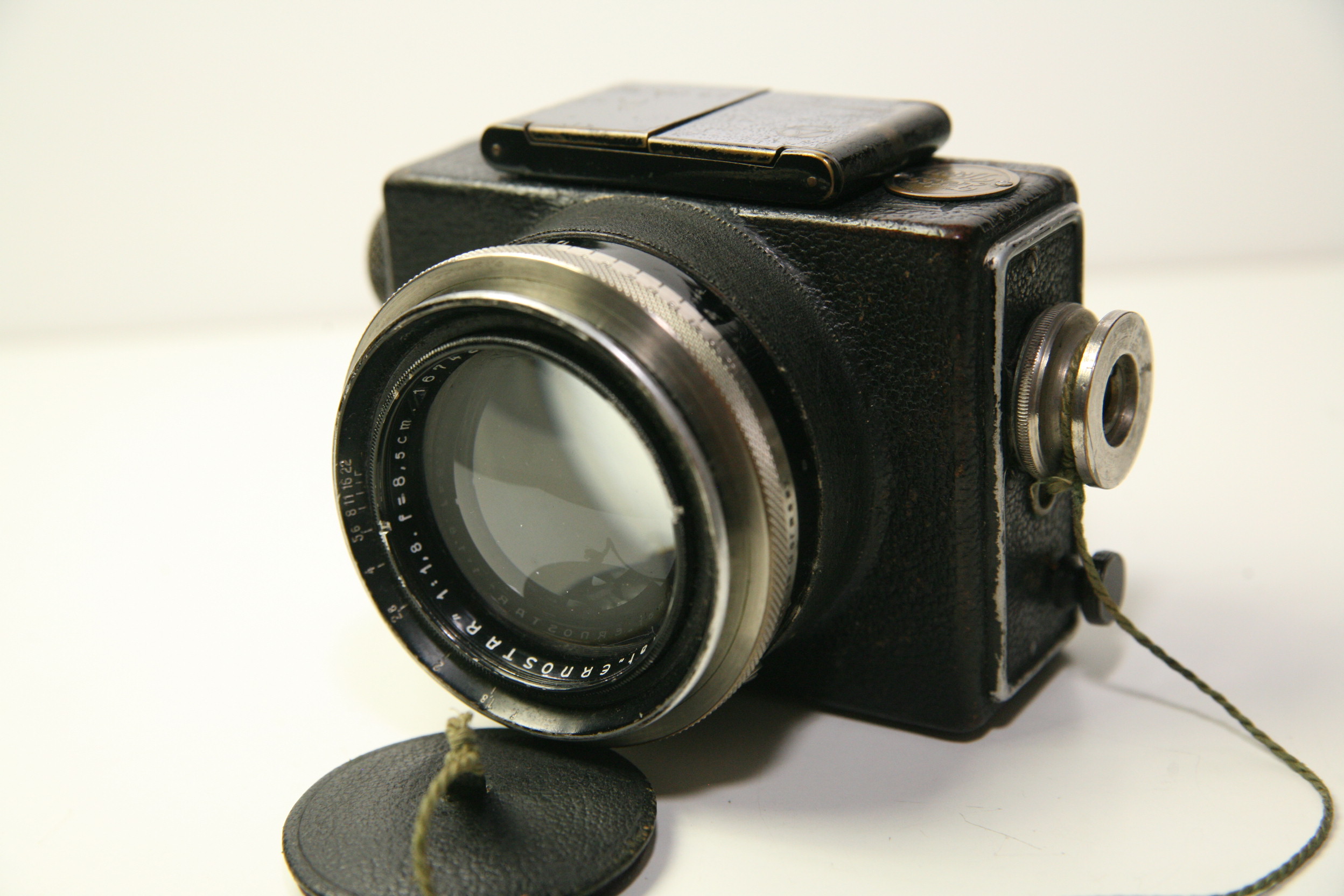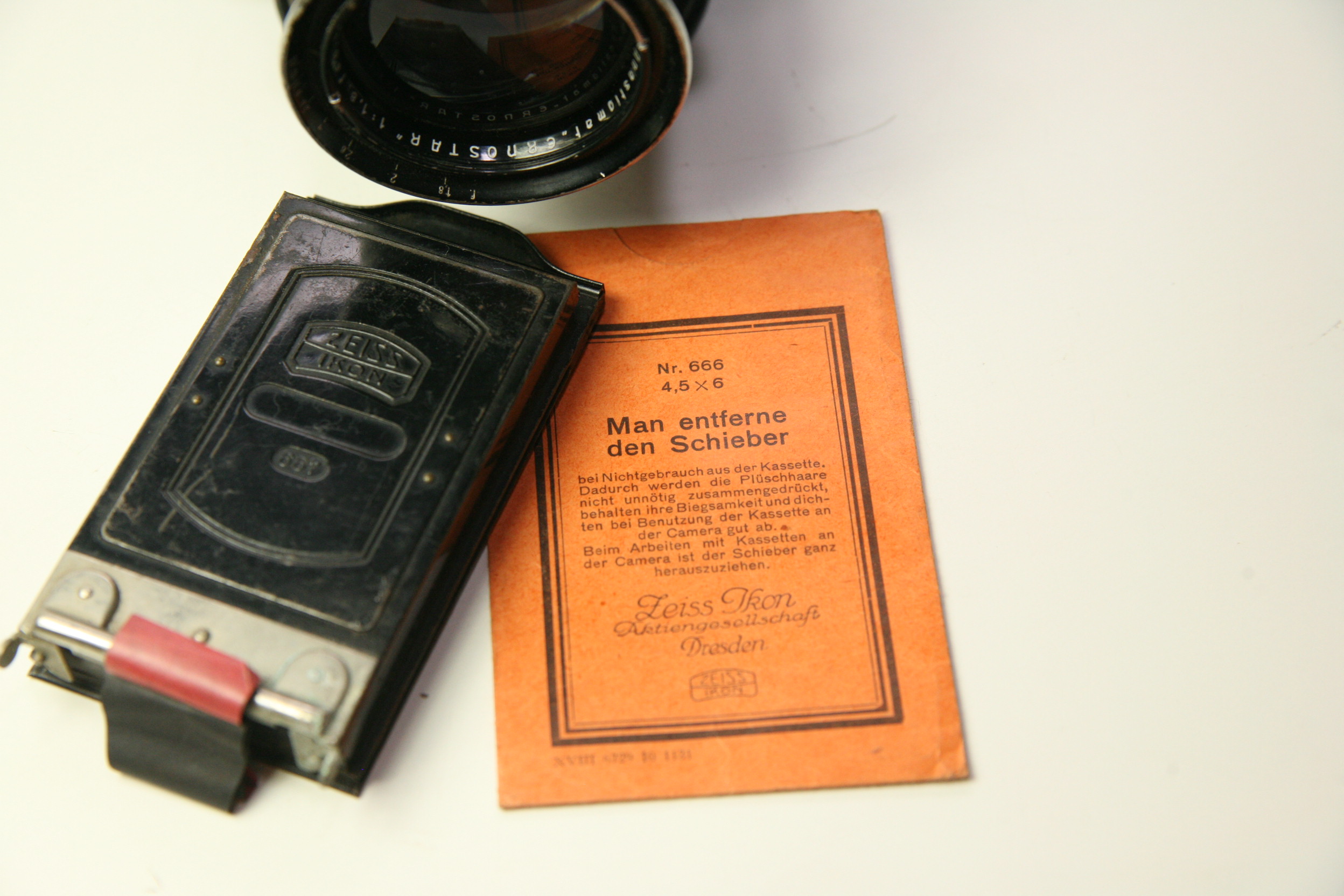 hier mal was ganz Besonderes, die Ernemann Ermanox-Camera mit Schlitzverschluss und Ernostar f/1,8 / 85mm (Planfilm 4,5x6cm). Hier ein relativ spätes Modell, bei der Zeiss schon seinen Markennamen aufs Gehäuse schraubte, aber ansonsten alles von Ernemann ist. Zeiss hatte Ernemann schon 1926 übernommen, aber die Produktion noch bis in die 30er Jahre fortgesetzt. Offiziell ist die Ermanox Produktion 1931 eingestellt worden. Die hier Verkaufte ist also ein Gebraucht-Modell gewesen. Sie ist, Anhand der Seriennummer, den letzten 900 Stück zuzuordnen. Insgesamt sollen in der Version 4,5x6 cm nur ca. 2300-2400 Kameras hergestellt worden sein, wovon fast 2/3 mit dem Objektiv Ernostar f:2,0 / 100 mm ausgestattet waren. Kamera und Objektivtubus aus Leichtmetall mit Lederbezug. Objektiv in Schneckengangfassung mit Einstellskala und Unendlichkeitsanschlag. Ernemann-Präzisions-Schlitzverschluss bis 1/1000 Sekunde mit gedecktem Aufzug. "Made in Germany" Ausführung.