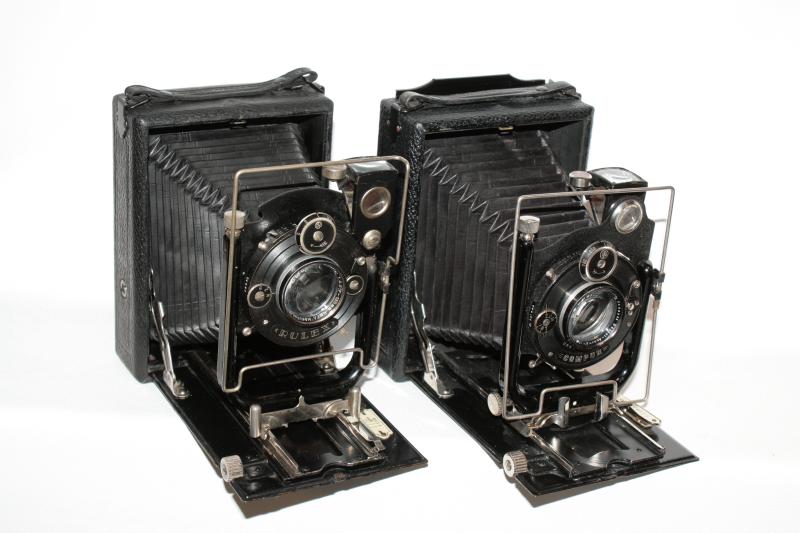 Ein Beispiel: Auf der Seite von Emtus sehe ich eine "Knoll", die einer meiner Kameras so sehr ähnelt, daß sie praktisch sicher vom selben Hersteller stammen wird wie die im Bild links. Und bei dieser vermute ich als Hersteller Conrad A. Müller in Strengenberg - einen der seinerzeit wichtigsten Hersteller von Hausmarkenkameras für Fotohändler. Die rechte Kamera ist - bei ganz anderem Erscheinungsbild - technisch praktisch identisch. Und das, obwohl die beiden auf den ersten Blick unterschiedlicher aussehen als oftmals völlig unterschiedliche Kameras zweier bedeutender Hersteller. Im übrigen haben beide Kameras dieselben Rückteile (und dieselben Kassetten). Daß eine der beiden Kameras im Bild eine Kassette zeigt, ist unerheblich.