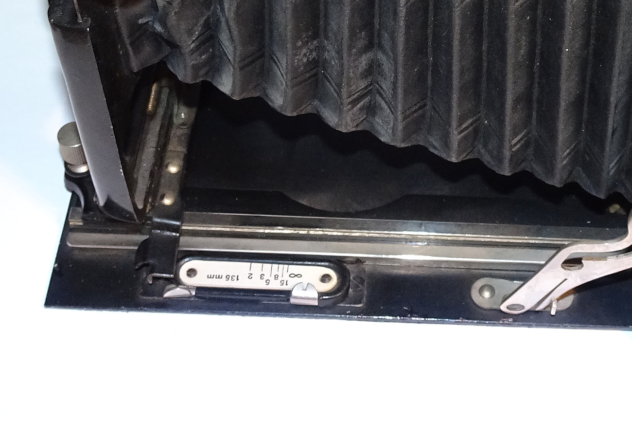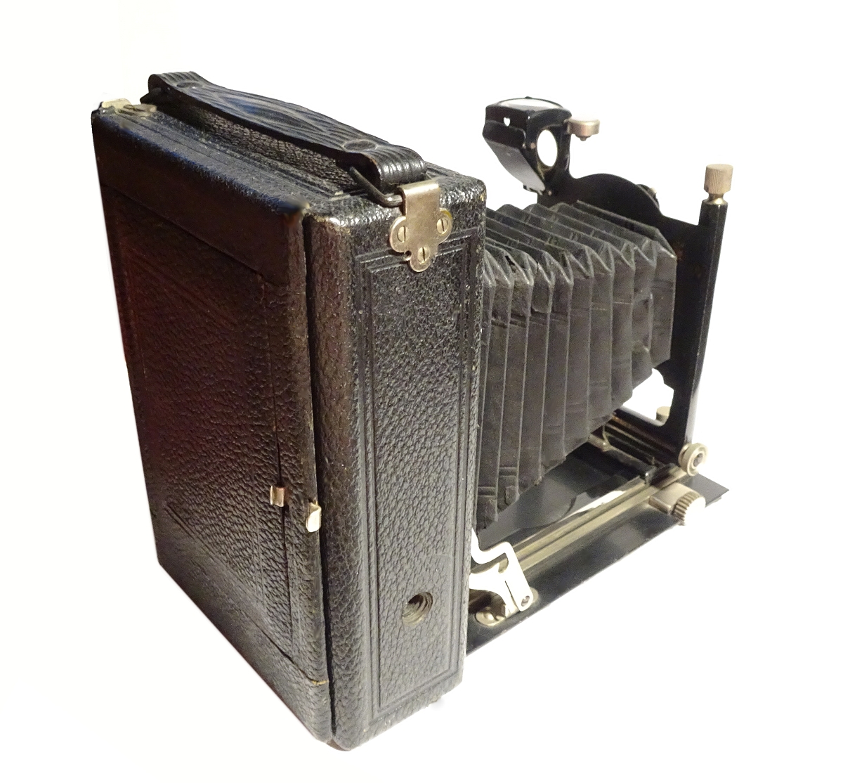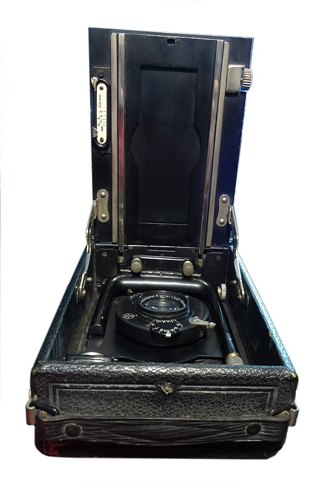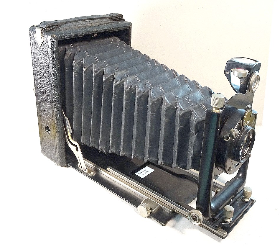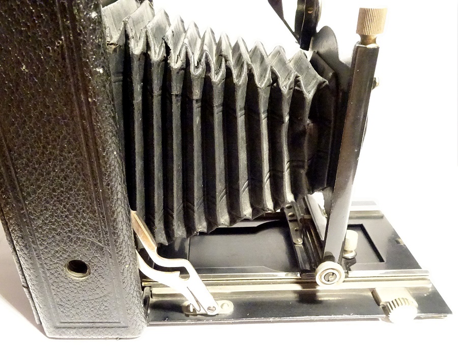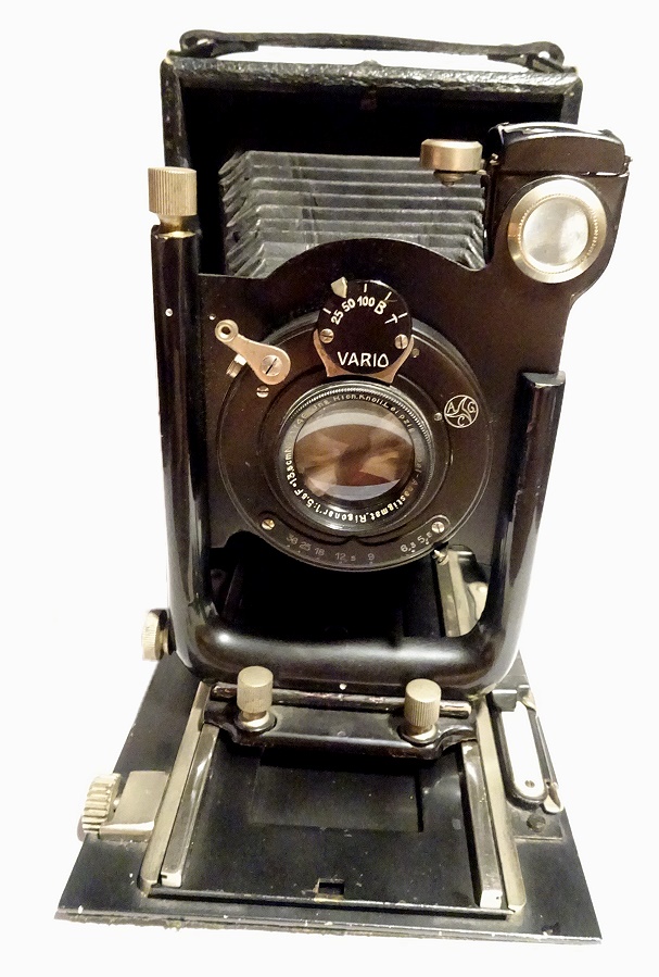 Besonderheiten, Sonstiges: Balgen, mit Auszug für Nahaufnahmen und "Teleaufnahmen" mit halben Anastigmat, einklappbar. Objektivzentrierung in zwei Achsen verschiebbar. 2 x Stativgewinde. Drahtauslöser. Tragegriff