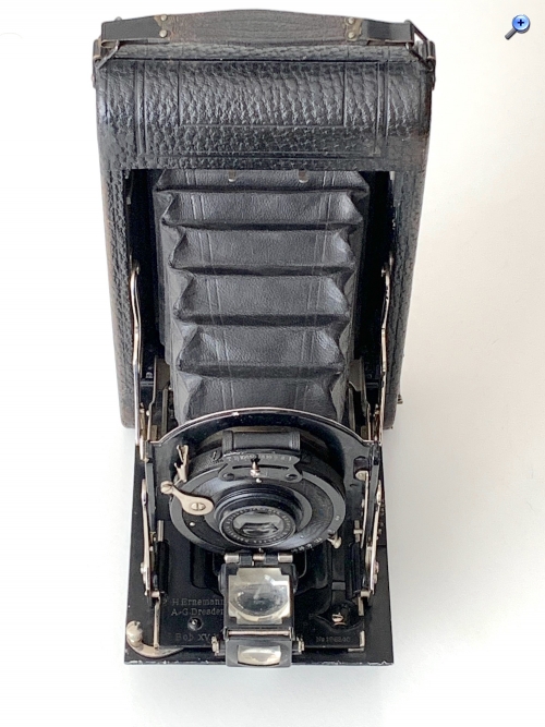 Die Besonderheit: Eigentlich ist es keine Laufbodenkamera, sondern sie besitzt eine Springkonstruktion, d.h., die Standarte erreicht beim Ausklappen automatisch die Unendlich-Position. Was in den 1930er Jahren gerade bei Rollfilmkameras selbstverständlich wurde, wurde im Zeitraum 1910—1918, als dieses Modell angeboten wurde, noch erprobt. Bei Ernemann folgte auch die Plattenkamera Heag XV diesem Prinzip.