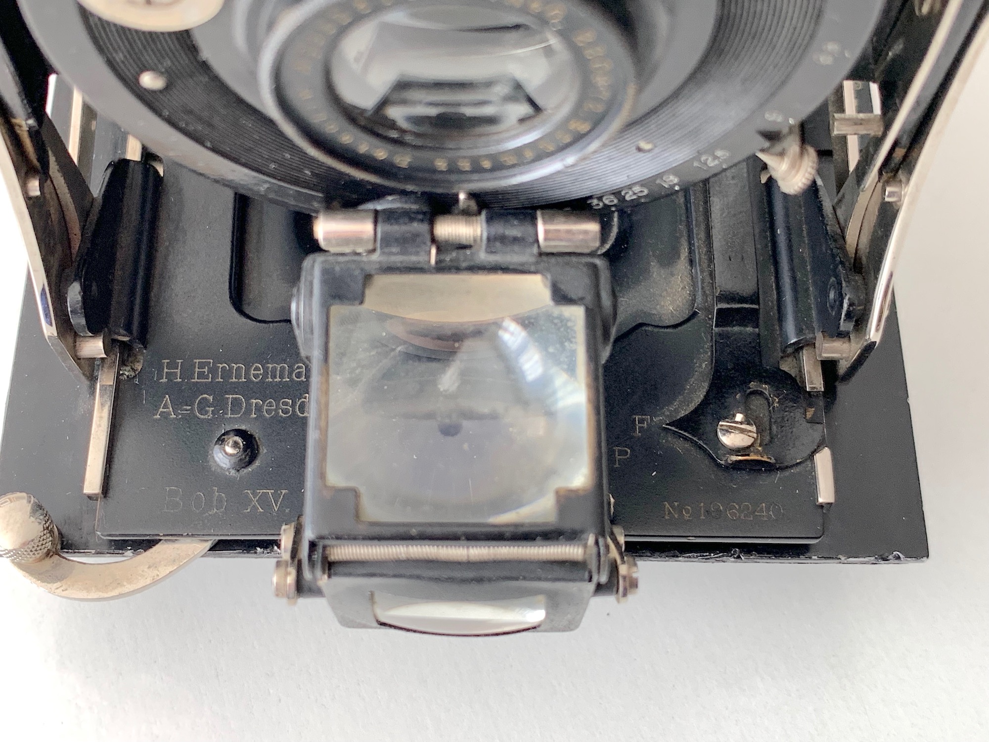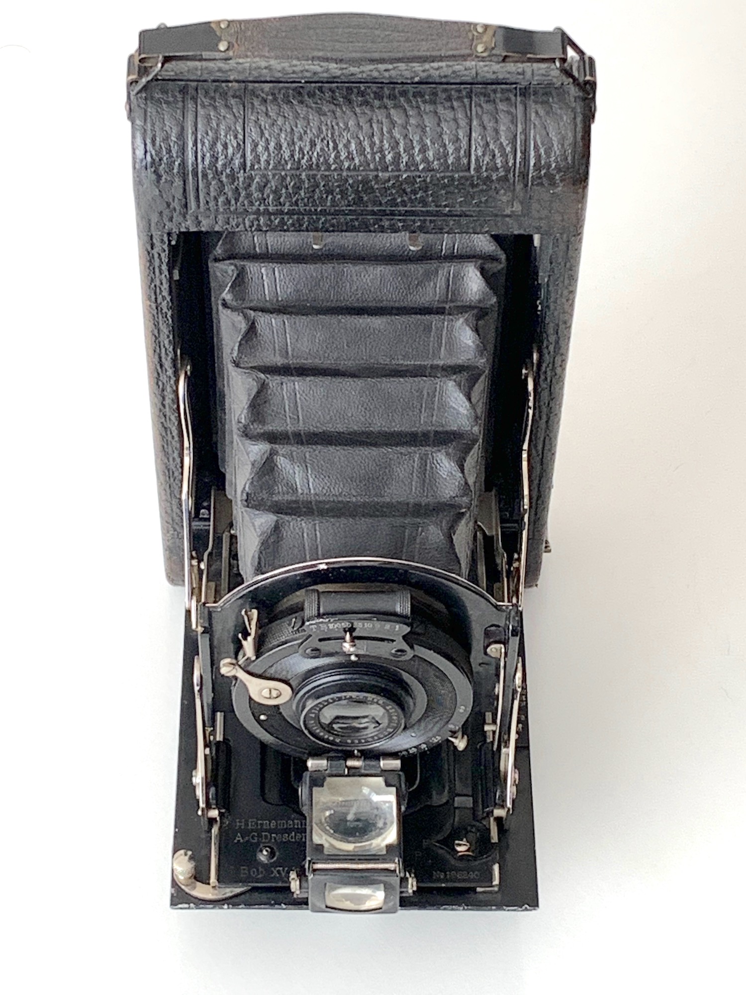 unter der Bezeichnung Bob bot Ernemann eine Reihe von Laufbodenkameras an, von denen einige nur für Rollfilm, andere wahlweise für Rollfilm oder Platten bestimmt waren. Dazu gehört die hier vorzustellende Bob XV, eine Kamera im Format 8x10,5 für Rollfilm 118 oder Platten 9x12.