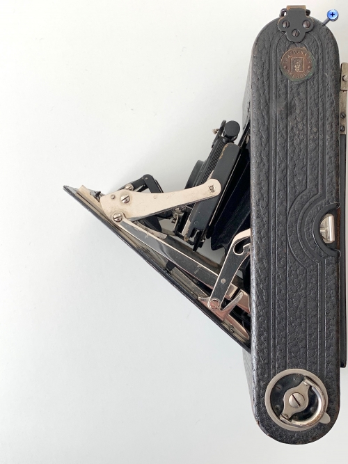 Das gezeigte Modell ist derzeit für Rollfilmbetrieb eingerichtet; es können aber ein Mattscheibenrückteil und entsprechende Kassetten angesetzt werden. Die Kamera kostete seinerzeit 200 Mark.
