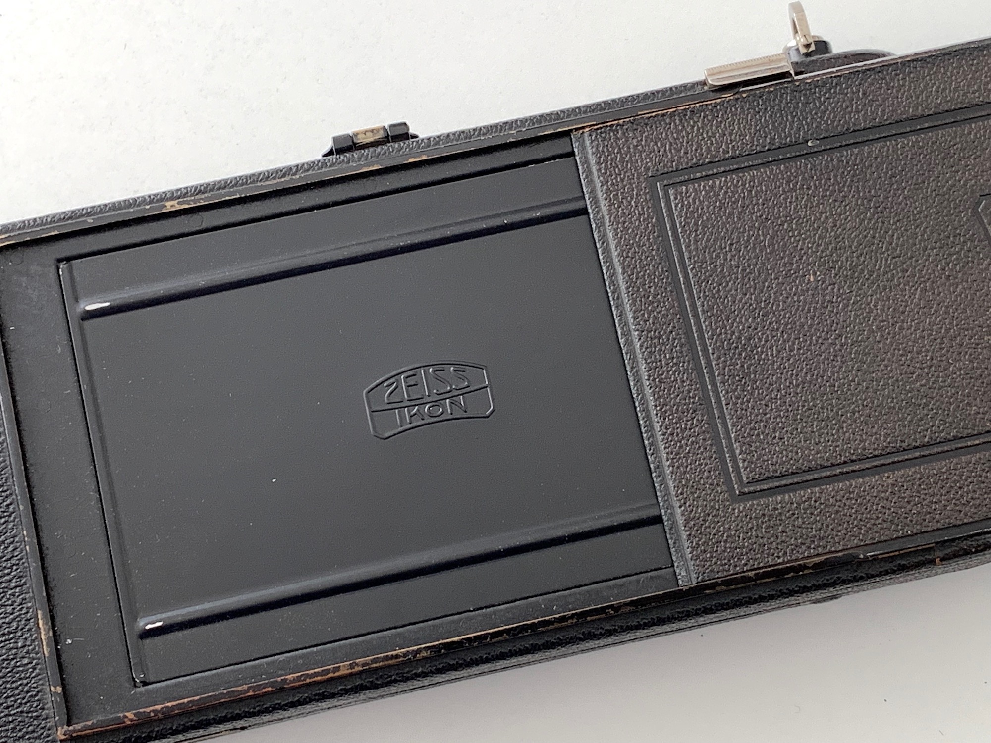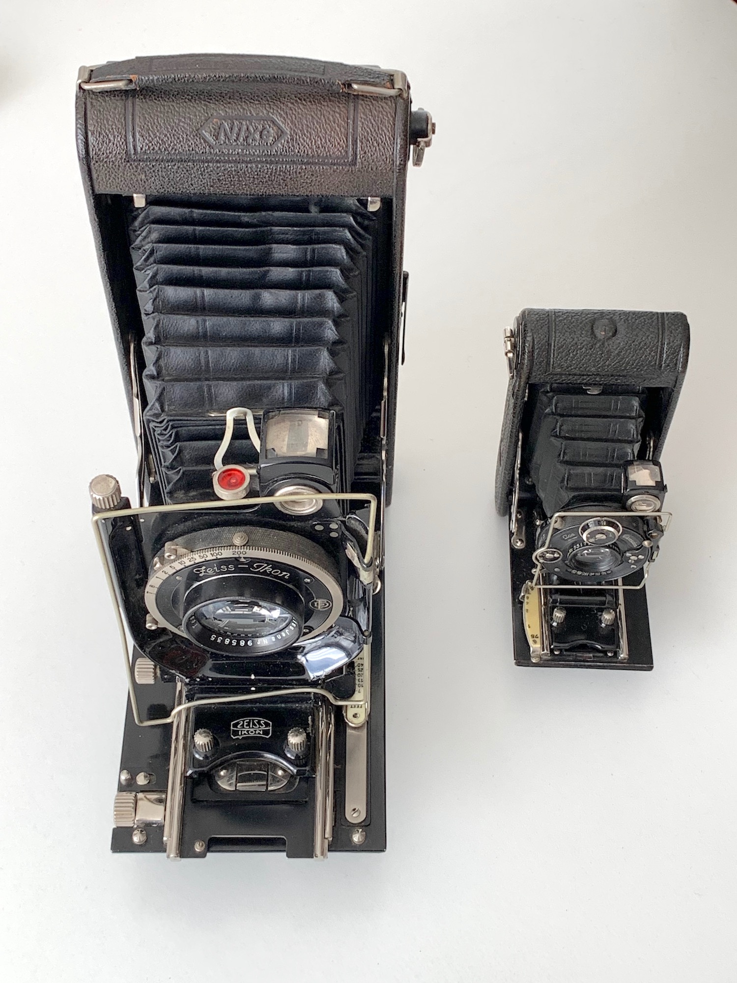 hier kommt eine Platten-Rollfilmkamera im Format 8x14, die Zeiss Ikon Nixe 551/6 (manchmal auch als Nixe B bezeichnet). Sie wird in den Katalogen in die große Reihe der Icarette-Kameras eingeordnet; eindrucksvoll ein Vergleich mit der kleinen (Ica) Icarette 4x6,5 (die noch gesondert vorgestellt wird):