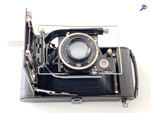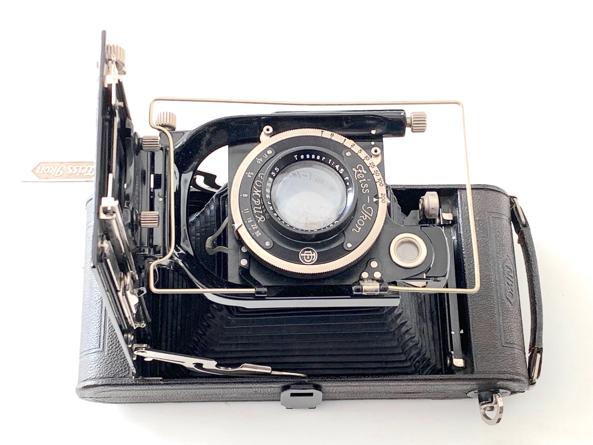 Verbaut ist hier ein Tessar 4,5/15 in Ring-Compur mit Selbstauslöser. In dieser Ausstattung war die Kamera lt. Otto (Carl Zeiss Kamera-Register) im Zeitraum März 1927 bis Januar 1932 im Handel; sie wurde für 225 RM angeboten.