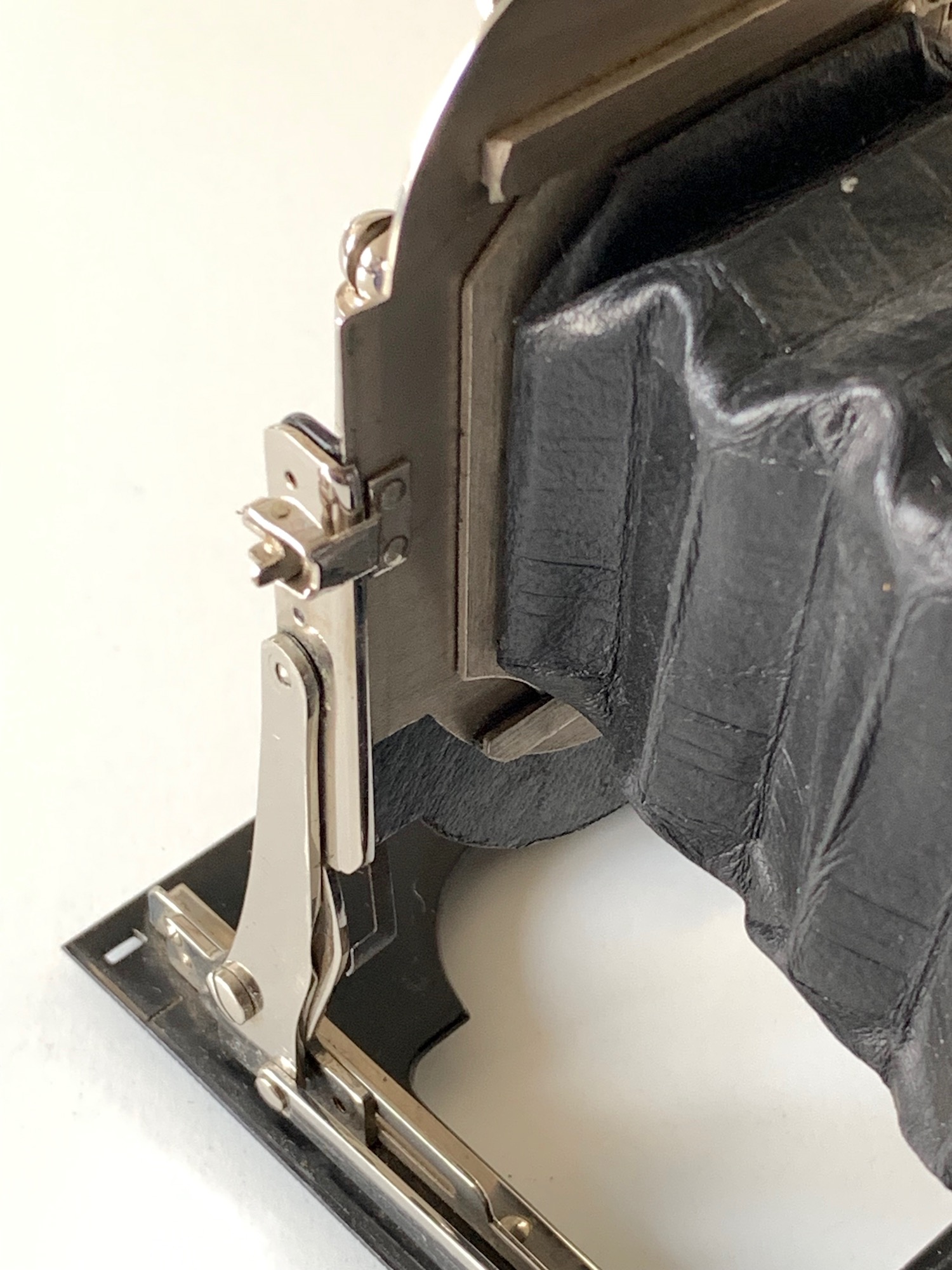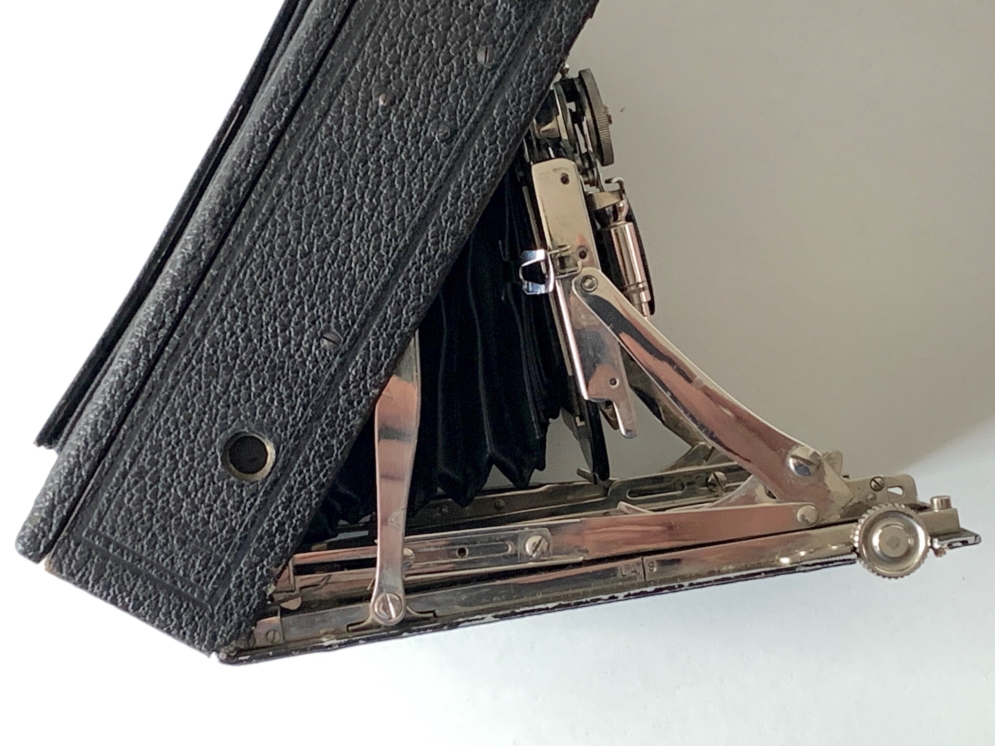 Wie bei anderen Heag-Kameras ist ein Newtonsucher eingebaut, der sich beim Aus- und Einklappen des Laufbodens automatisch aufrichtet bzw. einfährt. Bei frühen Modellen gab es zusätzlich einen ebenfalls automatisch ausklappenden Brillantsucher mit Libelle (abgebildet im Katalog 1912), später fiel er offenbar weg, im Katalog 1914 wird er nicht mehr erwähnt. Ich würde das vorliegende Exemplar daher in die Zeit um 1914 oder später datieren. Auf der Oberseite findet sich aber noch eine Vorrichtung, deren Sinn sich mir nicht erschließt – hier muss ein klappbares, arretierbares Bauteil gesessen haben, evtl. ein Zusatzsucher oder eine Libelle? Aus der Abbildung im Katalog 1914 geht das nicht hervor.