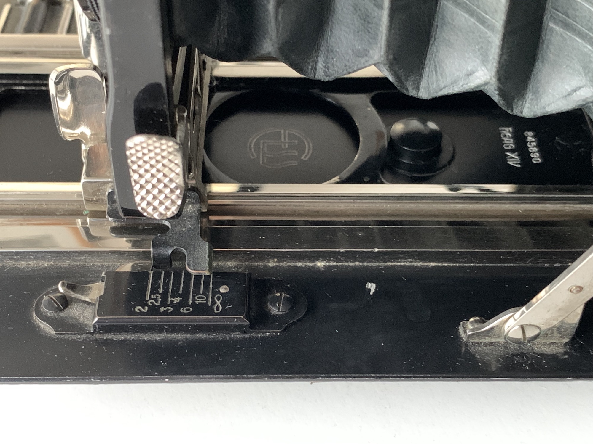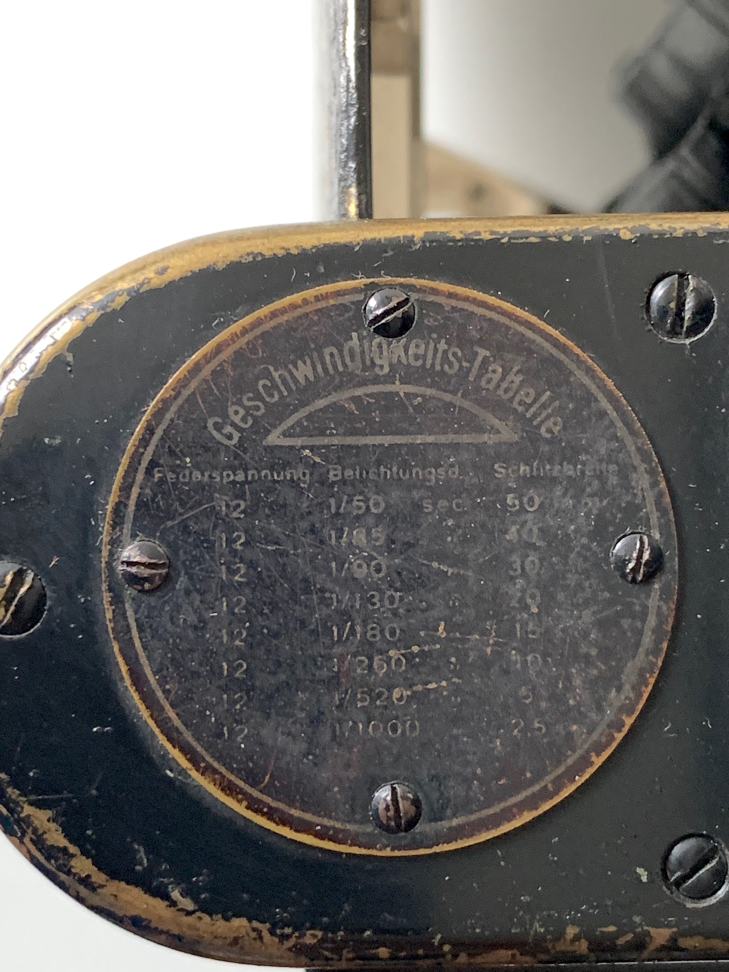 Zusätzlich ist jedoch ein Schlitzverschluss eingebaut, der den Zeitenbereich 1–1/1000 s. umfasst. (Beim bis 1918 angebotenen früheren Modell war die kürzeste Zeit sogar 1/2500 s.) Ob die kurzen Zeiten bei den seinerzeit üblichen Empfindlichkeiten und dem vergleichsweise lichtschwachen Objektiv wirklich genutzt werden konnten, erscheint mir fraglich. Die Steuerung des Verschlusses erfolgt über die Einstellung der Schlitzbreite; Auskunft gibt eine Tabelle an der Seite.