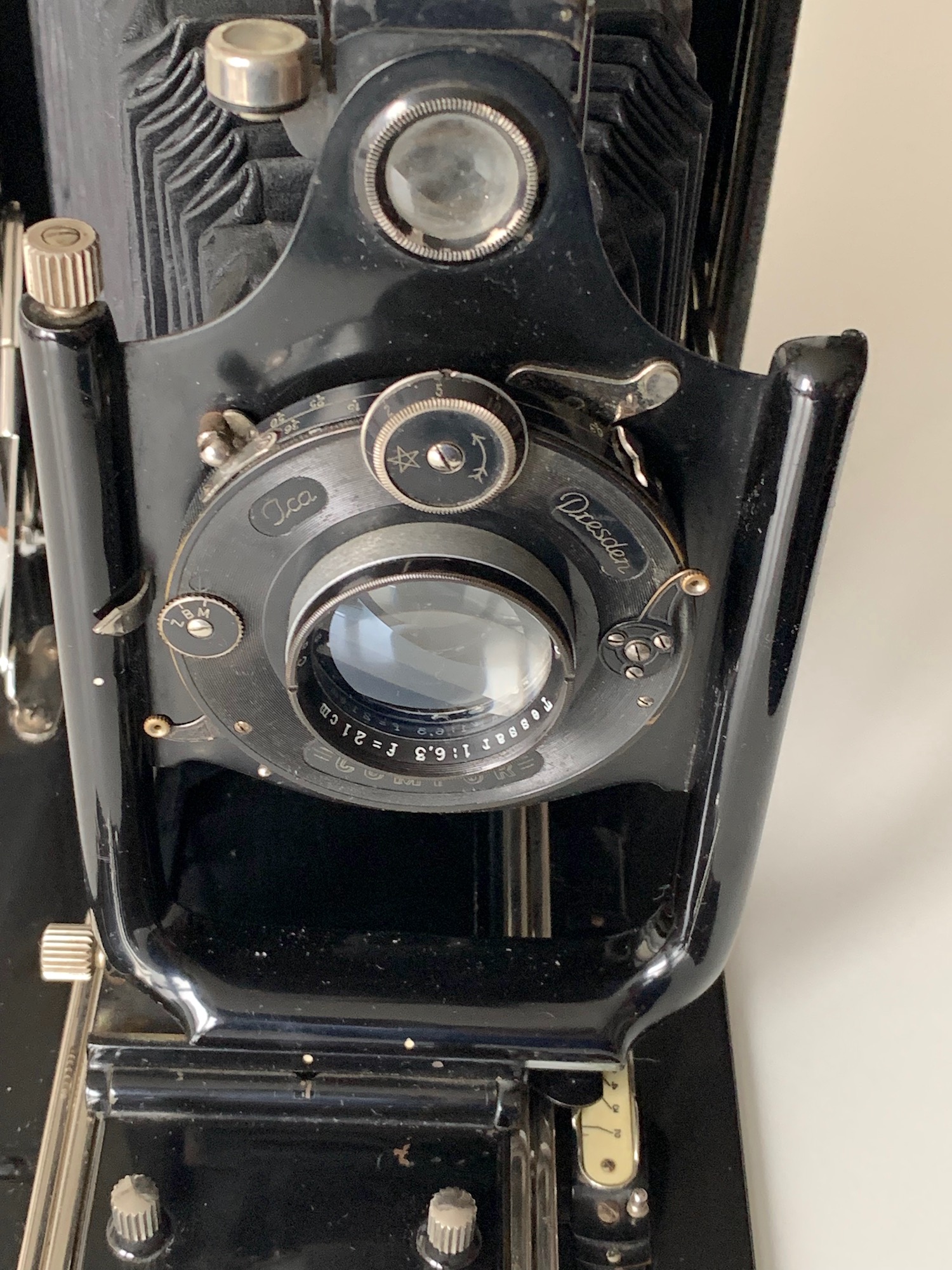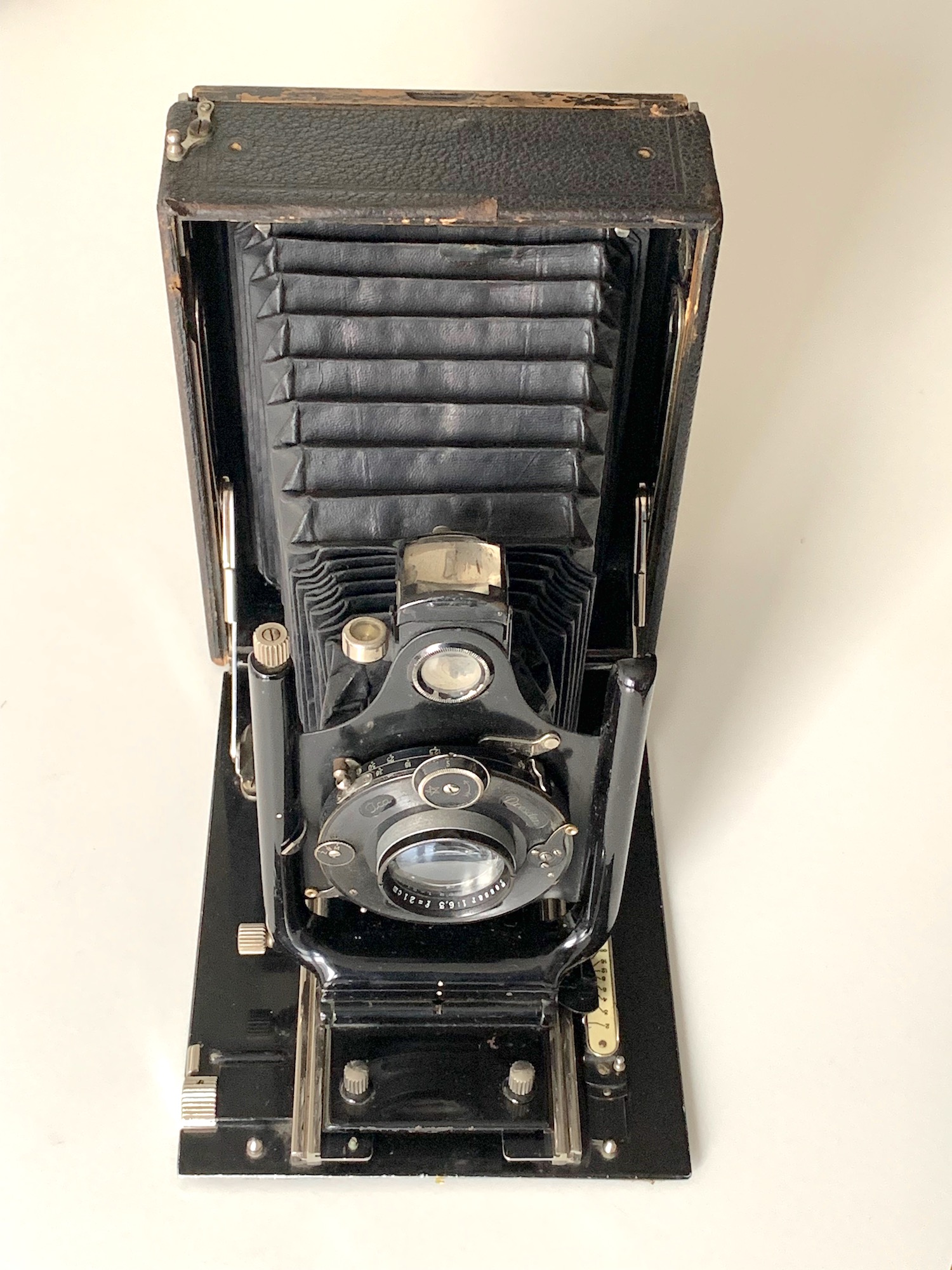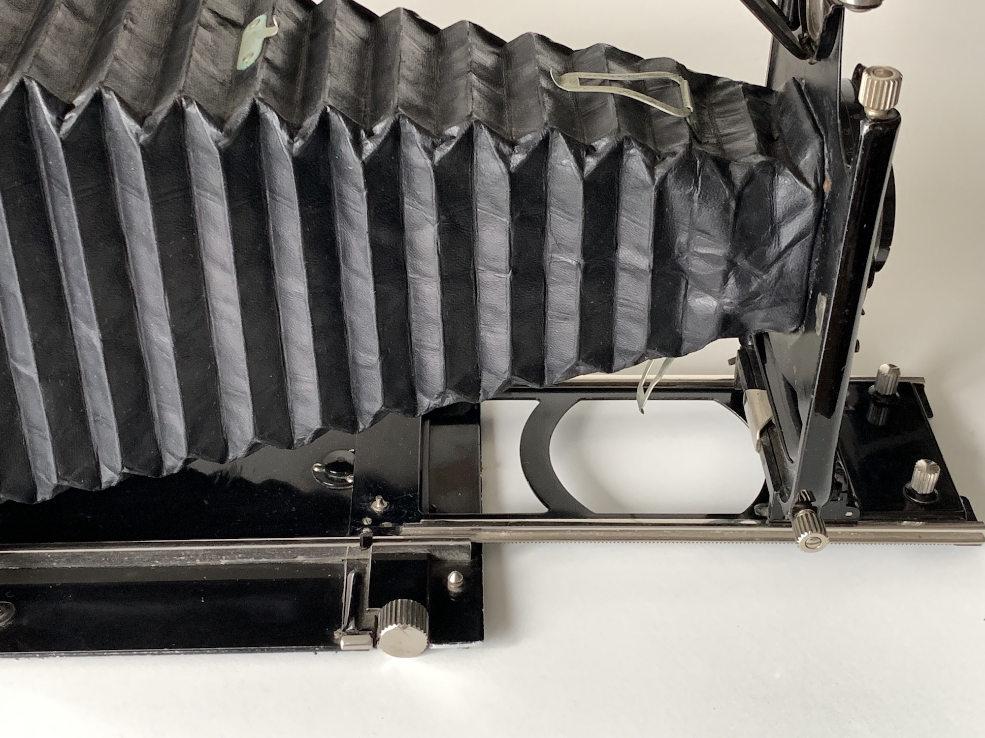 Das gezeigte Exemplar, das von einem Händler in Aarhus verkauft wurde, hat in seinen fast 100 Jahren sicherlich einiges gesehen: Das Leder ist deutlich berieben, der Balgen wurde schon einmal repariert. Der Trageriemen wurde abmontiert (vielleicht weil die Kamera ohnehin stationär benutzt wurde?) – und damit fehlt auch die Typenbezeichung. (Die vermeintlich unbezeichnete Kamera war daher recht günstig zu bekommen.) Der Verschluss läuft jedoch einwandfrei, und das Objektiv ist tadellos.