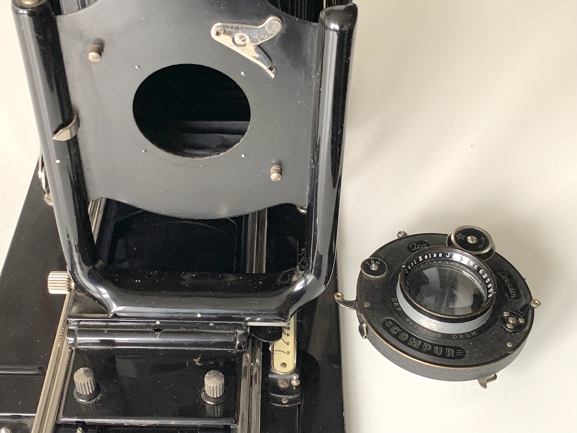 Das vorliegende Exemplar besitzt ein Tessar 6,3/21 in 2-Compur. Aufgrund der Seriennummern und des Buchstabencodes lässt sich die Kamera in das Jahr 1924 datieren.