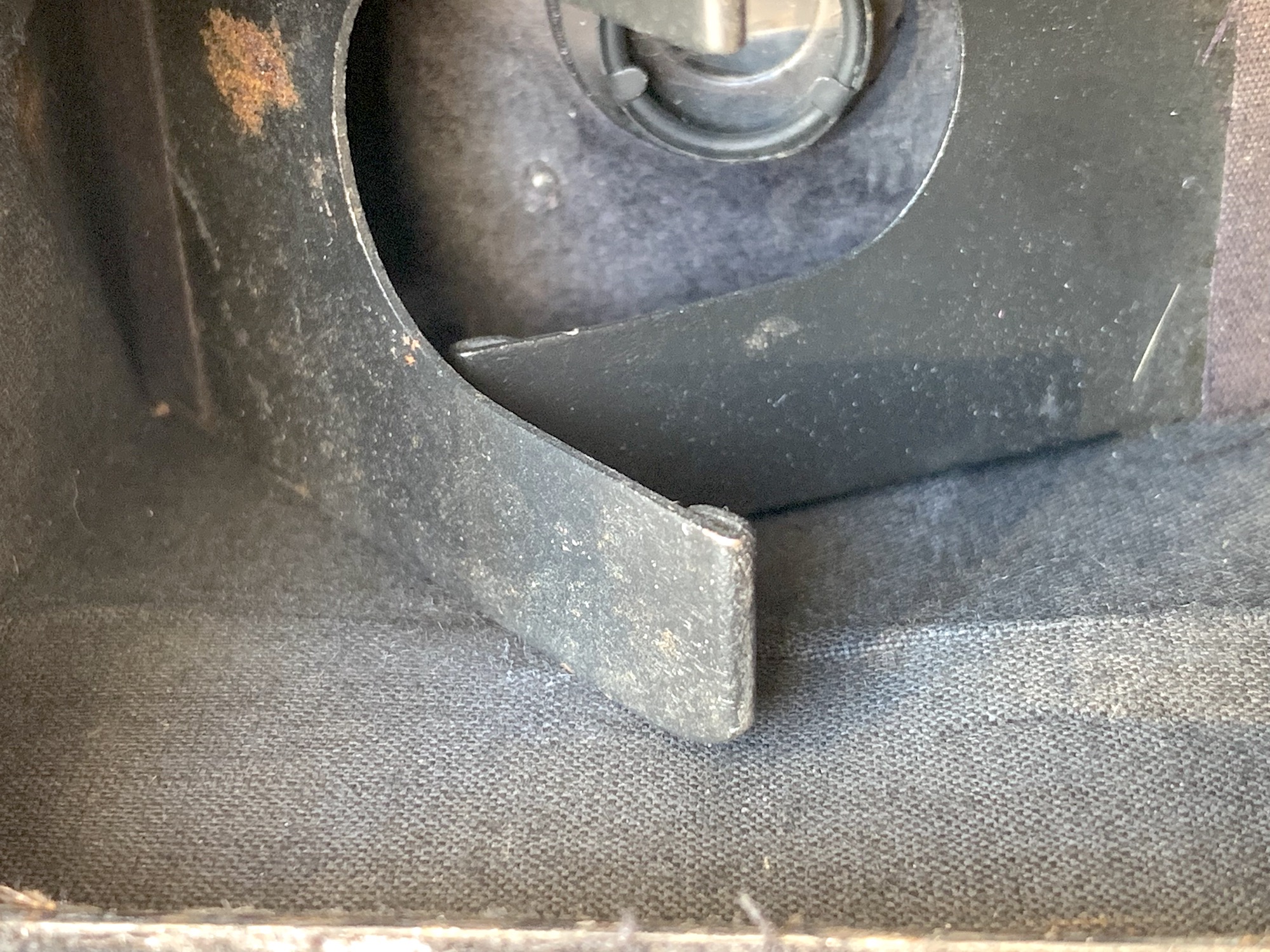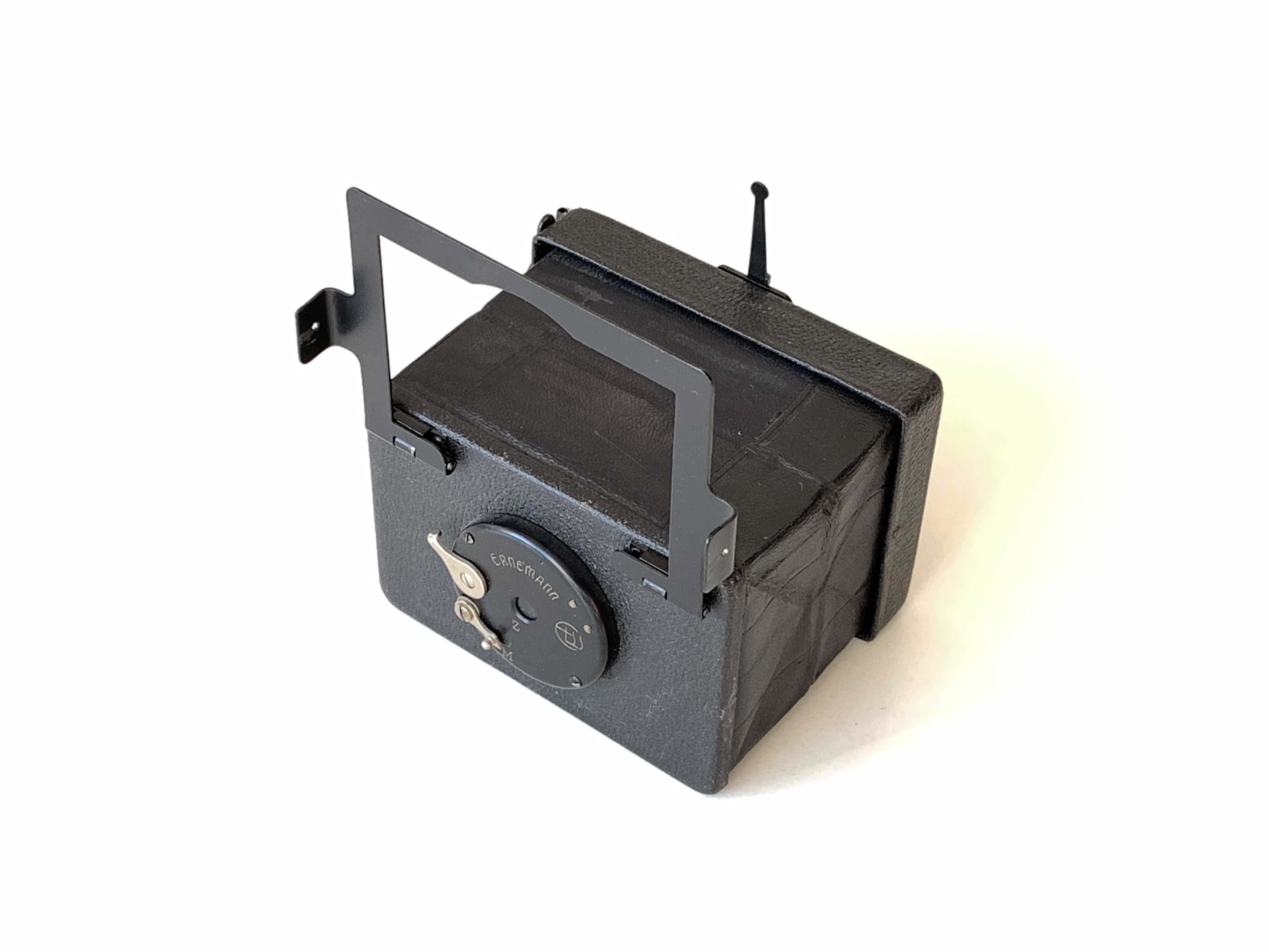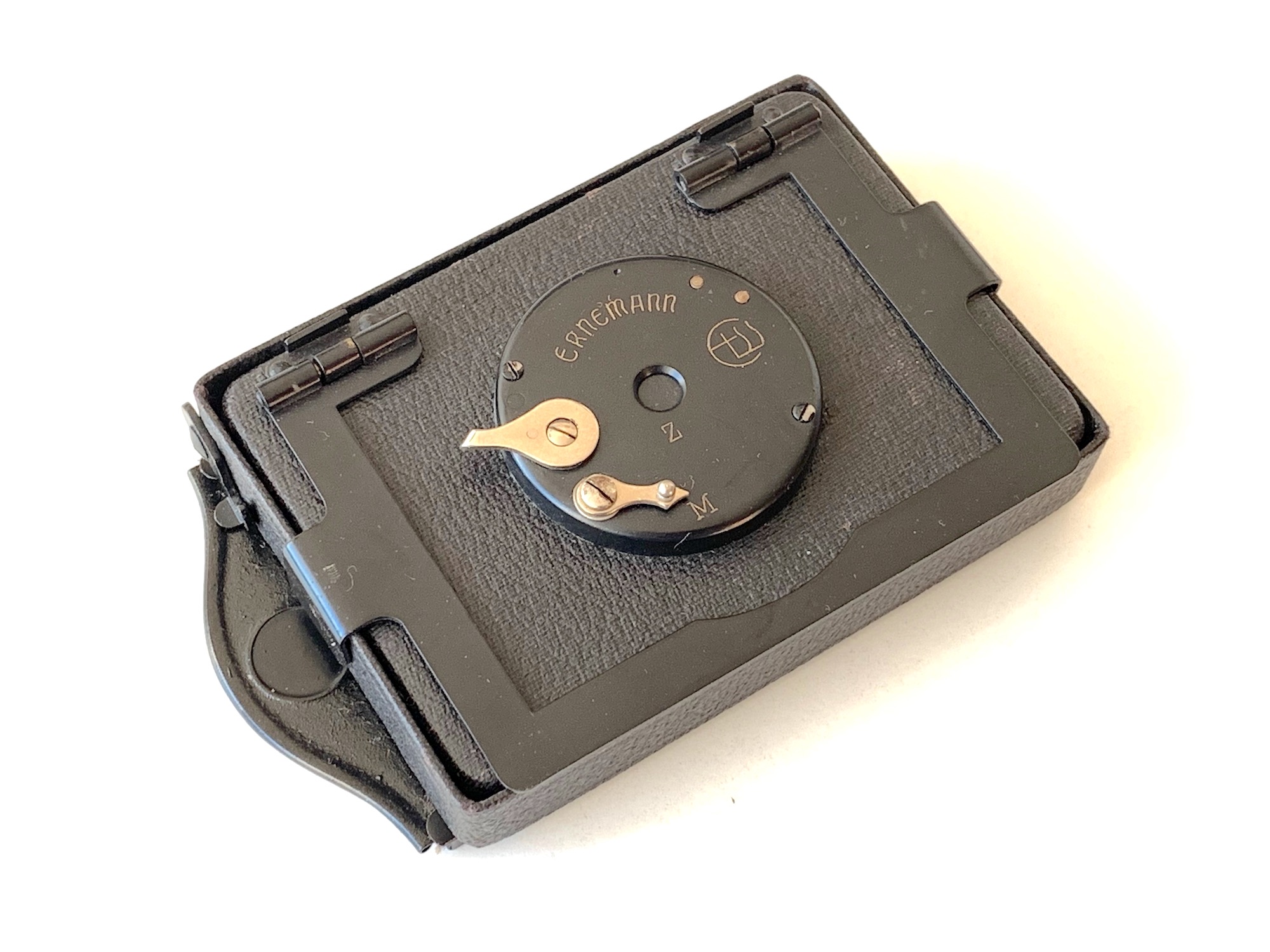 Geliefert wurde die Kamera mit einer Zelluloid-Mattscheibe, die aber oft – wie auch beim gezeigten Exemplar – verlorengegangen ist. Da es aber keinen Stativanschluss gibt, dürfte die Mattscheibe ohnehin sinnlos gewesen sein; ich vermute, dass eine derartige Kamera zumeist mit einer Packfilmkassette benutzt wurde. Auch damit ist sie immer noch kleiner als eine Rollfilmbox desselben Formats.