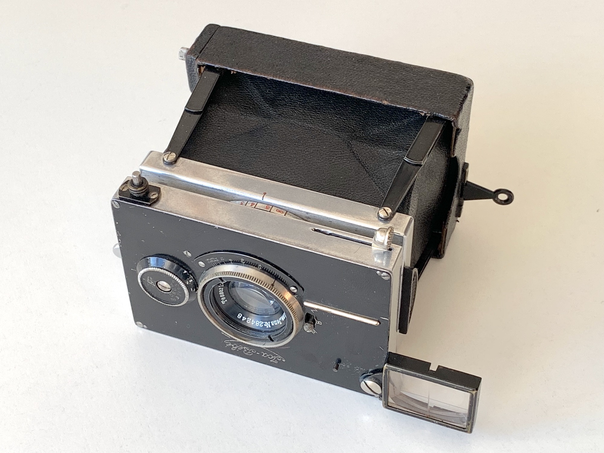 hier noch eine weitere Miniatur-Plattenkamera im Format 4,5x6 – die Ica Bébé. Es handelt sich um eine Spreizenkamera; die konstruktiven Eigenschaften teilt sie nicht zufällig mit dem Polyskop 608 (https://blende-und-zeit.sirutor-und-comp...5&thread=26) – die beiden Modellreihen wurden von der Fa. Zulauf (Zürich) bei deren Eingliederung in die Ica 1912 übernommen.
