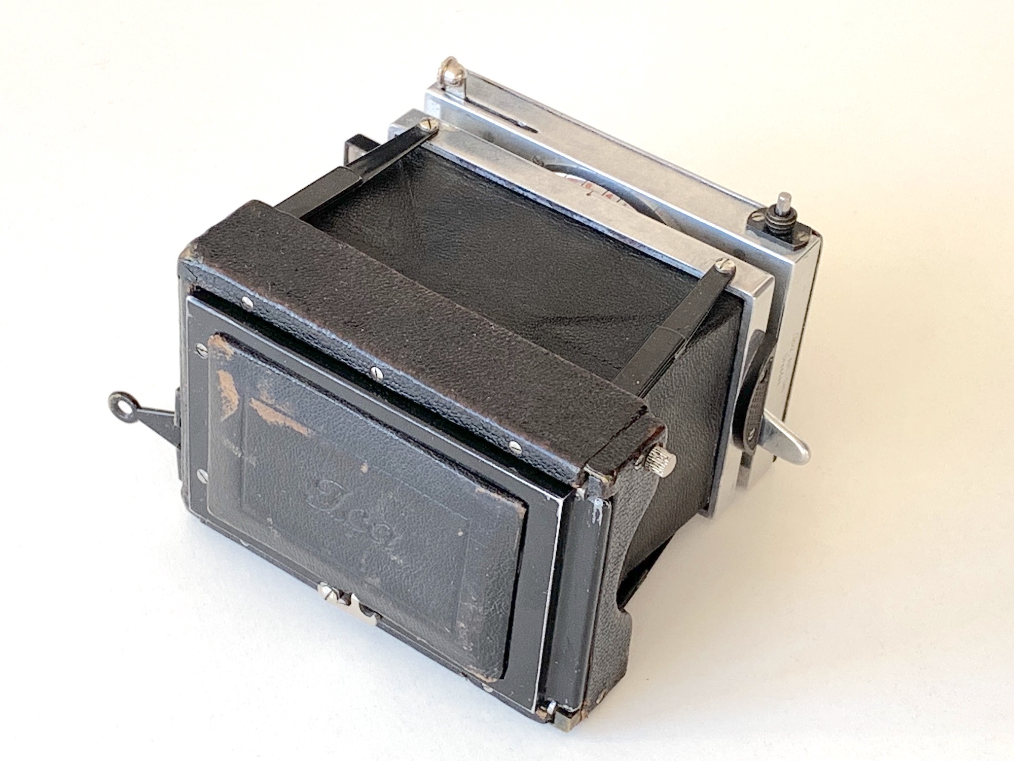 Die Entfernungseinstellung wird über einen Schneckengang vorgenommen, der über einen seitlichen Hebel betätigt wird. Die Verstellung der Blende erfolgt über einen Ring um das Objektiv; der Compound-Verschluss ist hinter der Frontplatte versteckt. Spannhebel und Auslöser finden sich auf der Oberseite des Objektivbretts. Verbaut ist ein Tessar 4,5/7,5. Der Newtonsucher liegt in Ruhestellung ebenfalls über der Frontplatte. Rückteile und Kassetten werden mittels Anlegefalz angeschlossen. Eine Verstellung des Objektivbretts ist nicht vorgesehen.
