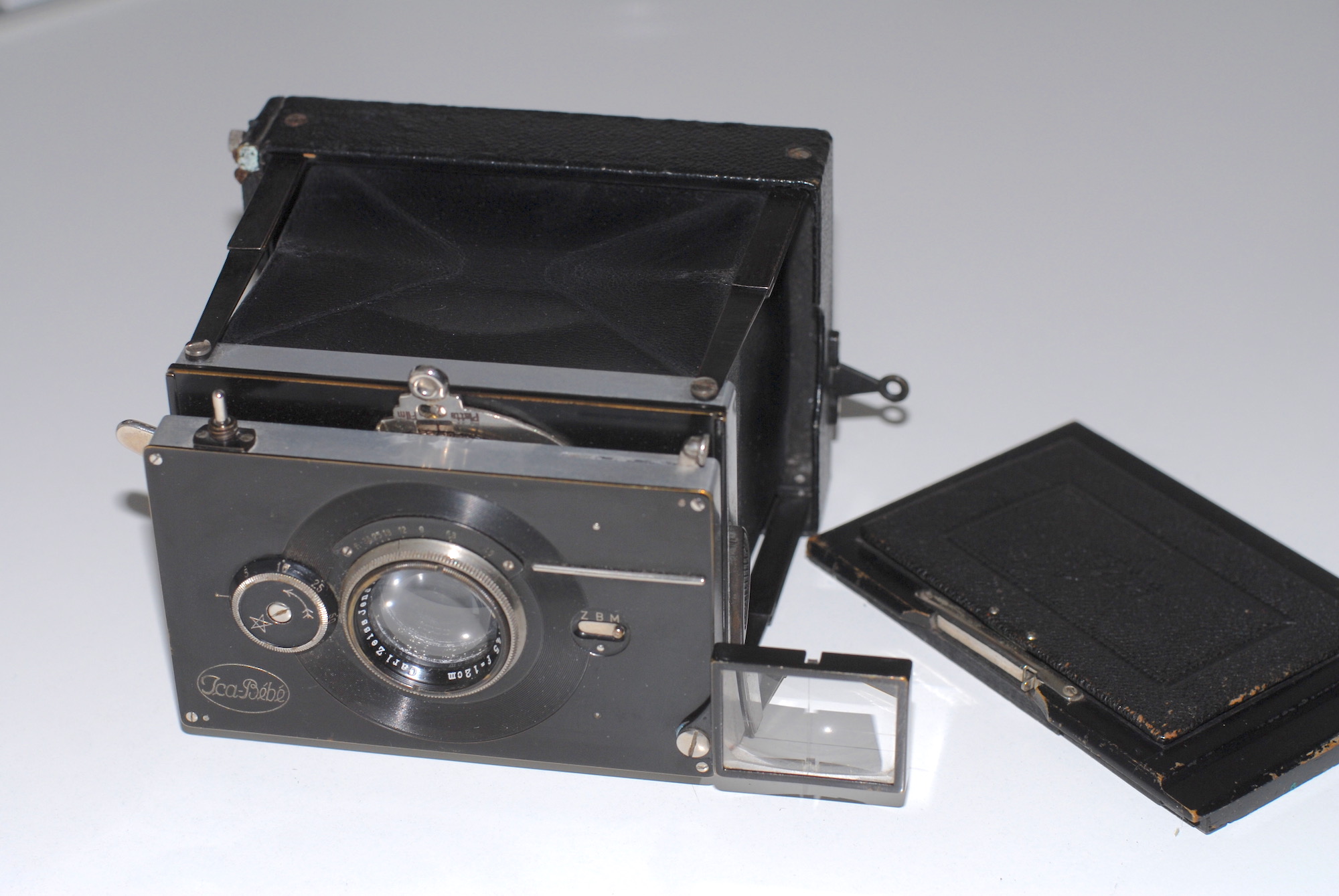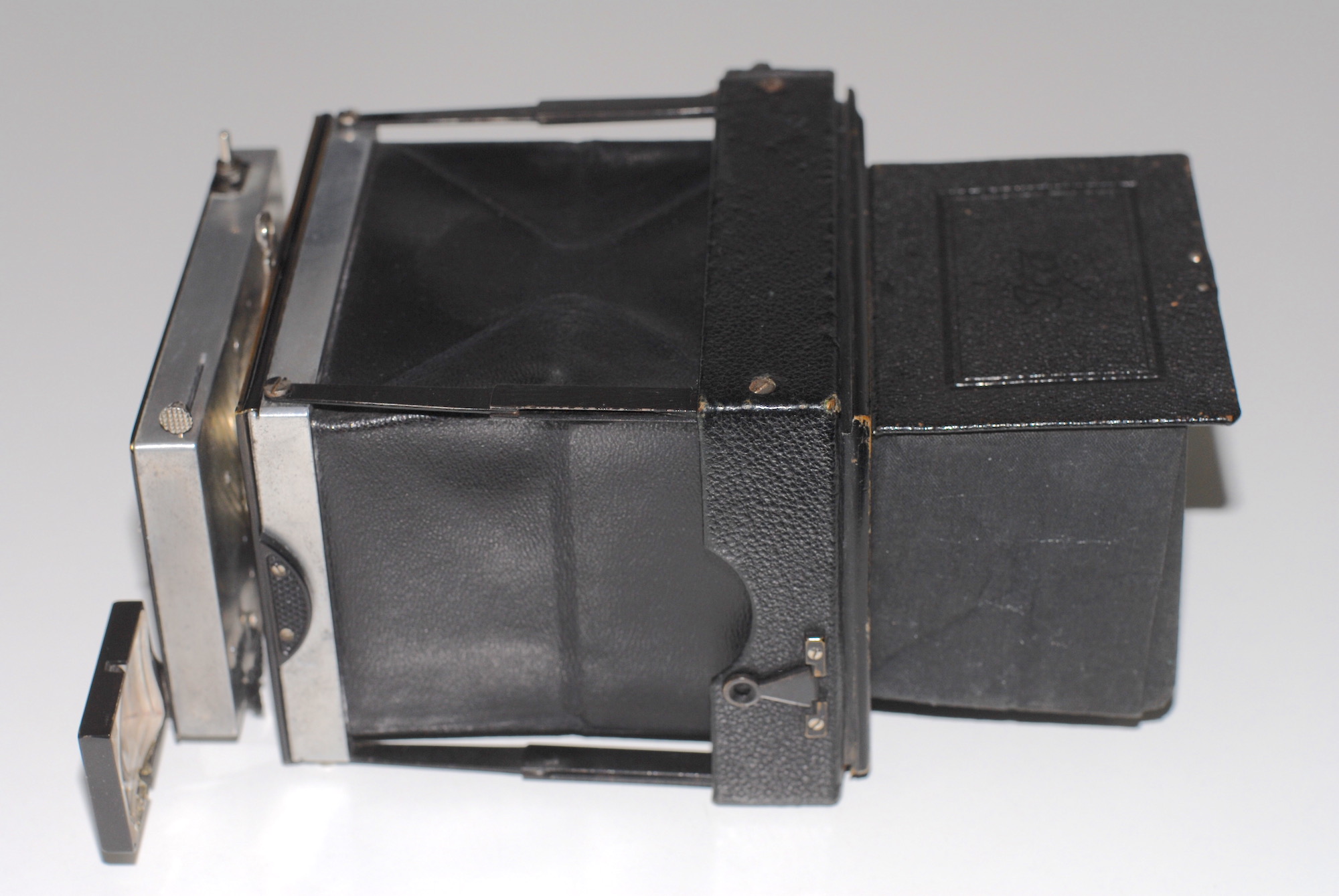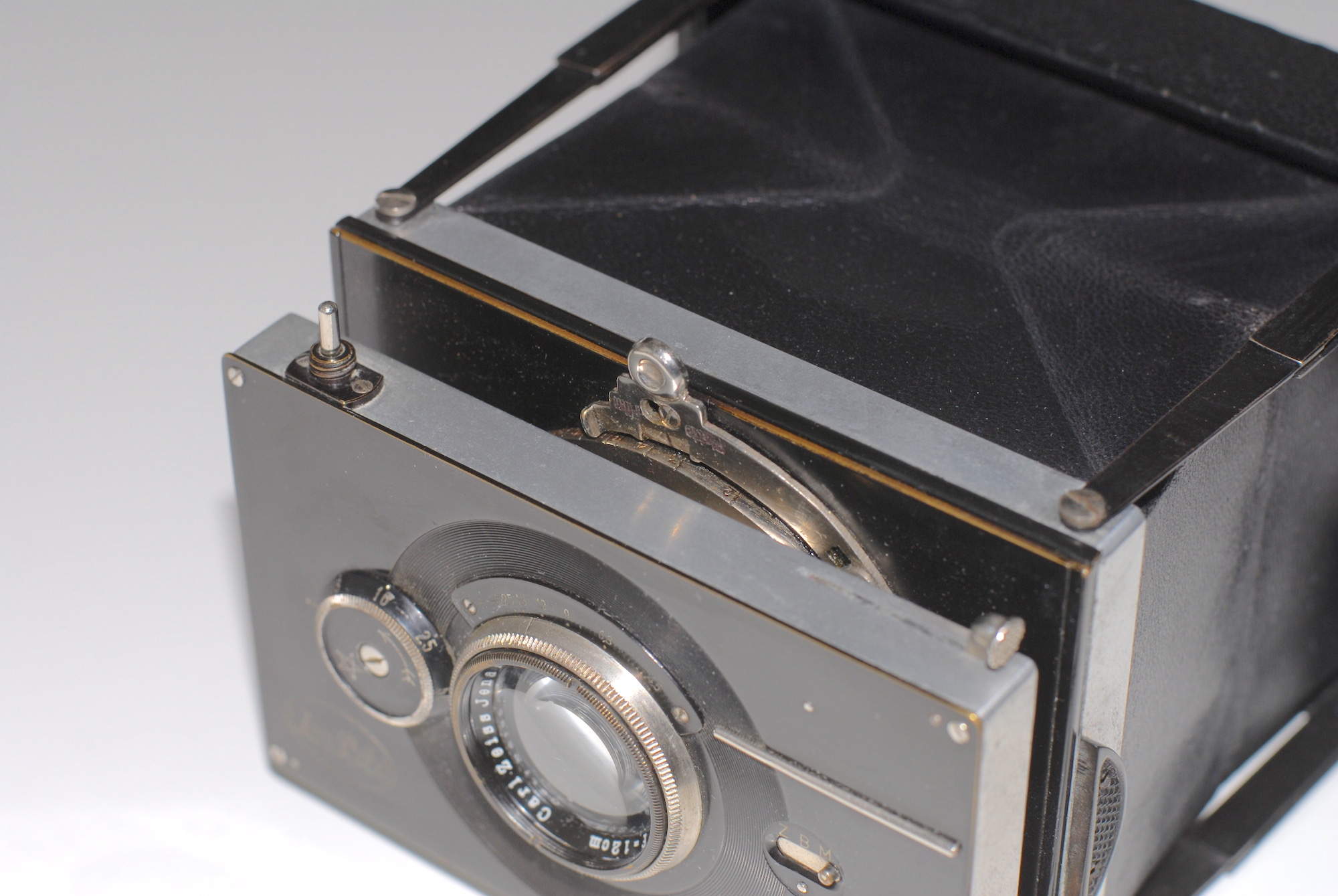 Als Vorteil von Spreizenkameras wird oft die schnelle Aufnahmebereitschaft genannt. Das trifft sicherlich auf die kleinen Modelle zu, bei denen das Vorderteil auf Knopfdruck herausschnellt (z. B. Rollfilmkameras wie Kochmann Korelle usw.). Bei diesen größeren Kameras relativiert sich das m.E. etwas: Man muss das Vorderteil mit einem gewissen Kraftaufwand herausziehen und darauf achten, dass vier Spreizen einrasten; auch bei einer gut laufenden Mechanik muss da mal nachgeholfen werden. Da bin ich mit einer Laufbodenkamera auch nicht langsamer... Und dass an der Bébé an allen Seiten etwas übersteht, macht sie nicht gerade taschenfreundlich. Das war der Vorteil der Klappkameras, der in den Katalogen durchaus herausgestellt wurde.