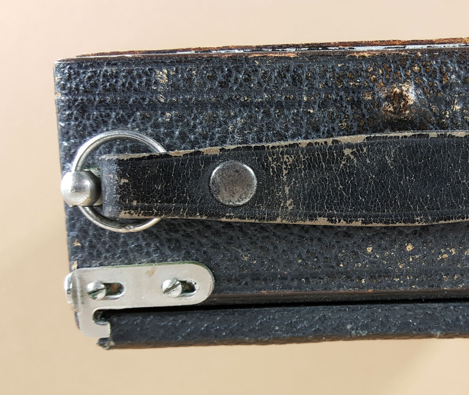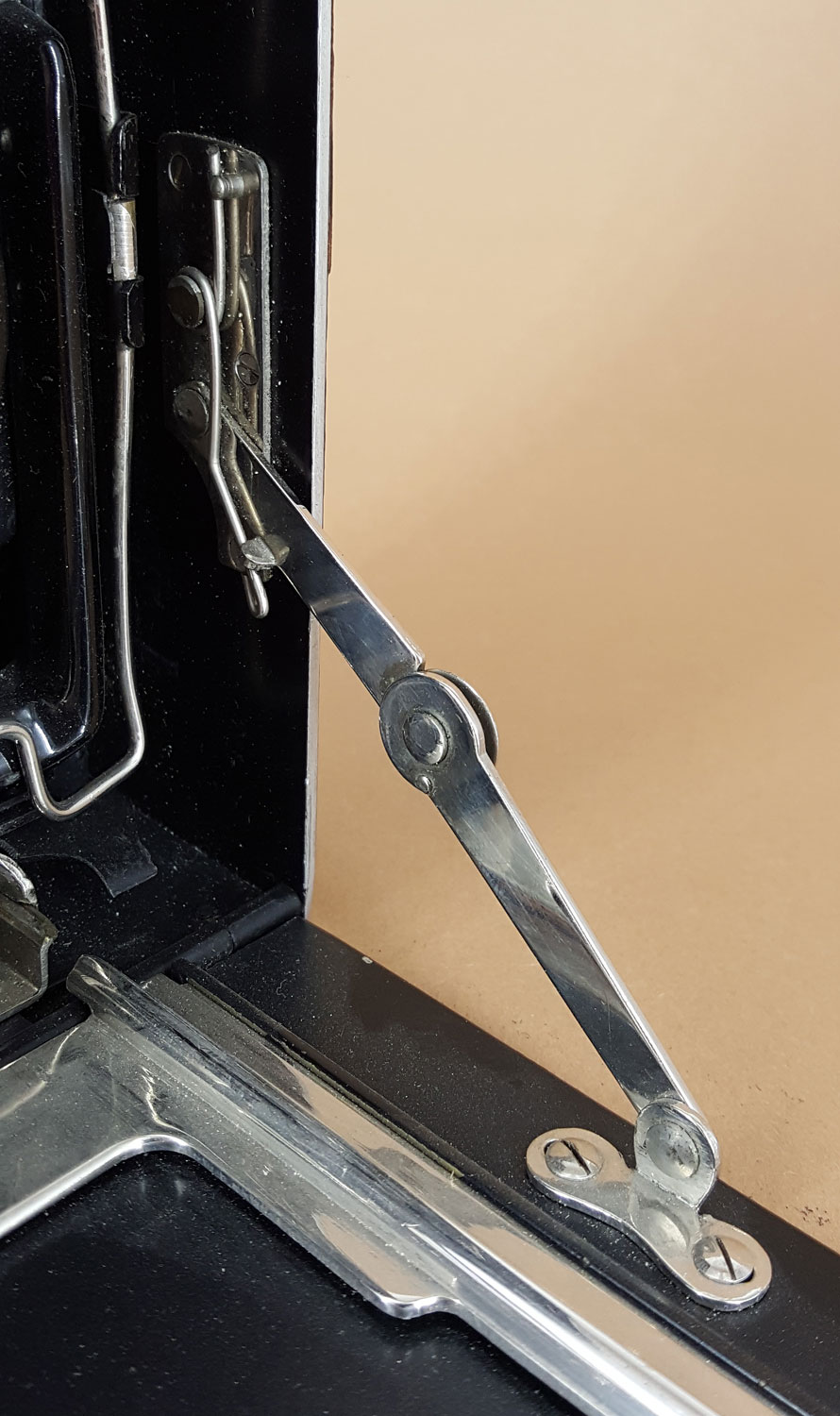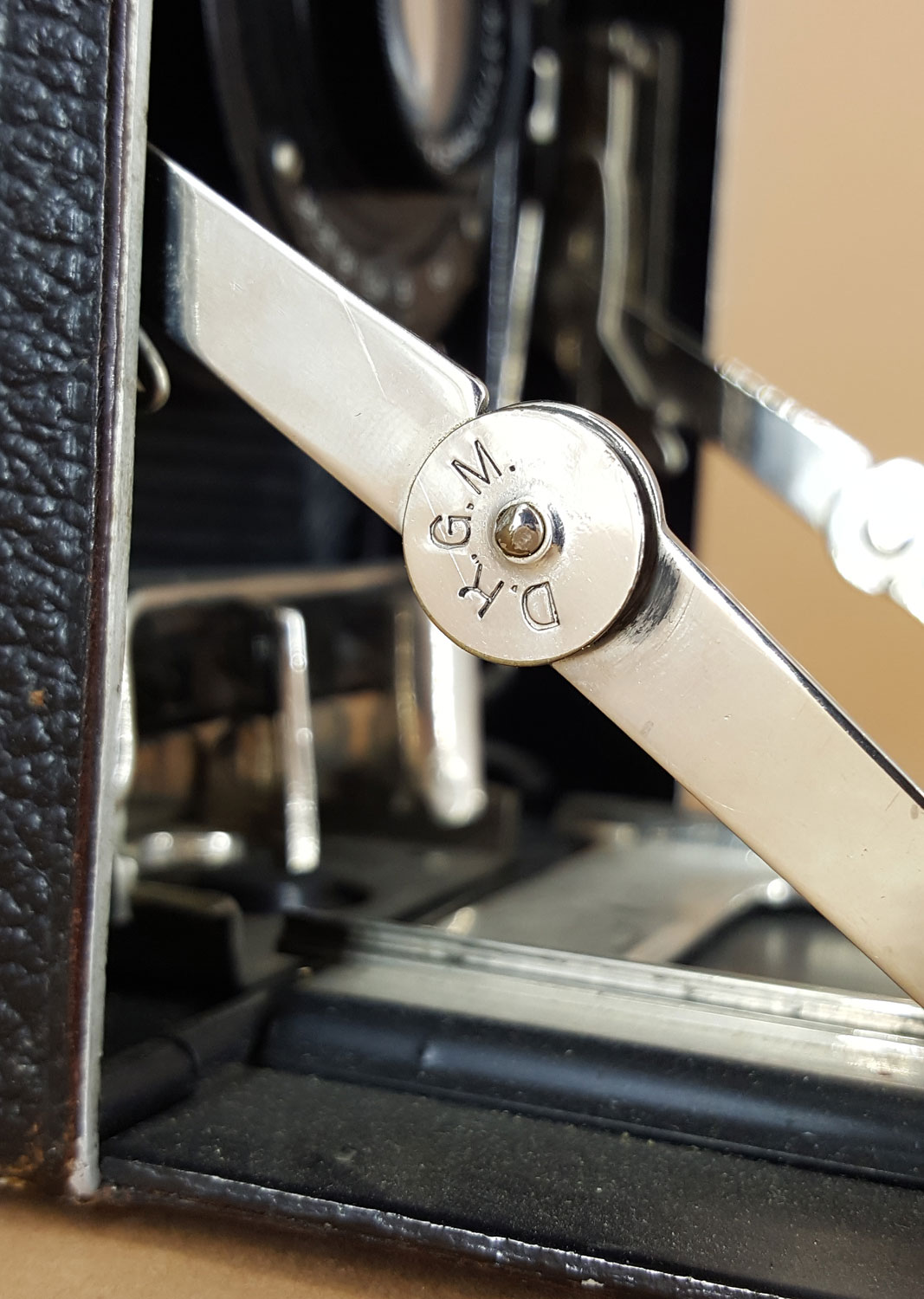 Die hohen Handhaben sind von ihrer Form und Höhe her denen an Erko-Kameras gleich. Erko hatte ebenfalls meist diese Tragegriffbefestigung in Schiffspollerform, aber in der Regel war daran auch noch der Riegel für die Rückwand befestigt. Das ist bei dieser Kamera nicht der Fall. Was überhaupt nicht zu Erko passt sind die Spreizen. Die habe ich auch sonst noch nie gesehen.