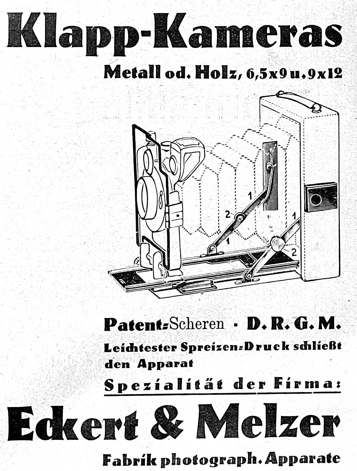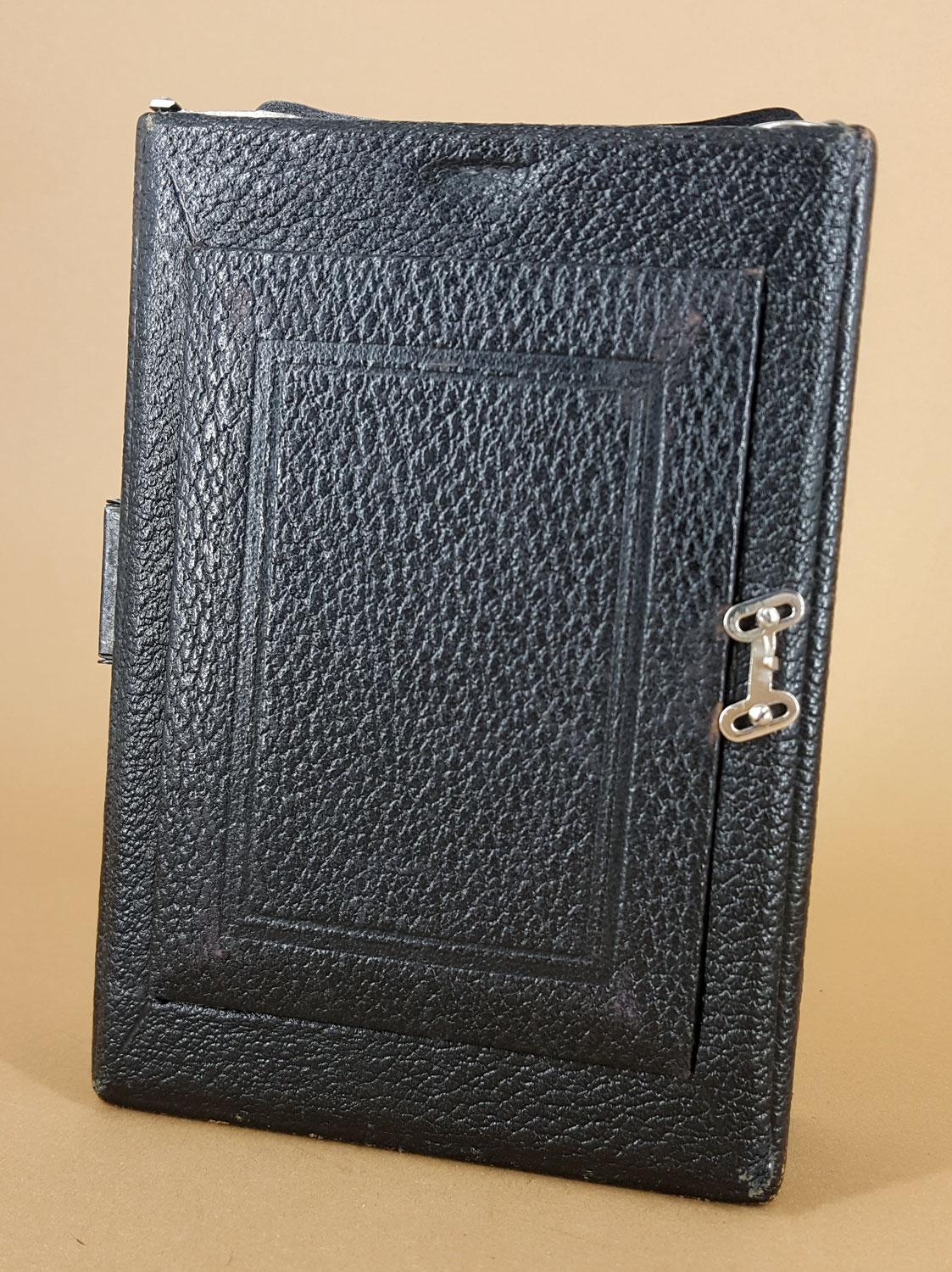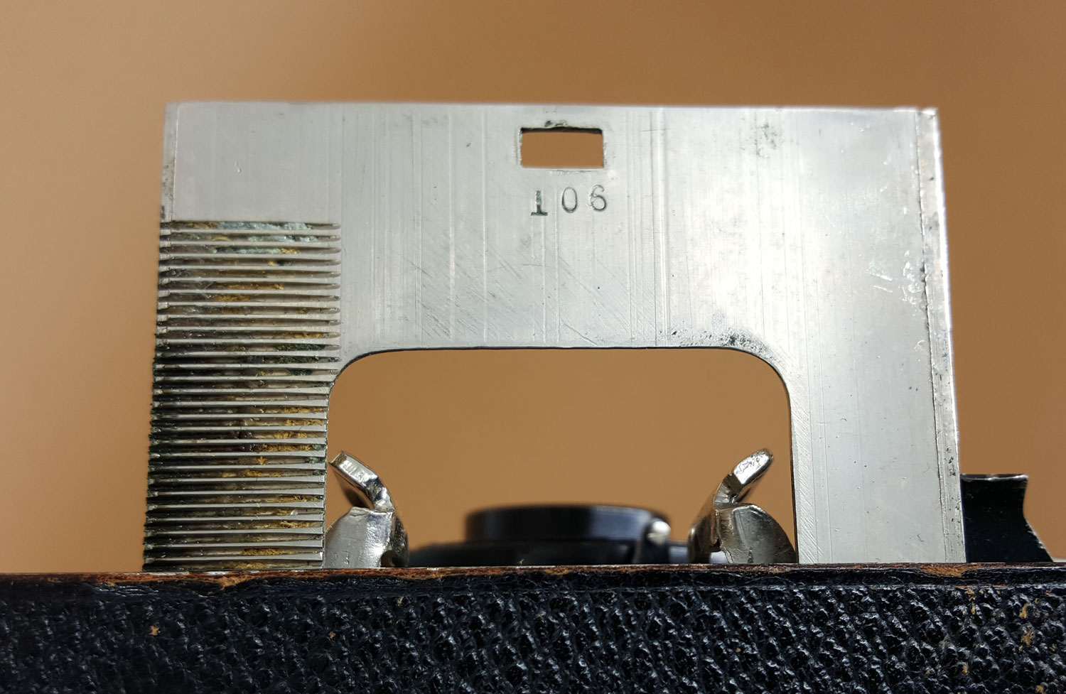 Die hohen Handhaben sind von ihrer Form und Höhe her denen an Erko-Kameras gleich. Erko hatte ebenfalls meist diese Tragegriffbefestigung in Schiffspollerform, aber in der Regel war daran auch noch der Riegel für die Rückwand befestigt. Das ist bei dieser Kamera nicht der Fall. Was überhaupt nicht zu Erko passt sind die Spreizen. Die habe ich auch sonst noch nie gesehen.