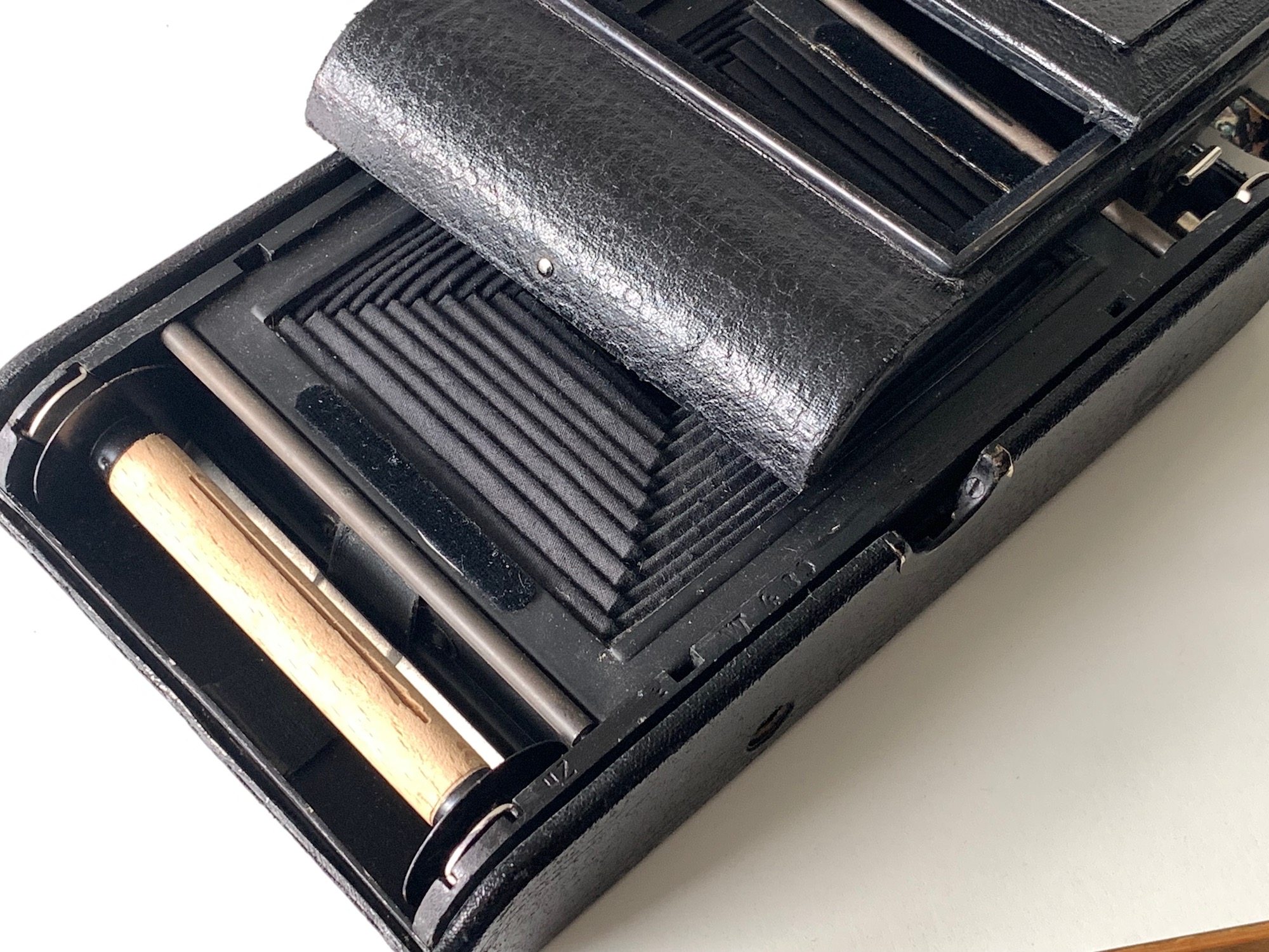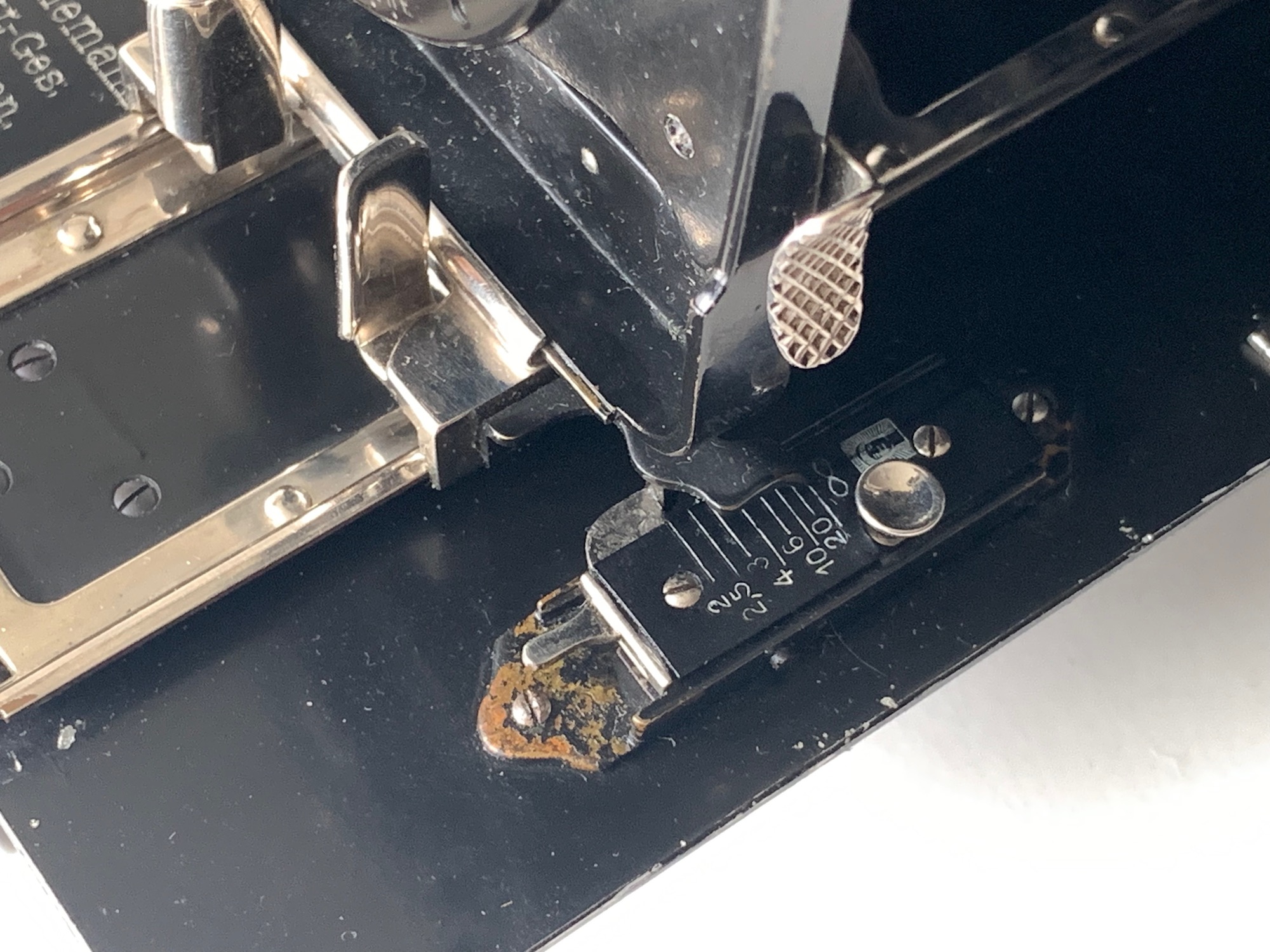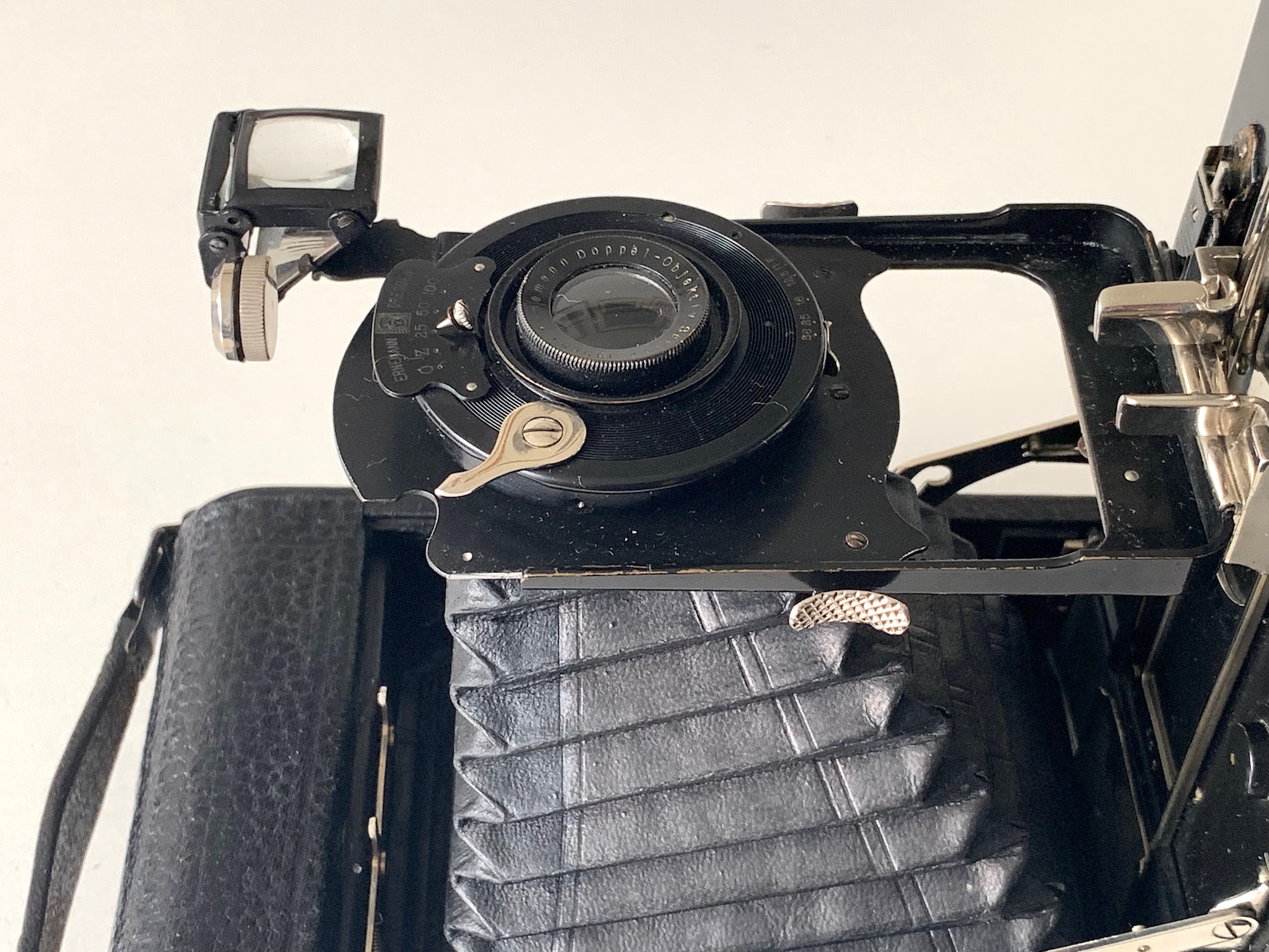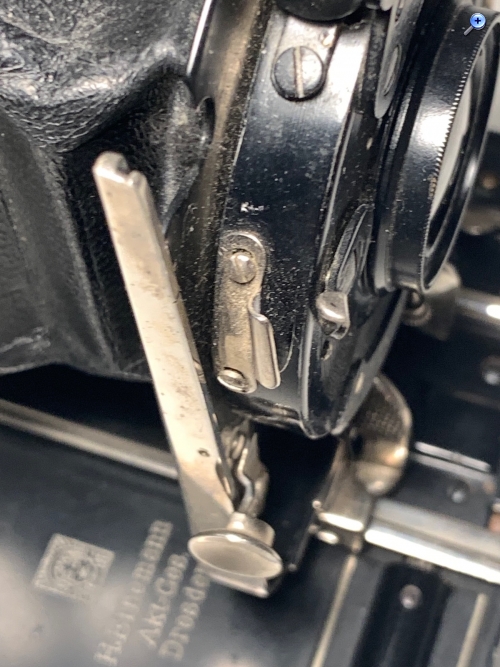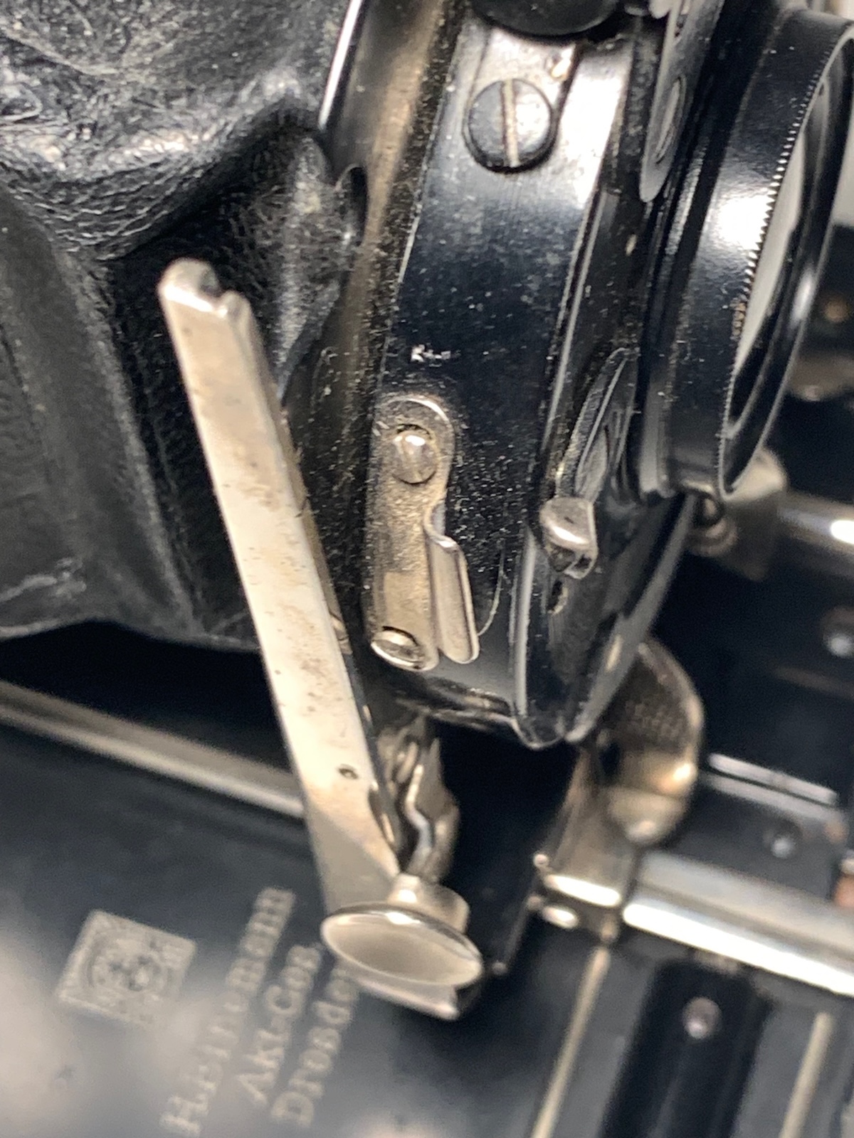 Das ist bei diesem Exemplar der Fall – verbaut ist ein Ernemann Doppel-Objektiv Serie A 1:11 in einfachem Automat (25–100). Die Entfernungseinstellung erfolgt durch Verschieben auf dem Laufboden. Der Unendlich-Anschlag lässt sich dazu ausschwenken.