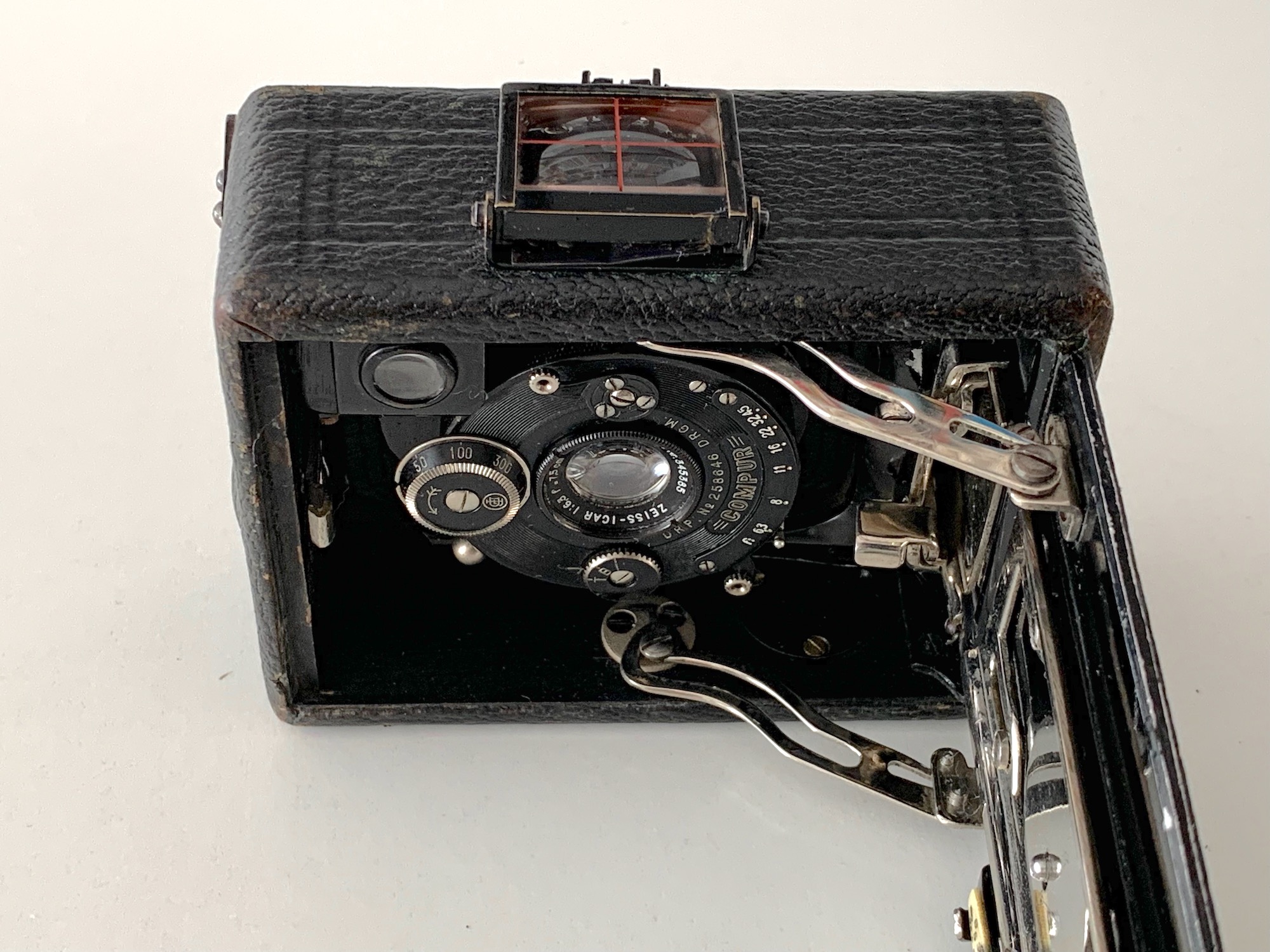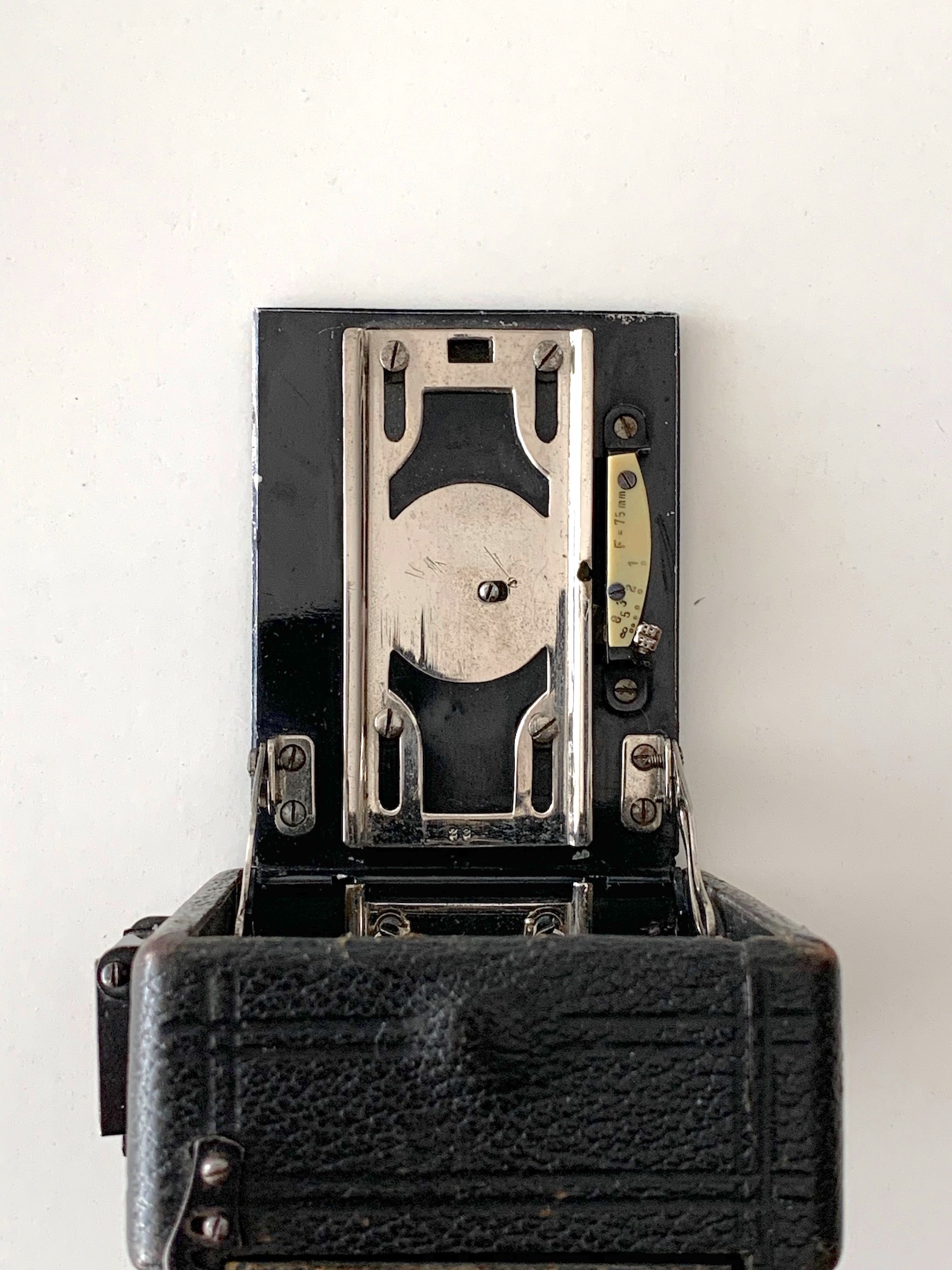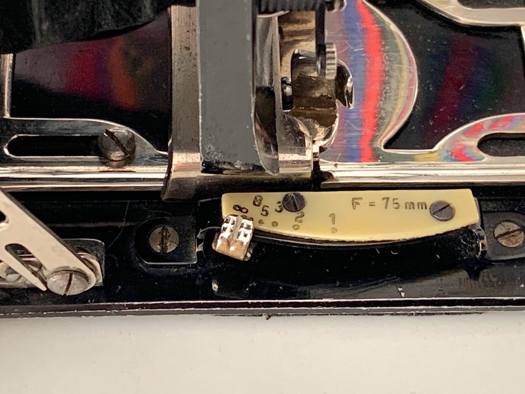 Verschluss und Objetkiv bieten keinerlei Aufschluss. Die Kamera war beim Kauf mit einem Tessar 6,3/10,5 ausgestattet, das nicht zu diesem Aufnahmeformat passt; eine Fokussierung war nicht möglich. Die Entfernungsskala ist wie zu erwarten auf 75mm ausgelegt; ich habe aus meinem Fundus ein zeitlich passendes CZJ Icar 6,3/7,5 montiert. Der Verschluss könnte der ursprüngliche sein (gem. Seriennummer 1920–22); hier fällt auf dem Betriebsartenrad die Beschriftung mit den internationalen Kürzeln "I – B – T" auf (anstelle von M – D – Z); evtl. Hinweis auf eine Exportversion? (Gekauft habe ich die Kamera von einem Pariser Händler.)