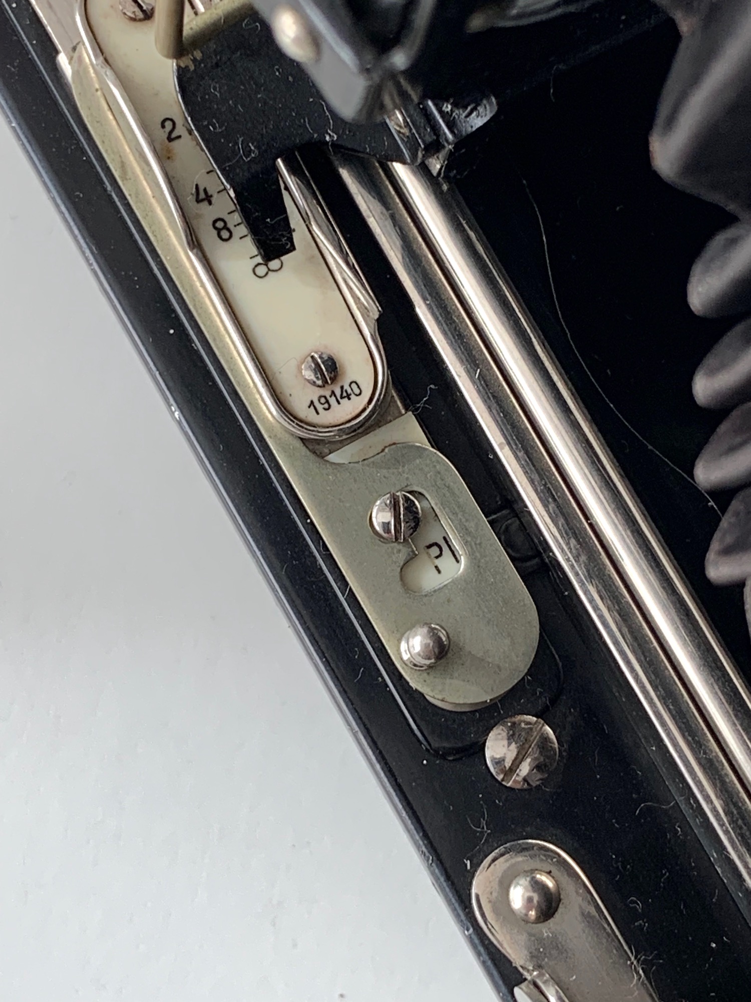 Verbaut ist ein Dominar 4,5/13,5 in Klio 1–1/100; eine seltene Bestückung, die ich in Katalogen und Ottos Carl Zeiss Camera-Register nicht gefunden habe; ob es eine individuelle Änderung auf Kundenwunsch war oder jemand den Verschluss nachträglich getauscht hat, lässt sich nicht mehr ermitteln. Angeboten wurde das Modell mit Dominar (zumeist in Compur) im Zeitraum März 1927 bis Januar 1932; das vorliegende Exemplar lässt sich aufgrund der Seriennummern in das Jahr 1930 datieren.