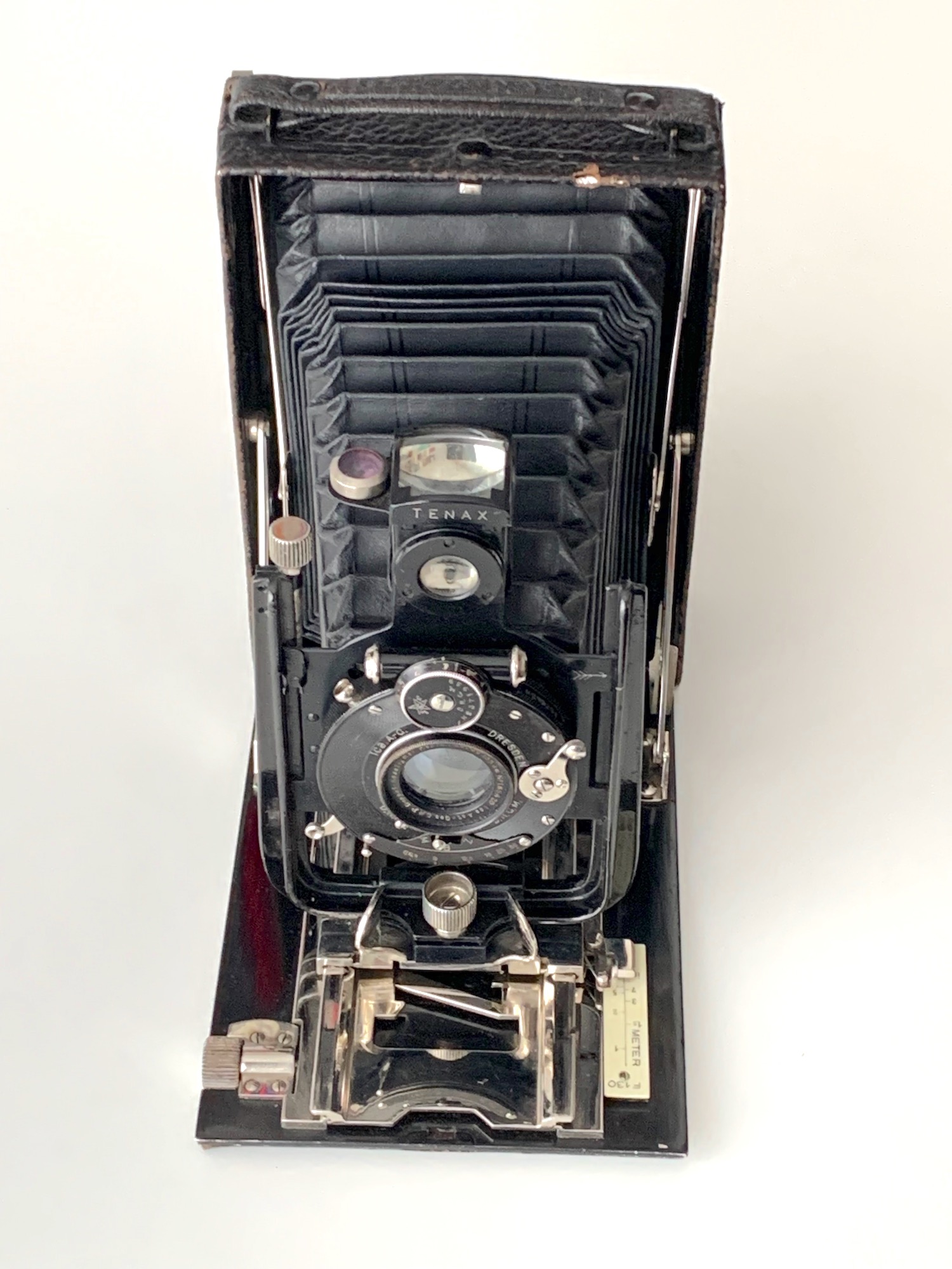 In dieser Ausführung (Balgenheber, Gestaltung der Standarte und des Brillantsuchers) habe ich die Manufok-Tenax 9x12 in keinem Katalog/Bestimmungsbuch gefunden. Immerhin: Ein Händlerkatalog von 1913 zeigt ein Modell, wie Heiko es gezeigt hat (Schraube an der Standarte, Sucher angeschraubt); die Gehäuseabmessungen stimmen überein.
