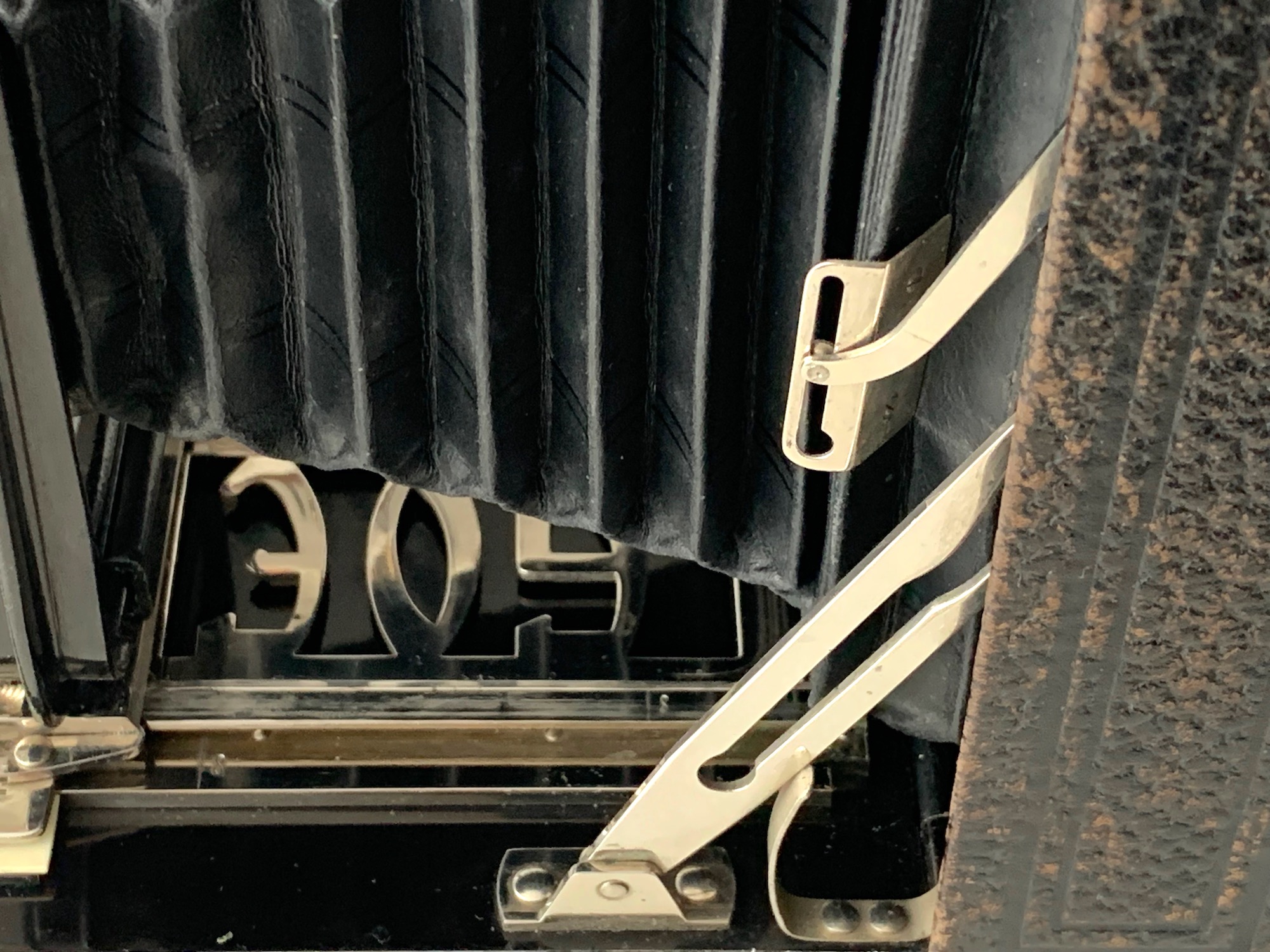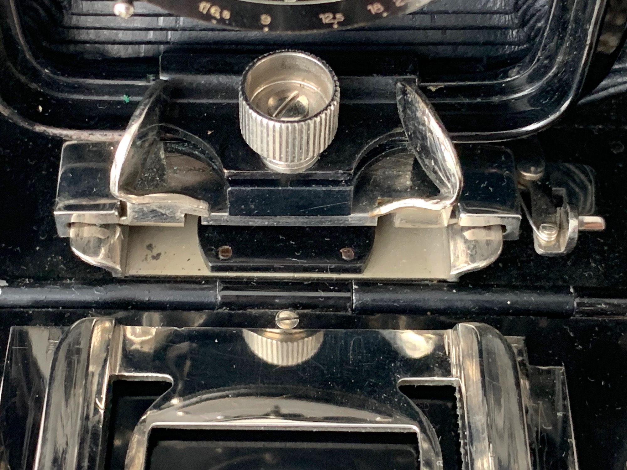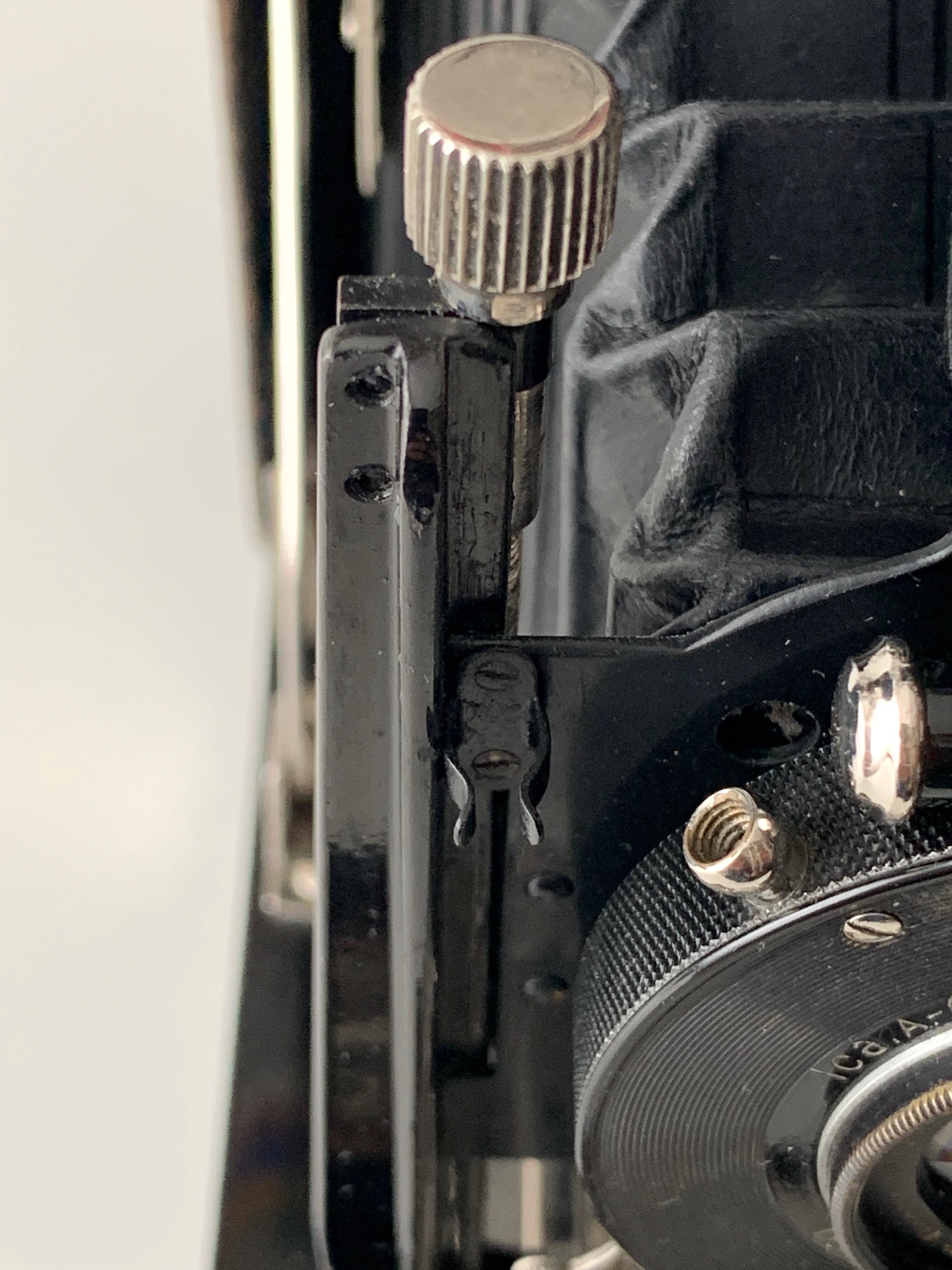 Die vertikale Verstellung erfolgt über einen Spindeltrieb; die dicke Arretierungsschraube an der Frontseite, die das Vergleichs-Expl. hat, fehlt hier. Am Rand des Objetkivbretts befindet sich eine Klammer, vermutlich eine Halterung für den Drahtauslöser?