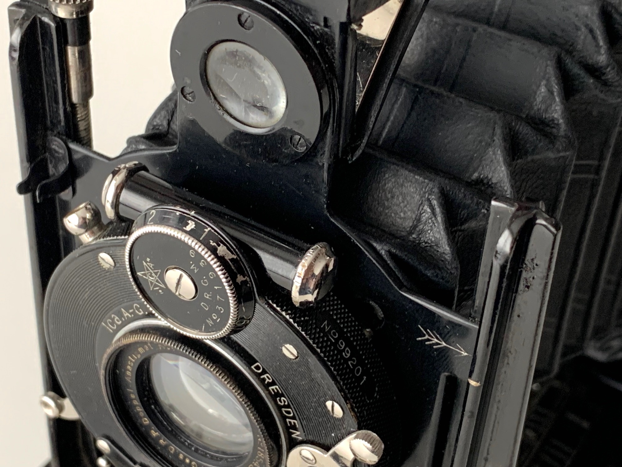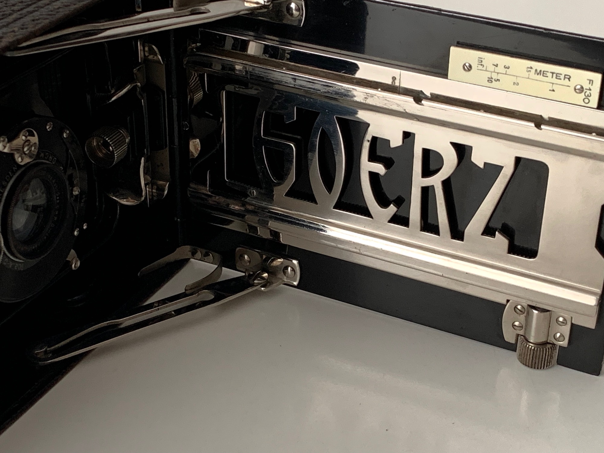 Die Kamera wurde ohne Verschluss geliefert, allerdings mit dem ursprünglich vorhandenen Goerz Syntor 6,8/130 – auf 130 mm ist auch die Entfernungsskala ausgelegt. Gemäß Seriennummer dürfte dieses Objektiv im Zeitraum 1915–1920 hergestellt worden sein. Ich habe einen zeitlich passenden 0-Compound mit einem Ica Hekla 6,8/13,5 (das Syntor passt nicht hinein) eingebaut (eine solche Bestückung ist vorstellbar, zumal die Kameras damals auch ohne Objektiv bestellt und mit vorhandenen Objektiven ausgerüstet werden konnten).